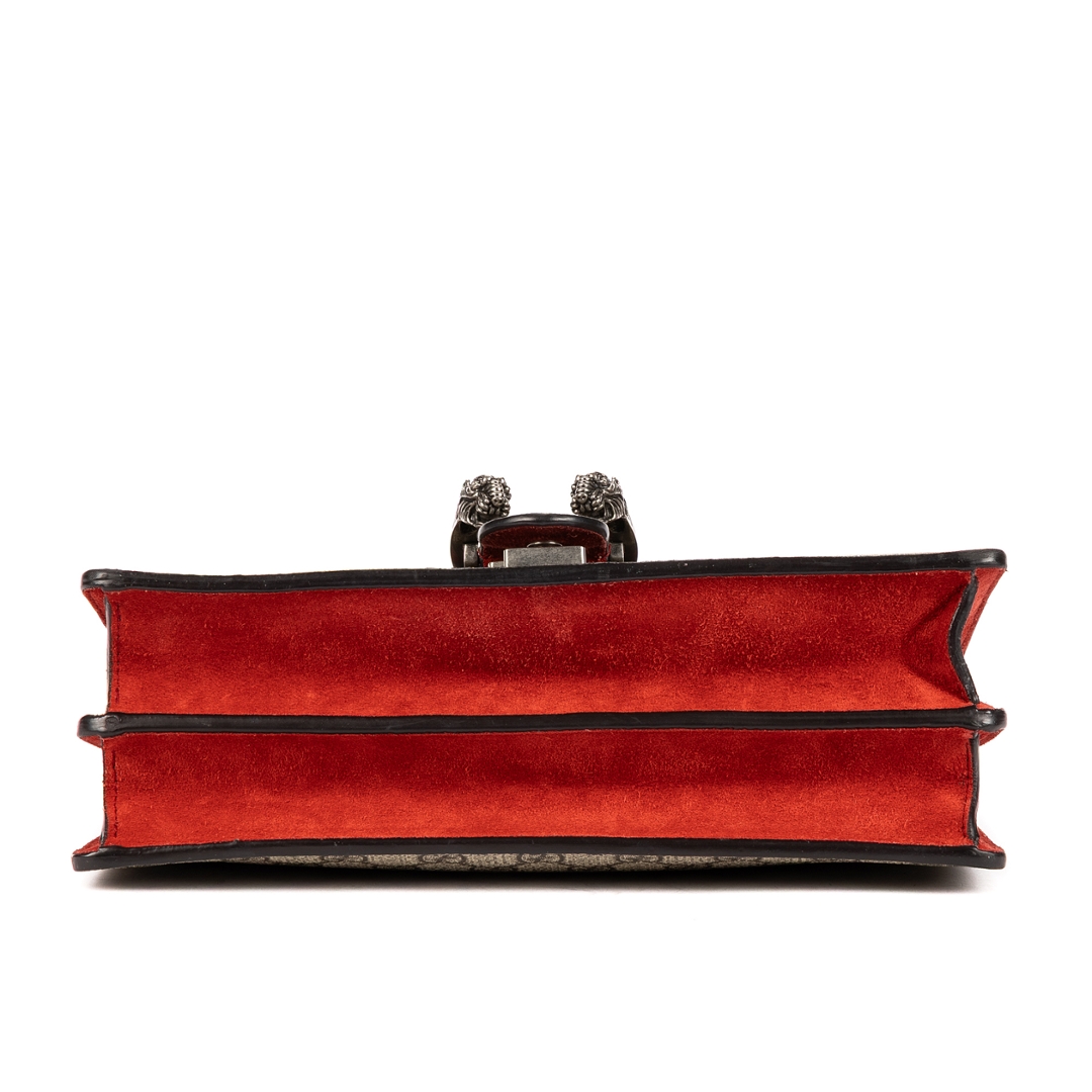 A vintage Gucci beige and red coated canvas Dionysus bag, featuring the house’s iconic GG Supreme monogram in a timeless neutral palette. The structured silhouette is enhanced by rich red suede panels, creating a bold contrast that defines its distinctive look. At the centre, the signature tiger head spur closure in aged silver-tone hardware delivers an instantly recognisable and striking focal point.