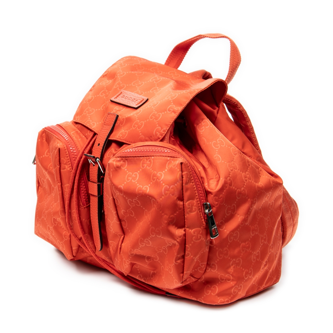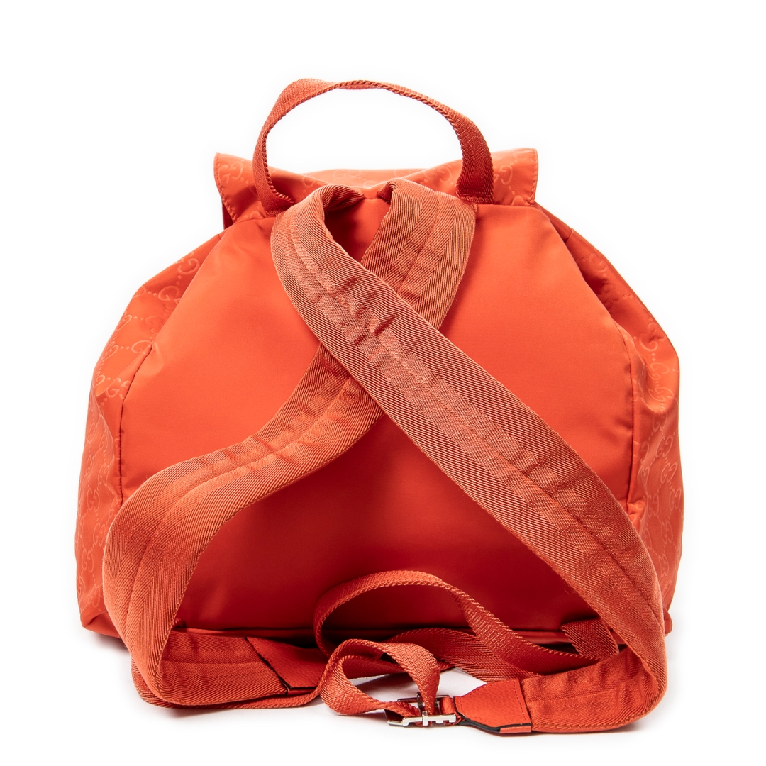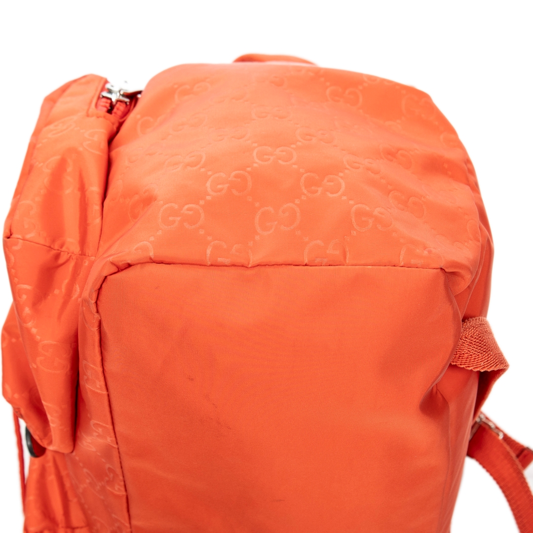 A vintage Gucci orange canvas Double Front Pocket Backpack with a certificate of authenticity, Approximately 28cm height, 31cm width.