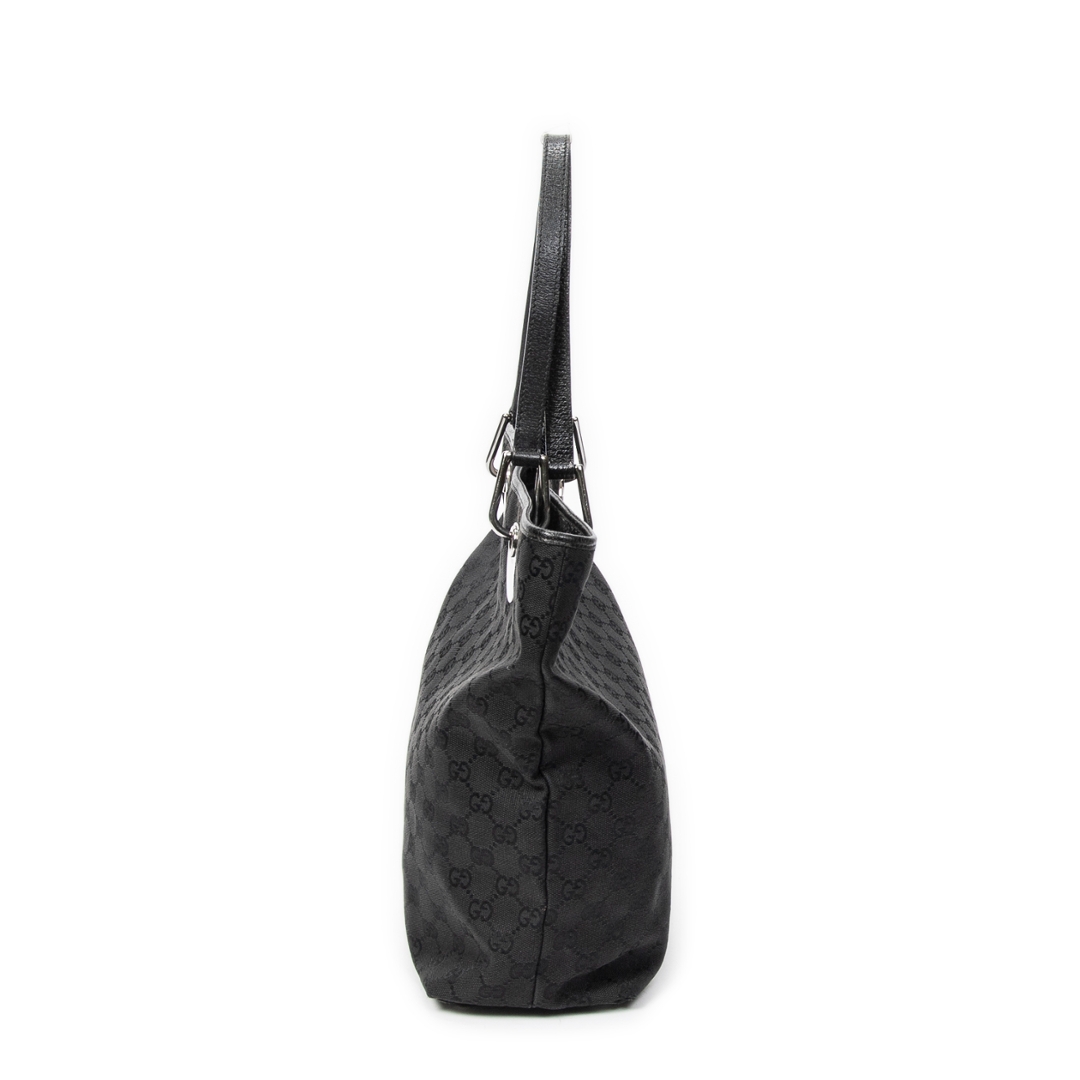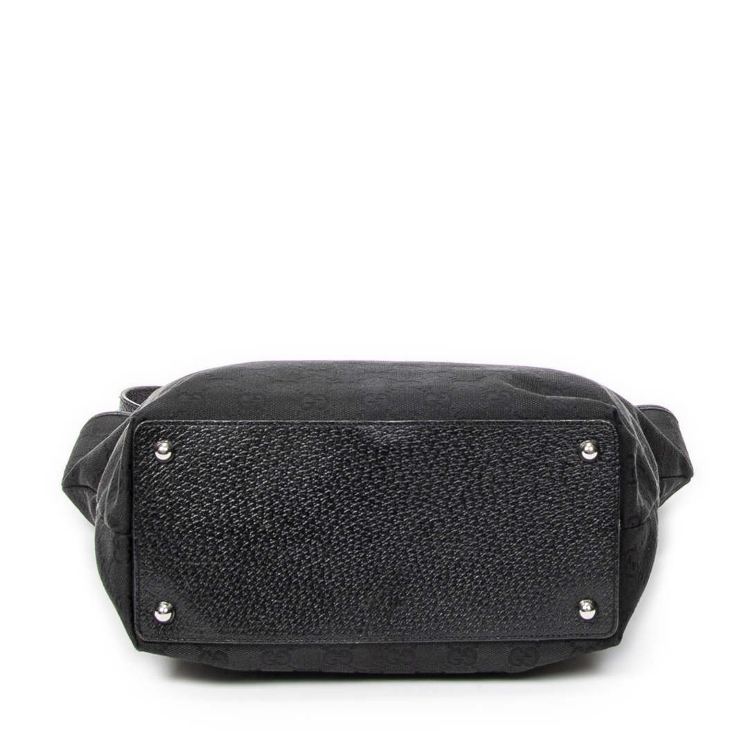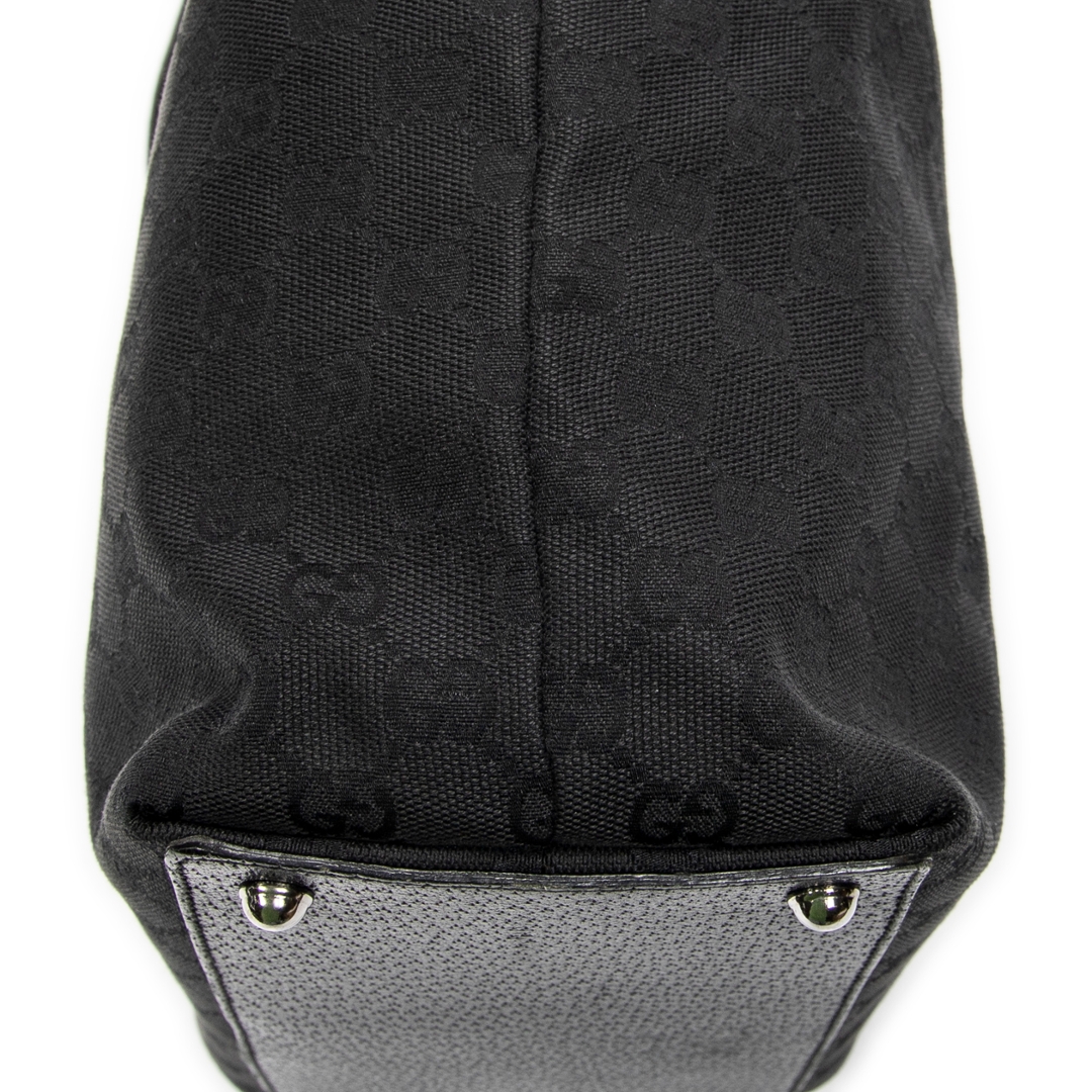 A vintage Gucci black canvas Eclipse Tall Tote bag, featuring the house’s signature GG monogram subtly woven throughout the fabric. The tall, structured silhouette is complemented by tonal leather handles and sleek silver-tone hardware, including the distinctive circular Gucci accents at the handle base. The understated all-black design delivers a refined and effortlessly versatile look.