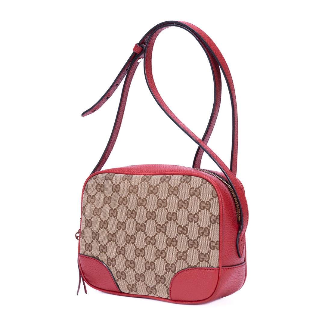A vintage Gucci red/beige calf leather GG Canvas Bree Camera bag with a certificate of authenticity, Approximately 16cm height, 21cm width.