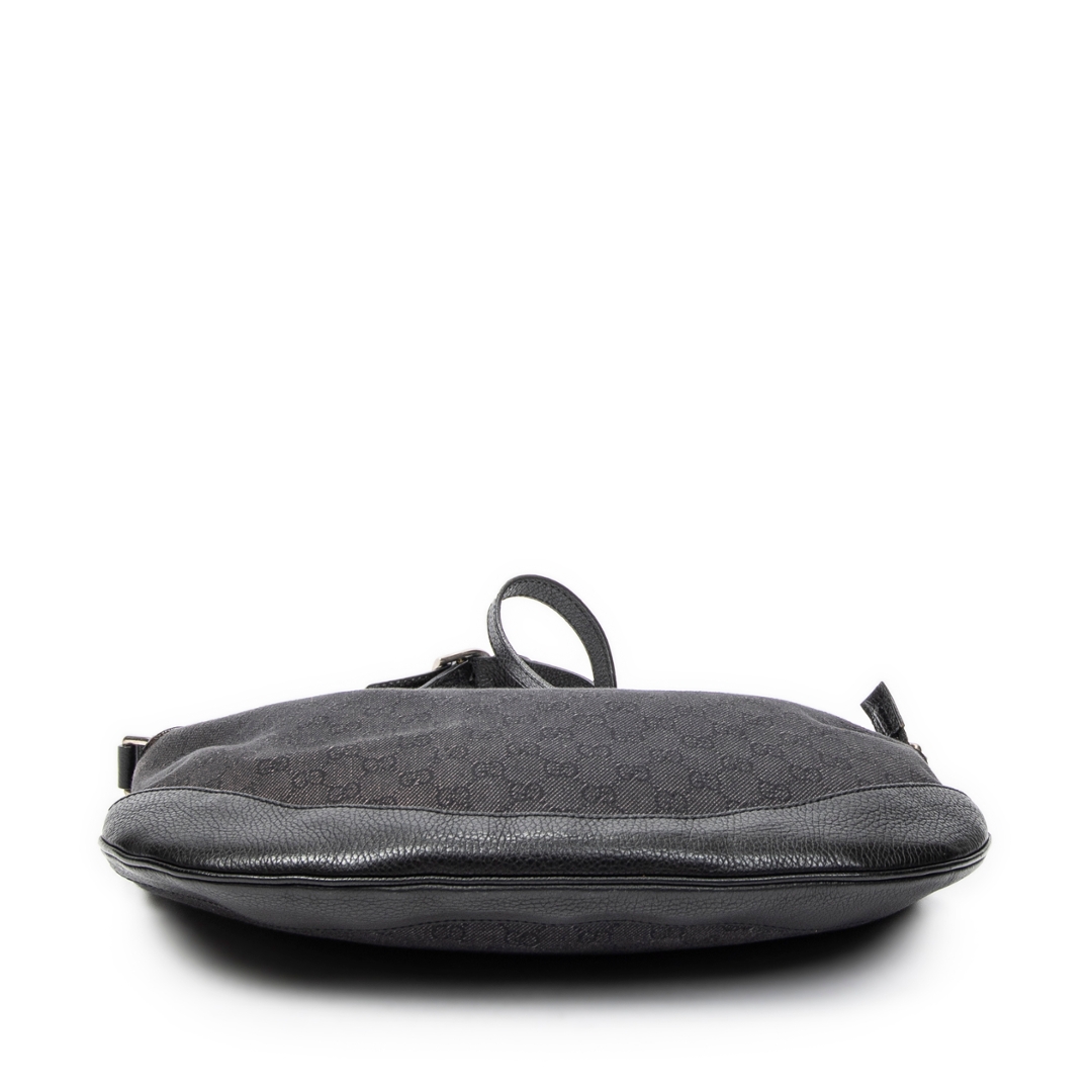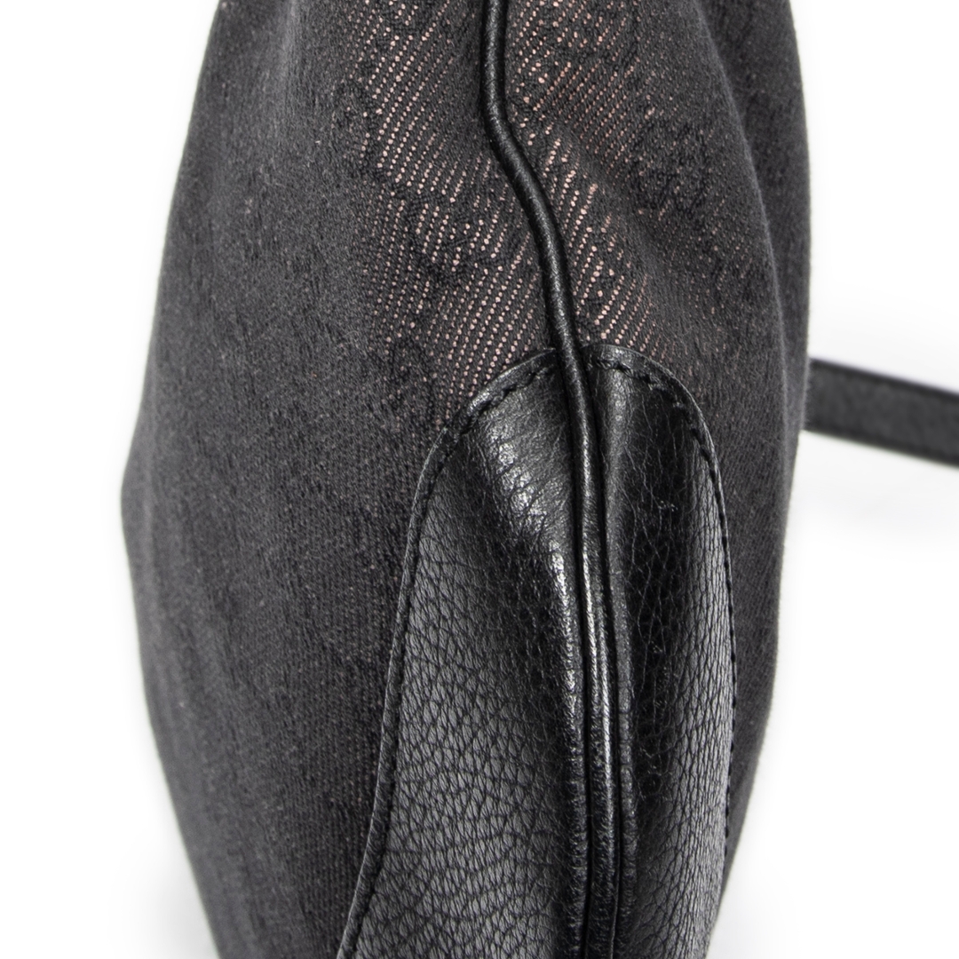 A vintage Gucci black canvas Half Moon Messenger bag, featuring the house’s signature GG monogram subtly woven throughout the fabric. The curved half-moon silhouette is complemented by tonal leather trim, creating a sleek and contemporary profile while maintaining Gucci’s classic aesthetic. Clean lines and understated detailing give the piece a refined and versatile finish.