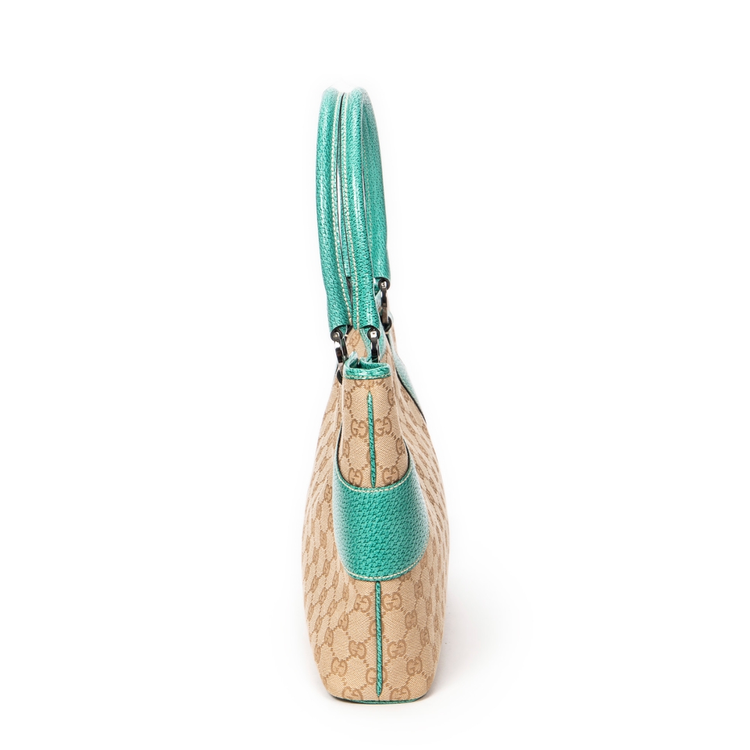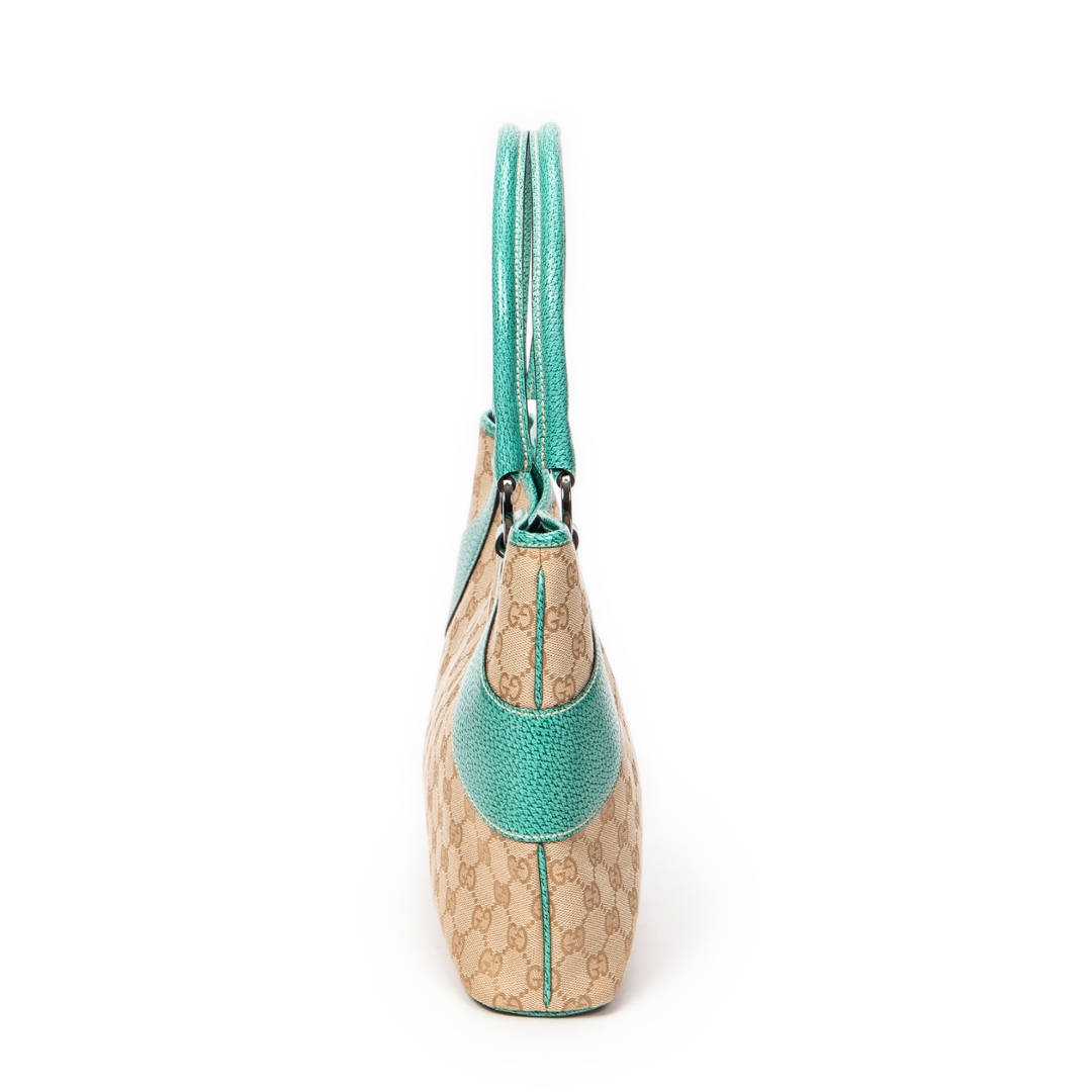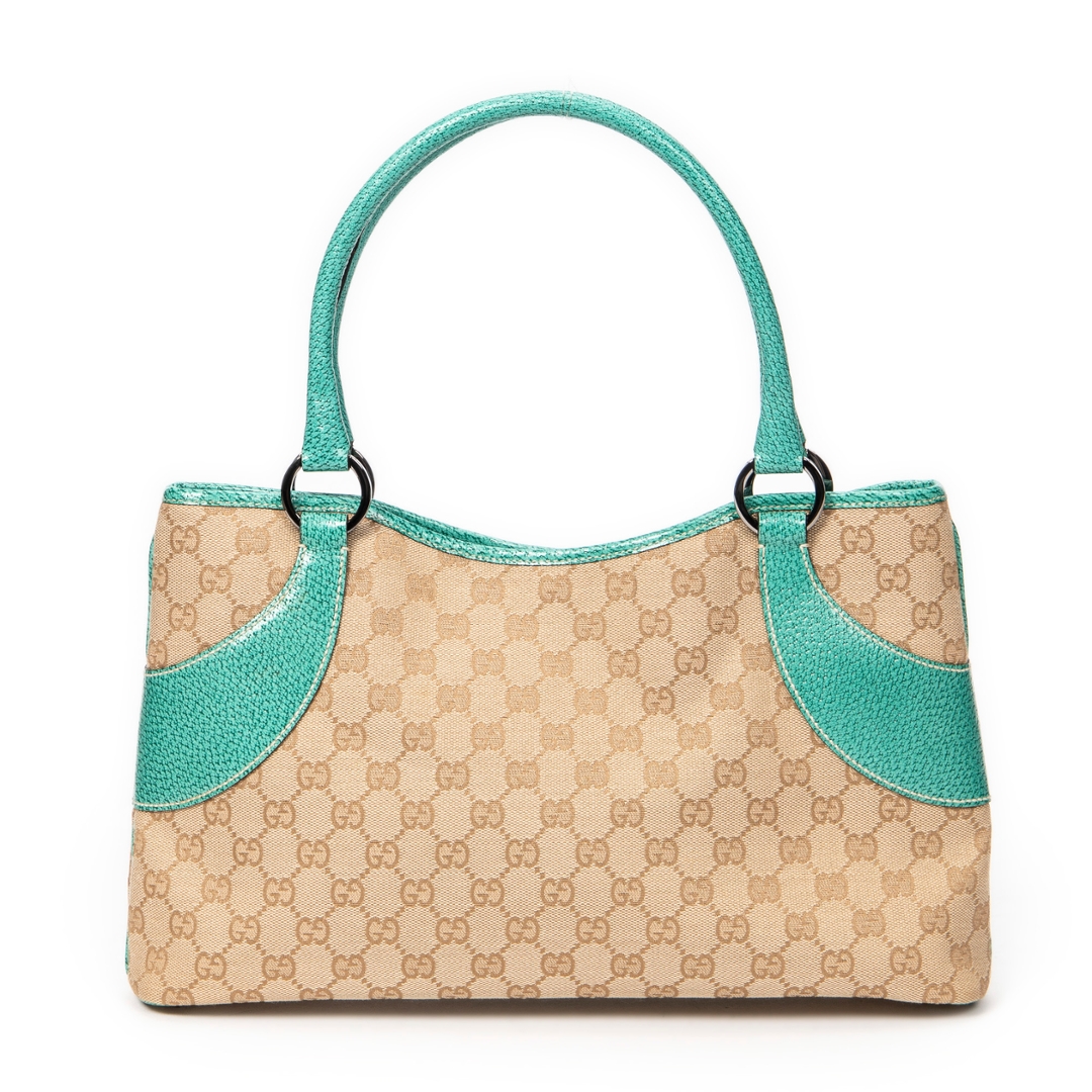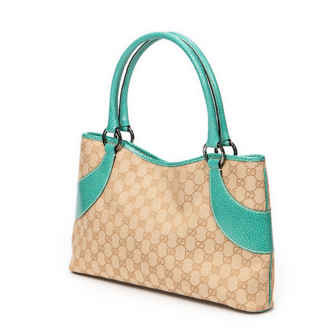 A vintage Gucci beige/turquoise canvas Horizontal Jacquard Tote bag with a certificate of authenticity, Approximately 21cm height, 36cm width.