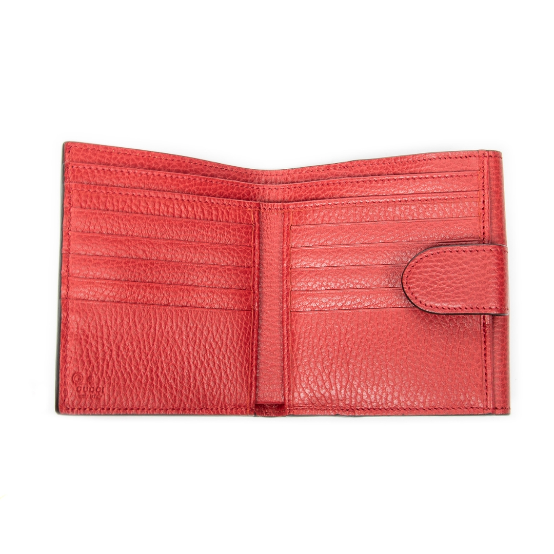 A vintage Gucci red calf leather Interlocking G Compact Wallet with a certificate of authenticity, Approximately 11cm height, 11cm width.