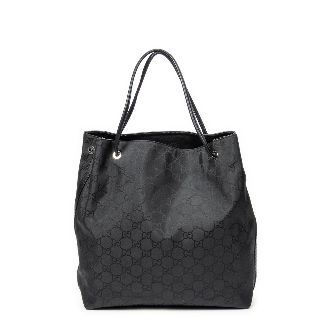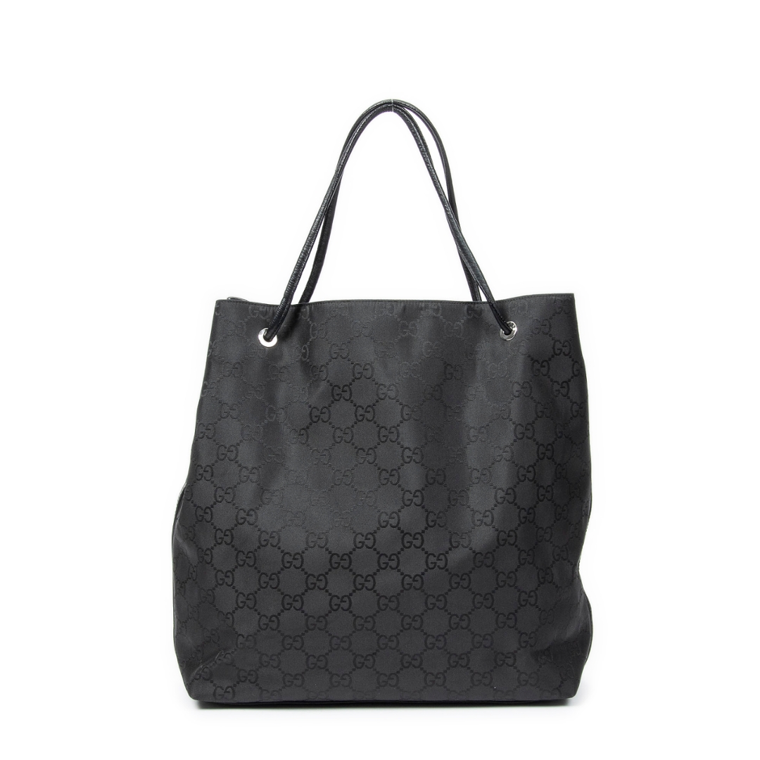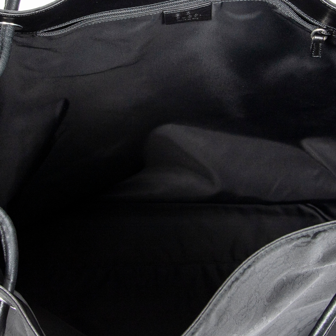 A vintage Gucci black canvas Large Gifford Tote bag, showcasing a clean and contemporary take on the house’s iconic GG monogram. The tonal black canvas creates a sleek, understated aesthetic, complemented by subtle leather trim and slim shoulder straps that enhance its refined, minimalist appeal.