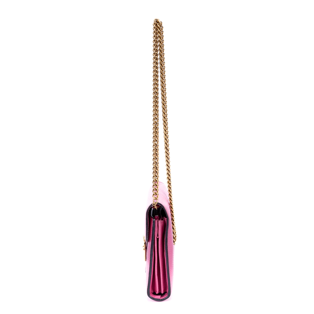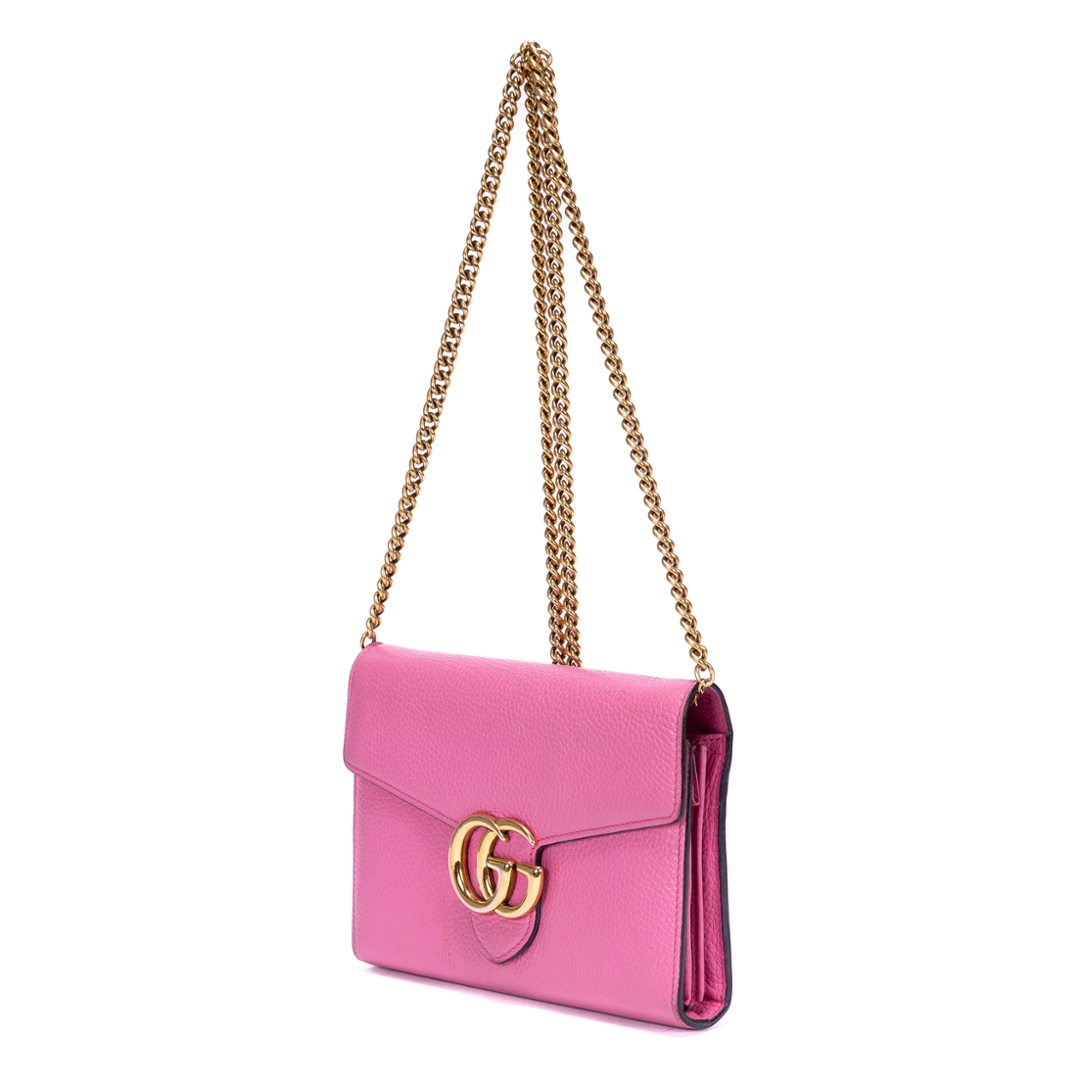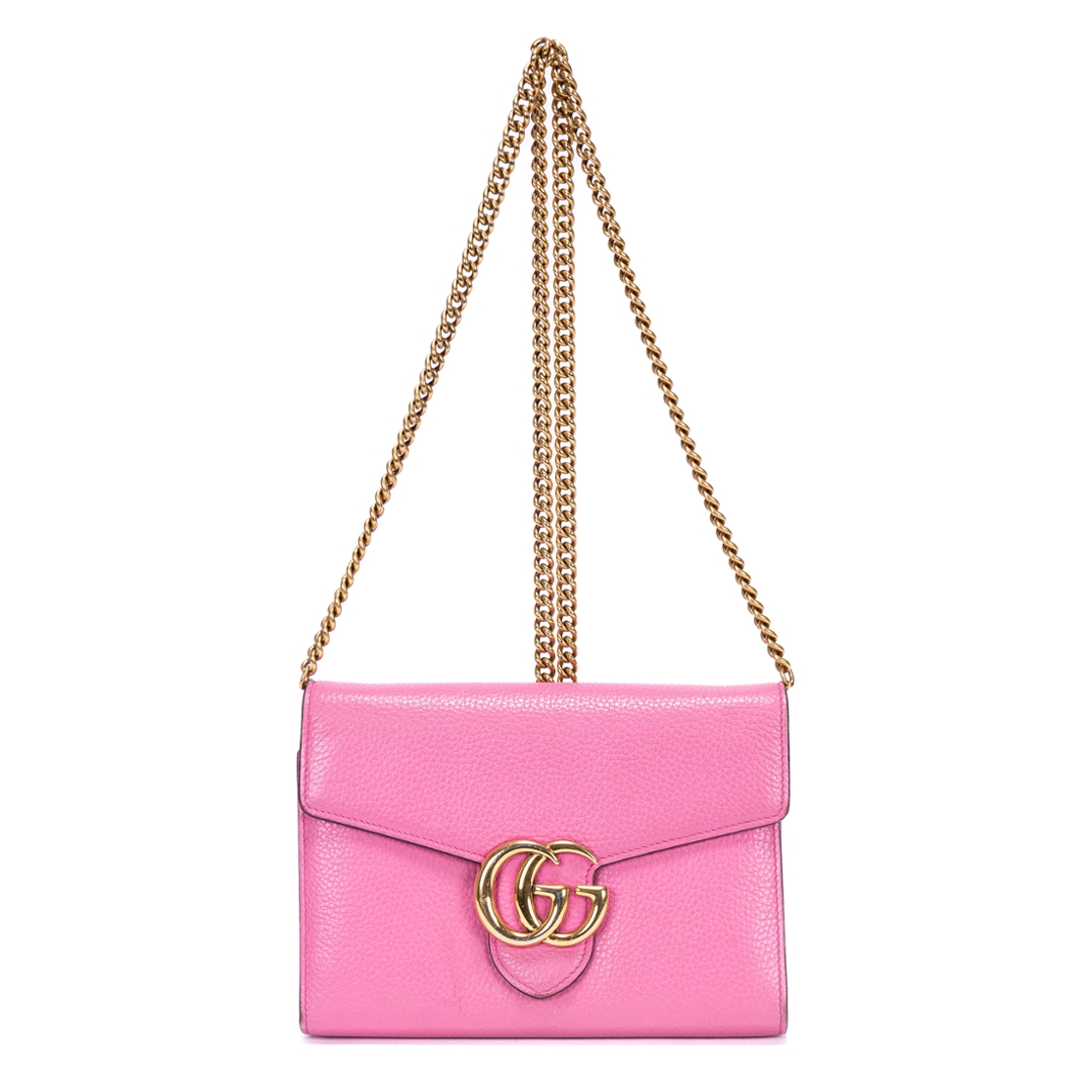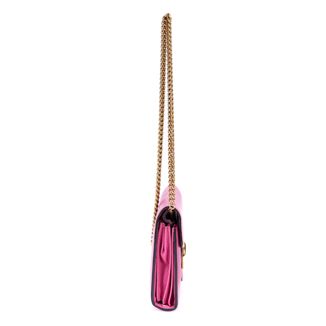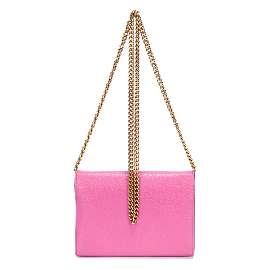 A vintage Gucci pink calf leather Marmont Wallet On Chain bag with a certificate of authenticity. Approximately 15cm height, 20cm width.