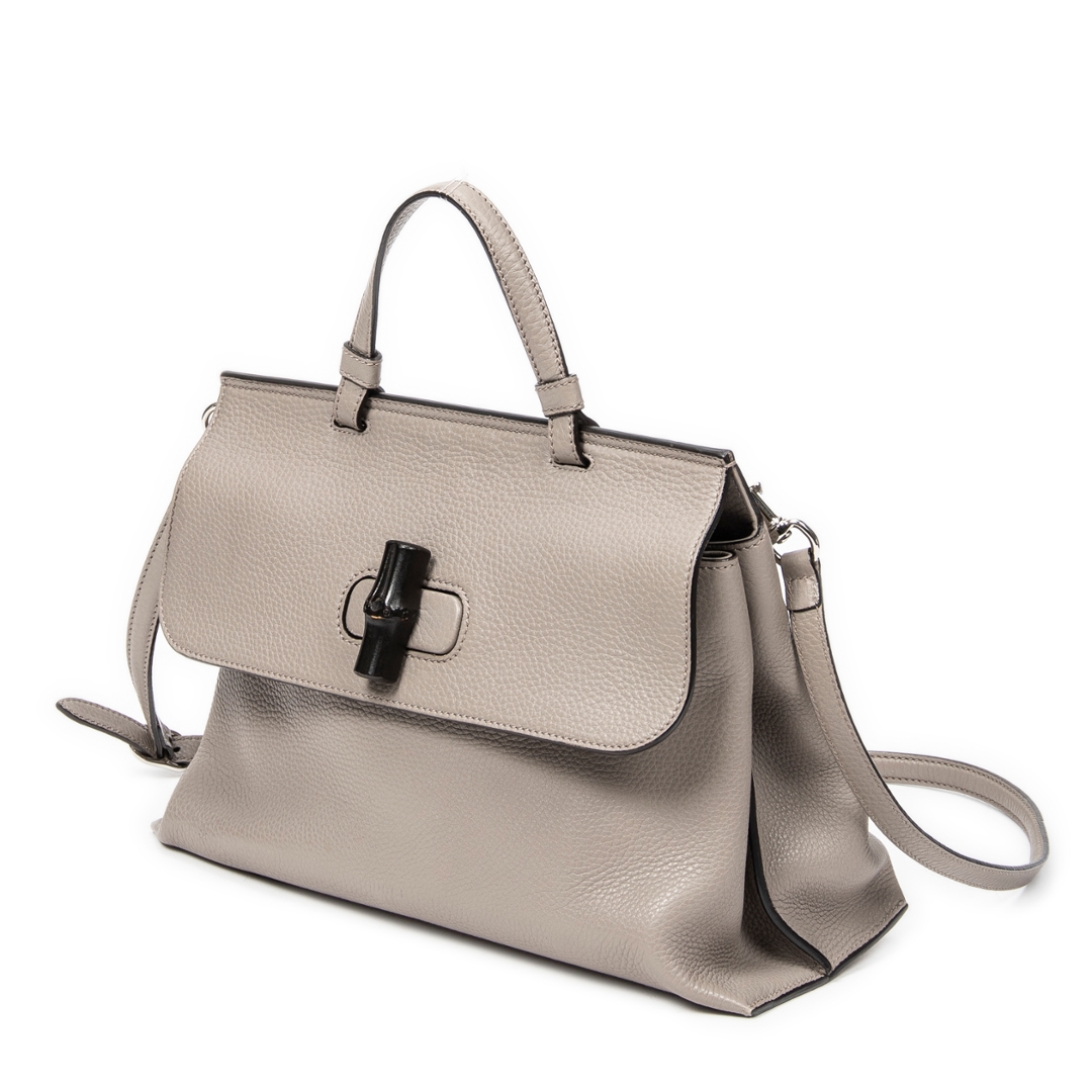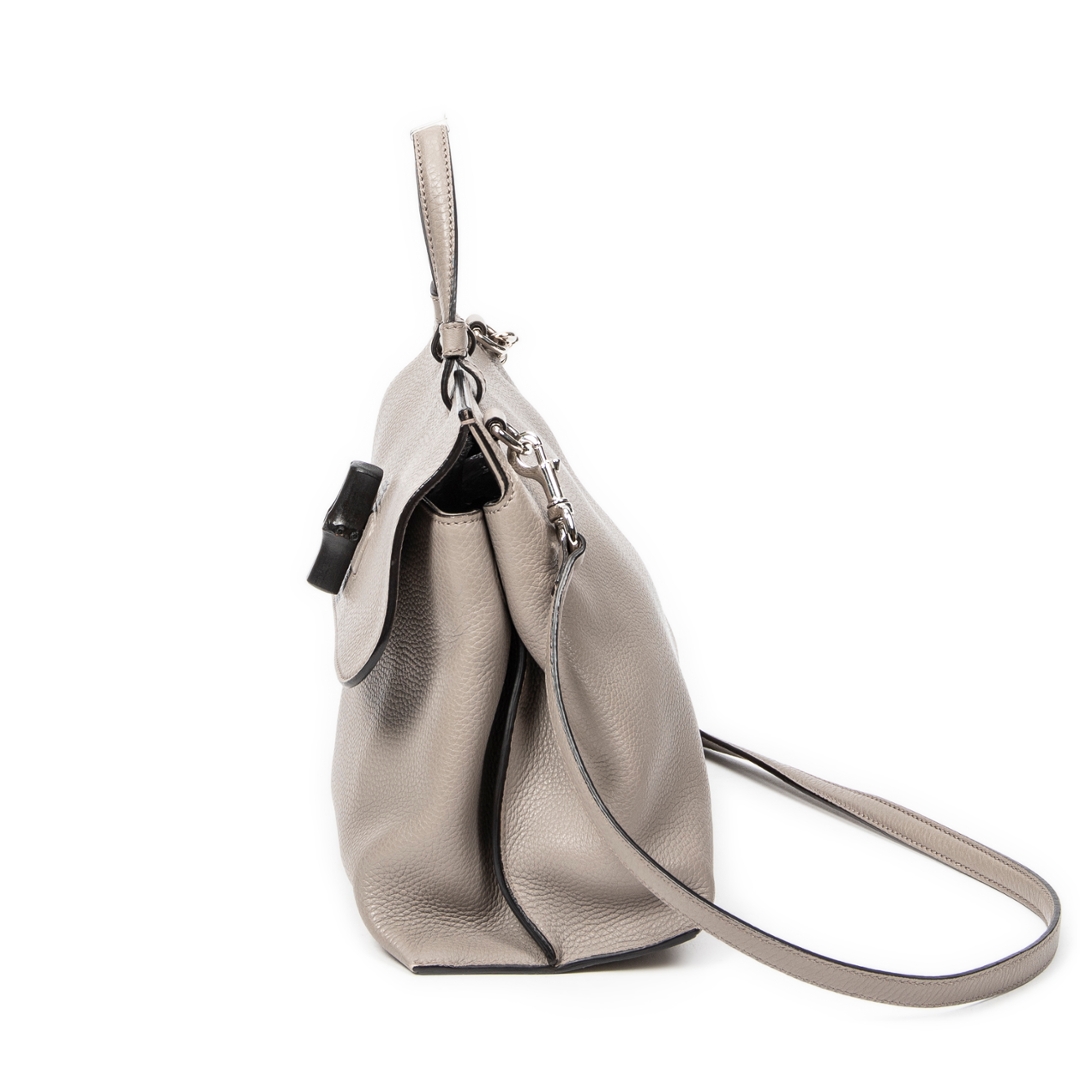 A vintage Gucci grey calf leather Medium Bamboo Daily Top Handle bag, offering a refined balance of classic house heritage and contemporary practicality. Crafted from supple calf leather in a soft grey tone, it is accented by the signature bamboo turn-lock closure, a distinctive detail synonymous with Gucci’s enduring design legacy.