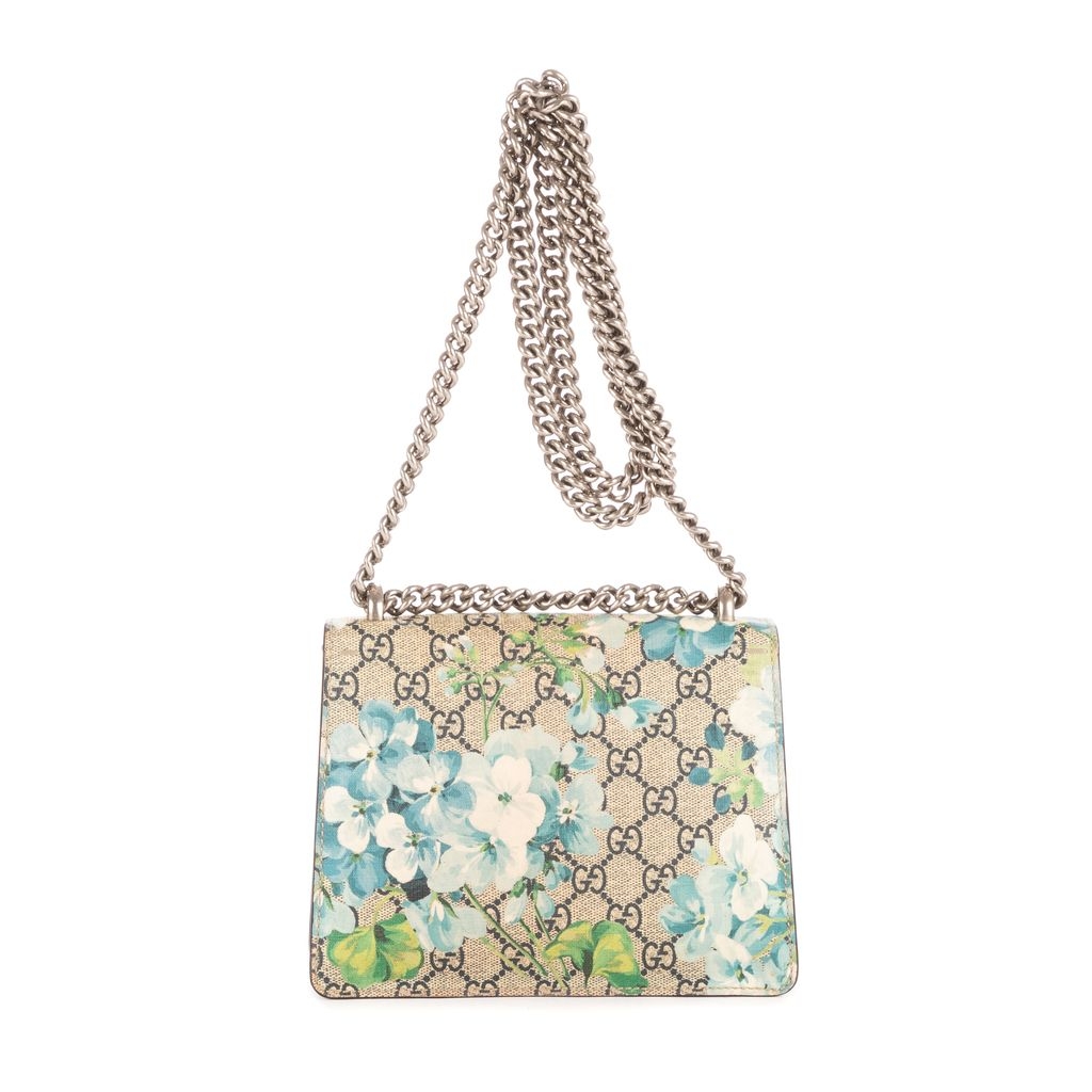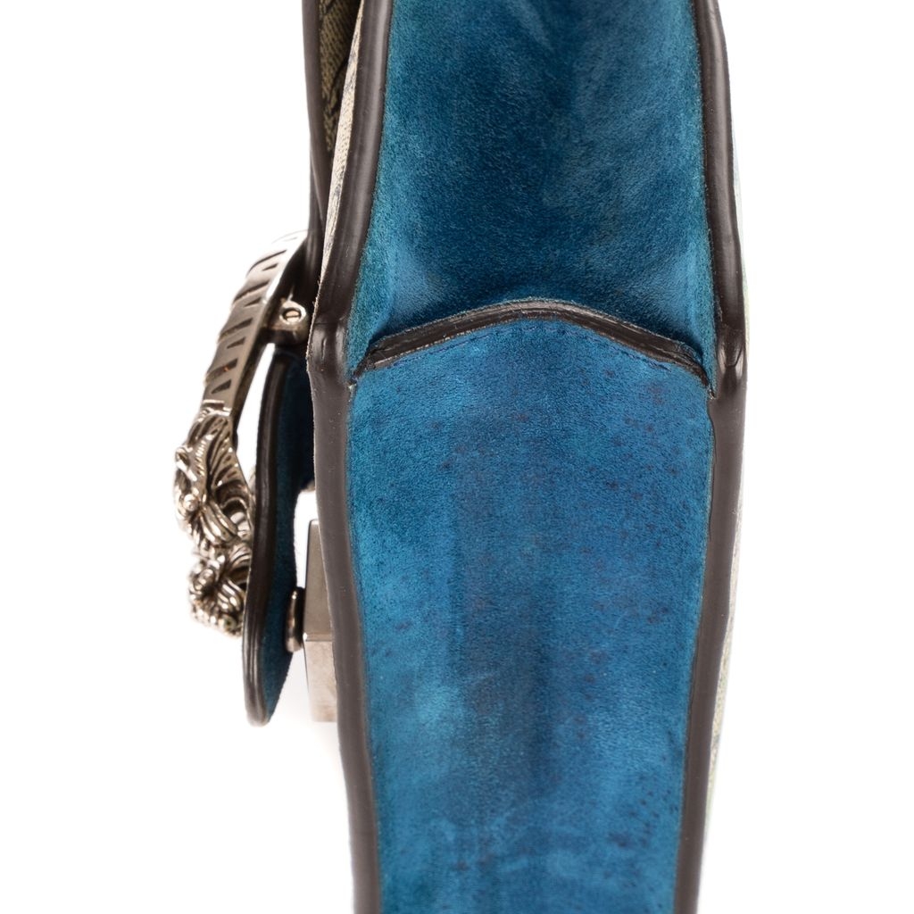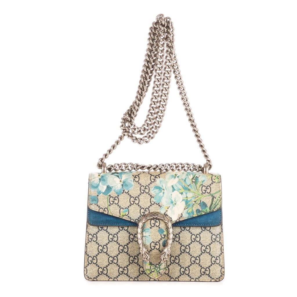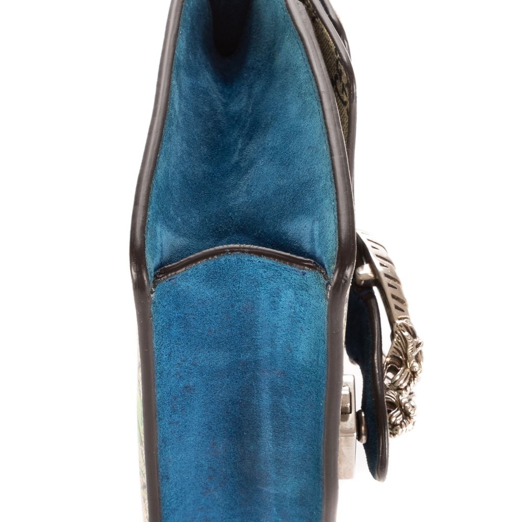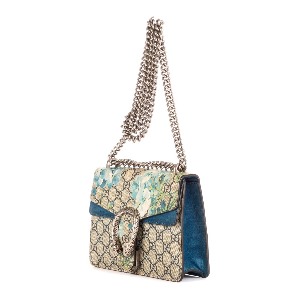 This vintage Gucci Mini Blooms Dionysus bag is a beautifully crafted piece, showcasing beige GG coated canvas adorned with delicate blue floral print. The standout feature is the antique silver-tone tiger head spur closure—an iconic detail inspired by Greek mythology. Measuring approximately 15cm in height and 20cm in width, this compact design is perfect for carrying essentials with style and sophistication.