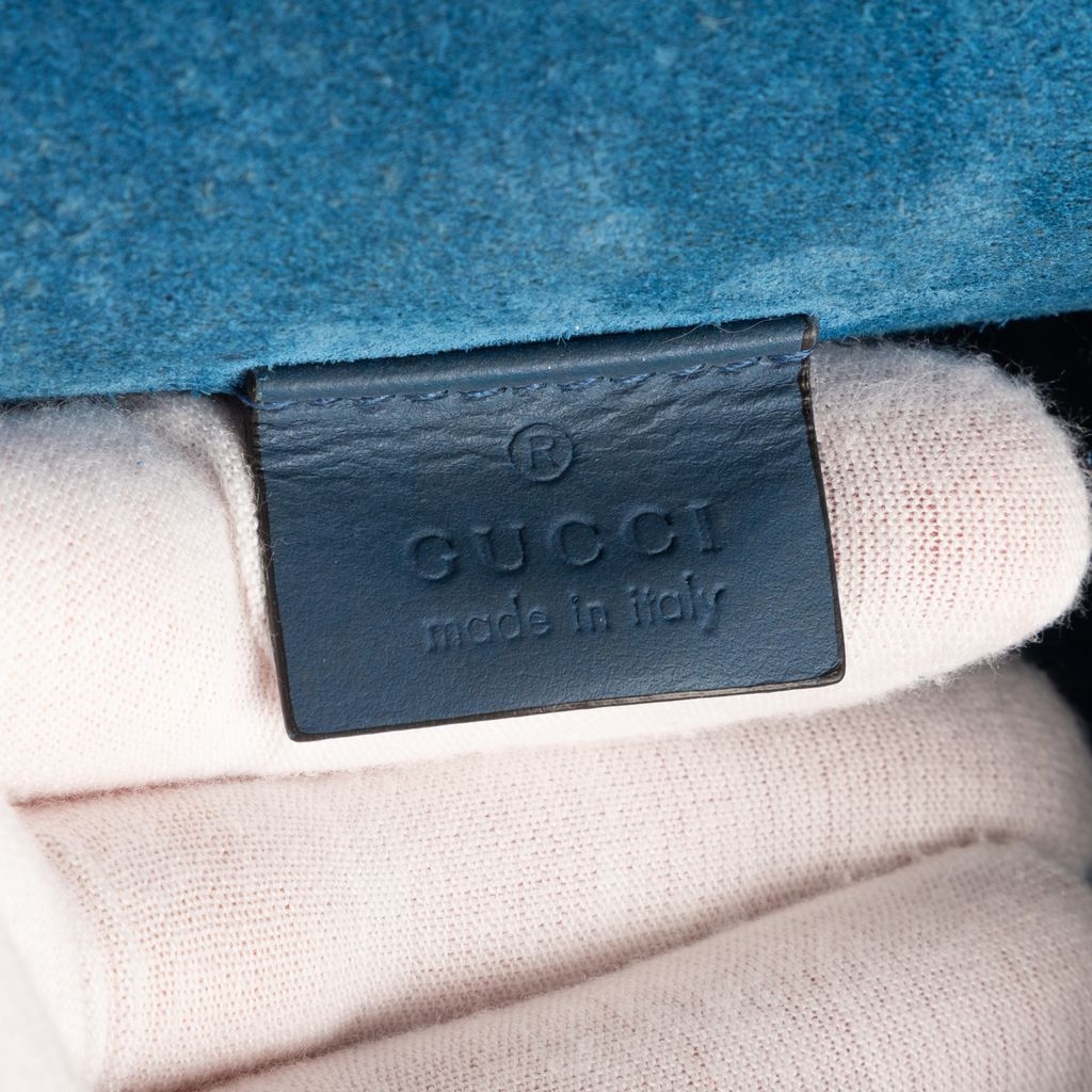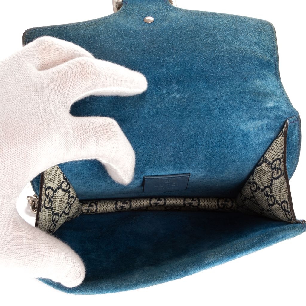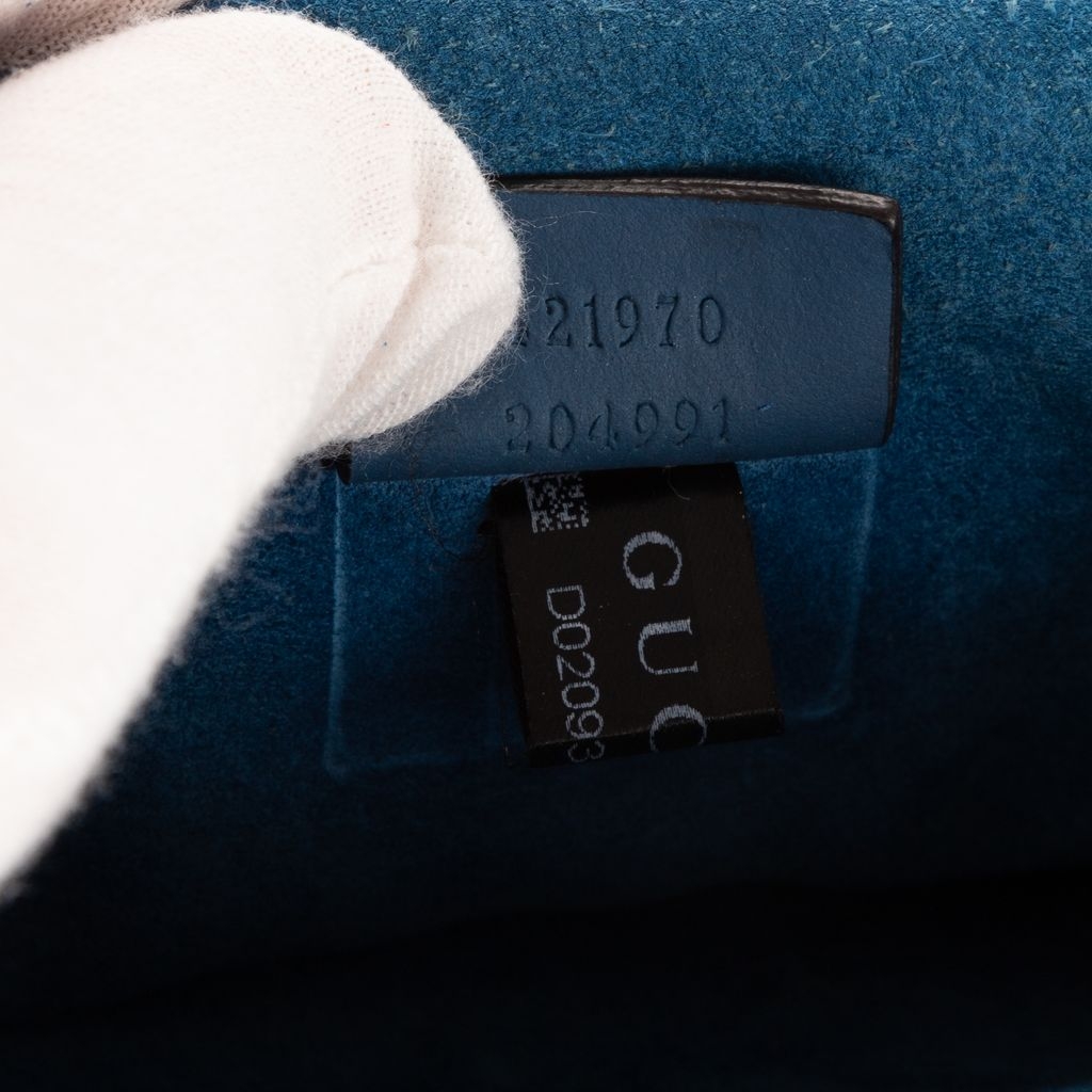 Graded A, the bag remains in very good vintage condition with only light signs of use. The blue suede side panels and structured silhouette add depth and luxury, while the sliding chain strap allows for both shoulder and crossbody wear. Complete with a certificate of authenticity, this floral Dionysus is an elegant blend of timeless Gucci design and feminine charm—ideal for collectors and fashion lovers alike.