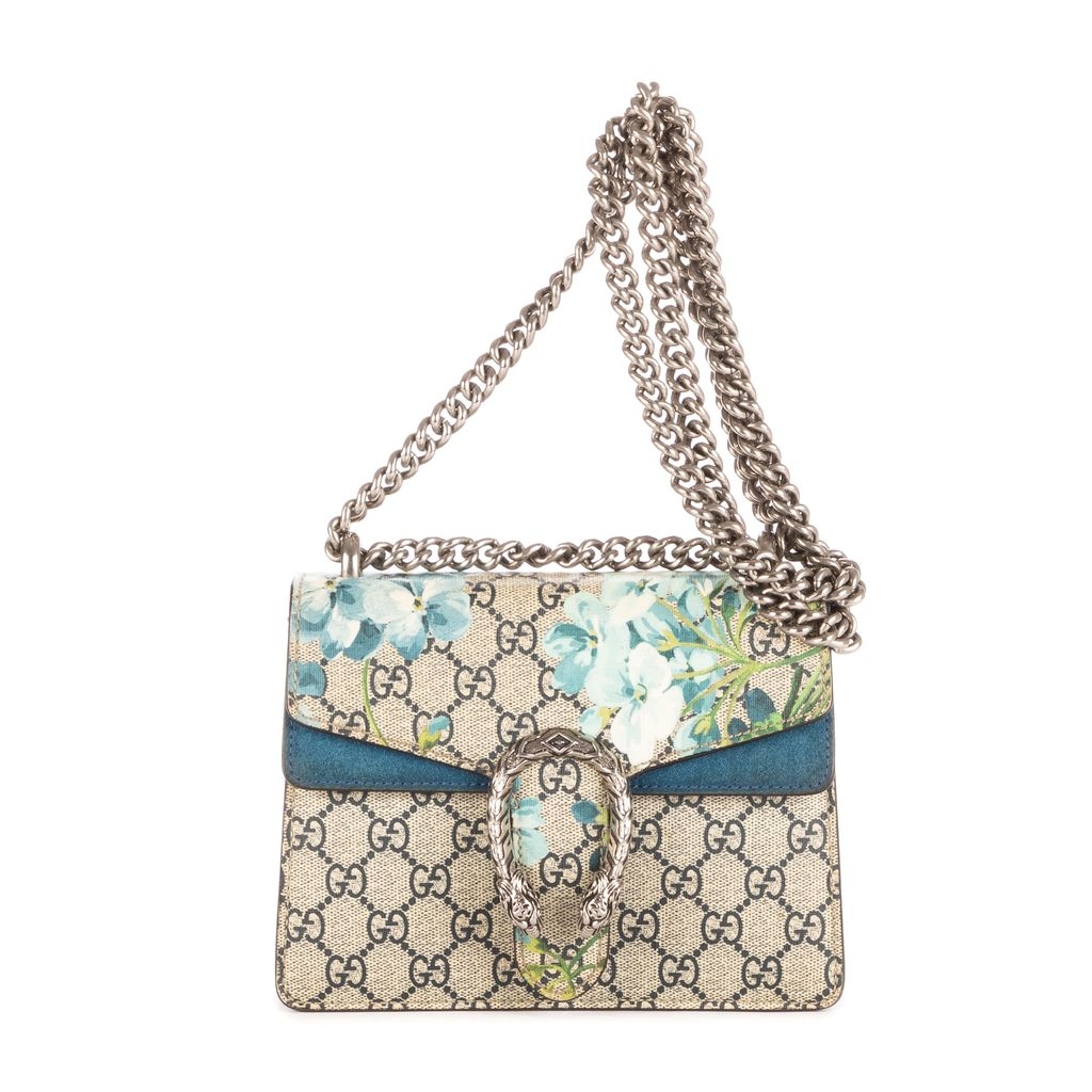 This vintage Gucci Mini Blooms Dionysus bag is a delicate and eye-catching piece, crafted in beige GG coated canvas adorned with Gucci’s signature blue floral Blooms print. The iconic tiger head spur closure, inspired by Greek mythology, adds a bold contrast to the romantic design. Measuring approximately 16cm in height and 20cm in width, it’s compact yet perfectly sized to hold your essentials with style.