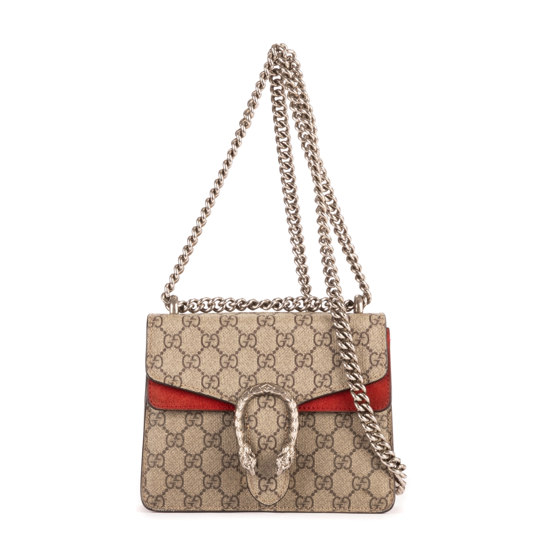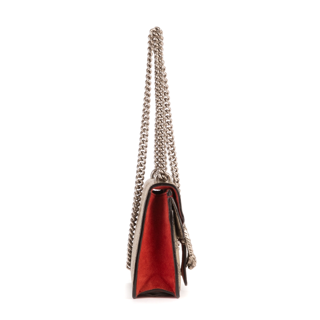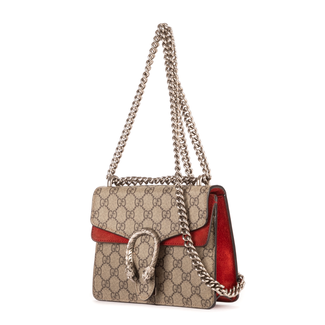 A vintage Gucci Mini Dionysus bag perfectly captures the modern elegance and bold craftsmanship that define the house of Gucci. Expertly crafted in beige GG Supreme coated canvas with vibrant red suede accents, it showcases a beautiful interplay of texture and tone. The antique silver-tone chain strap and signature tiger head spur closure — inspired by the Greek god Dionysus — lend this compact design its instantly recognizable allure.