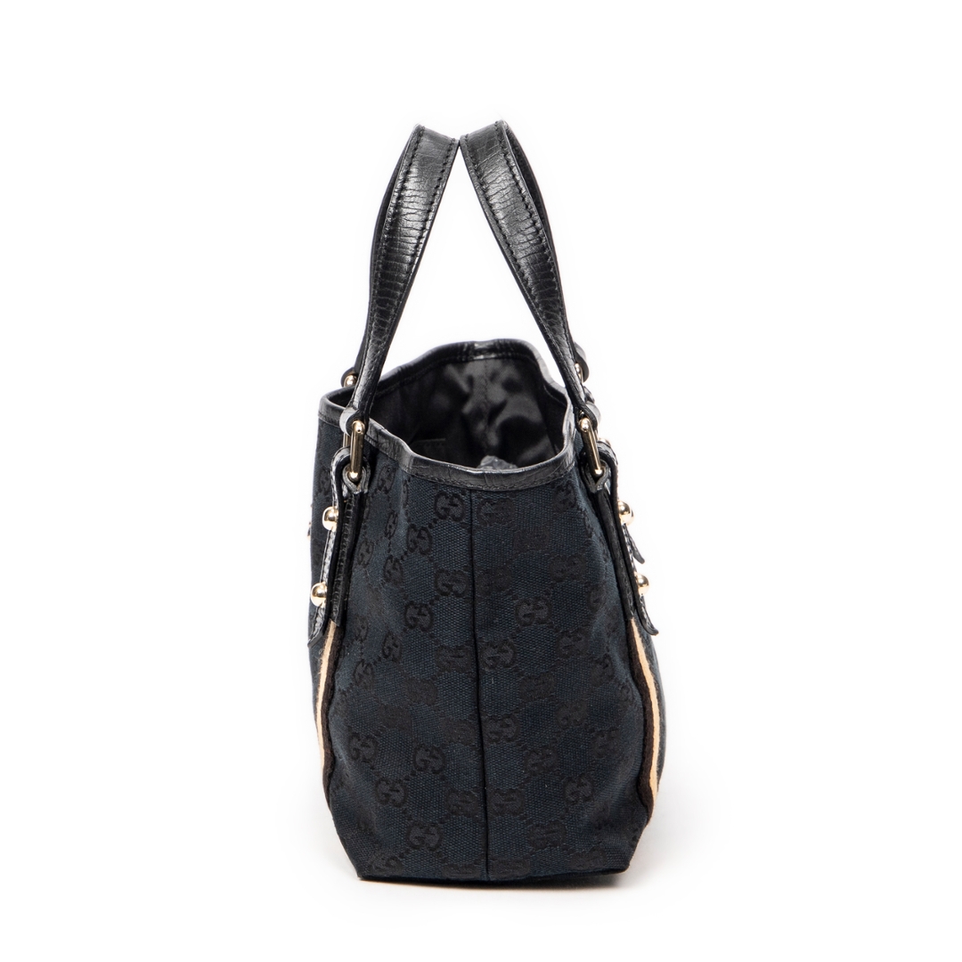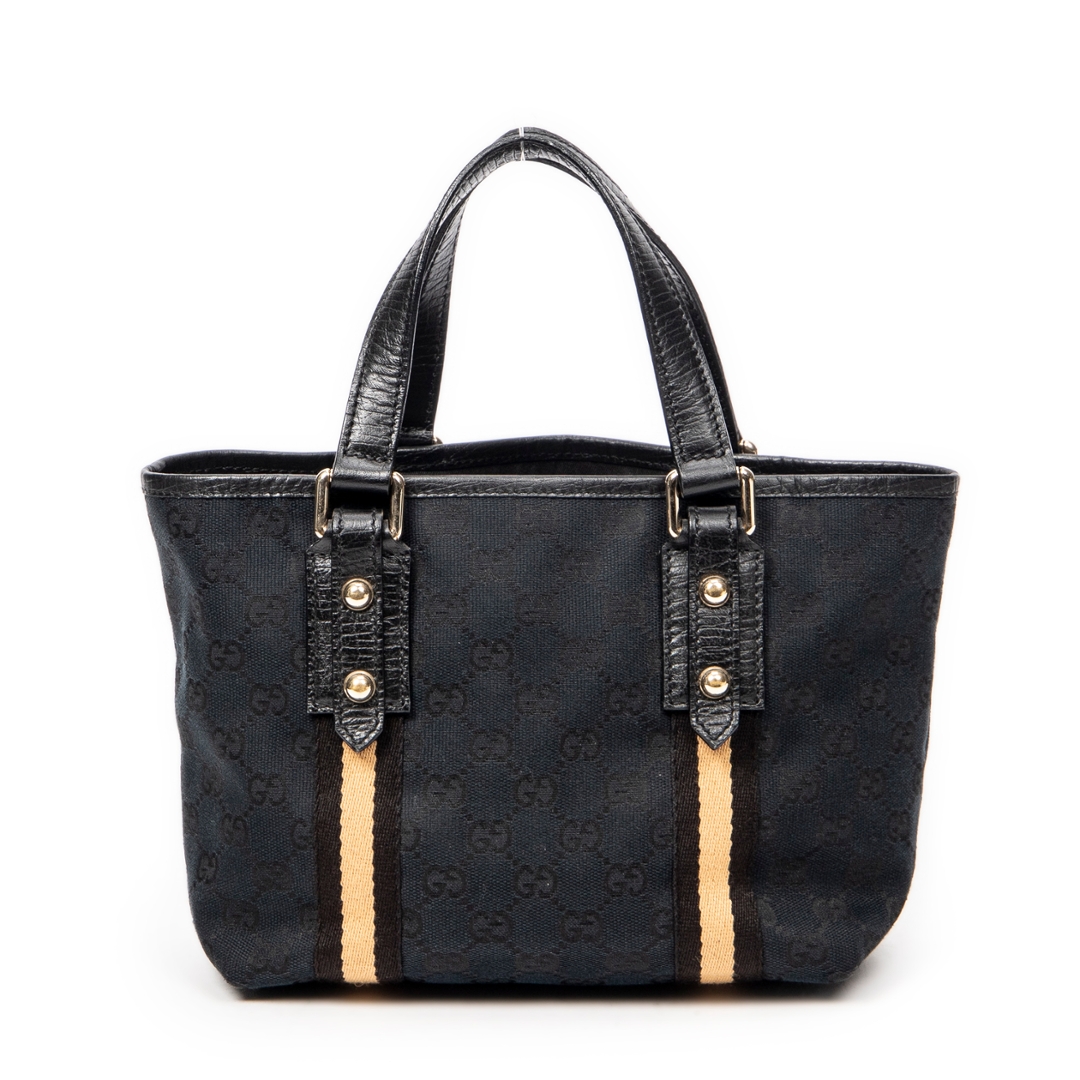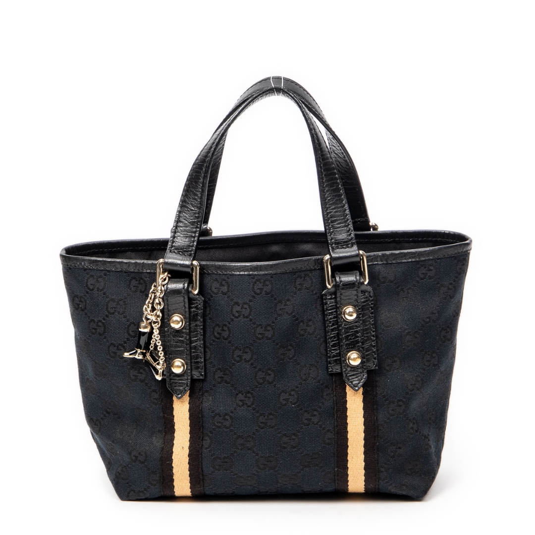 A vintage Gucci black canvas Mini Web Jolicoeur Tote bag with a certificate of authenticity, Approximately 17cm height, 22cm width.