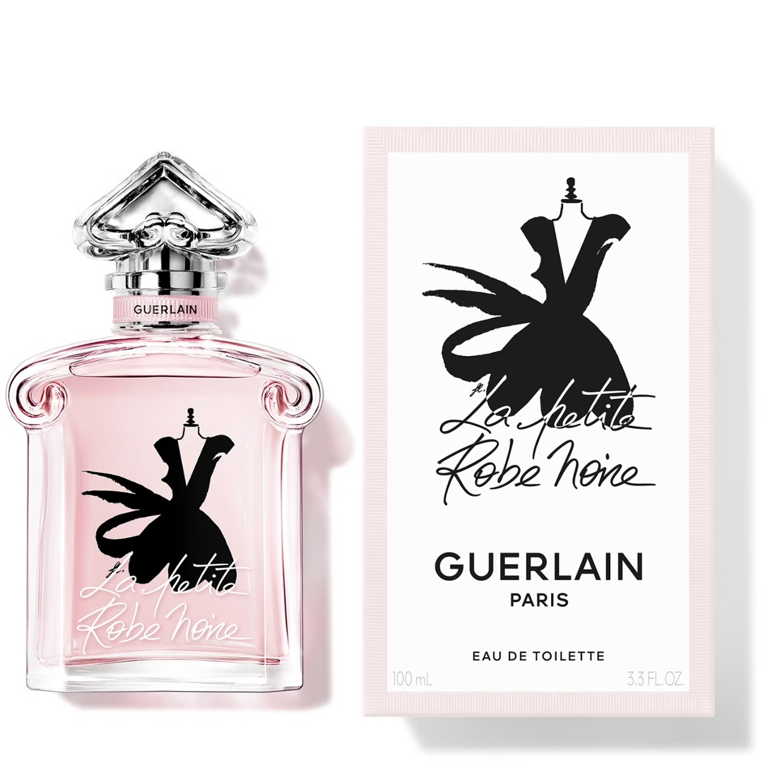 A 100ml bottle of Guerlain La Petite Robe Noire Eau De Toilette, a playful and elegant fragrance that embodies Parisian charm with a light, modern twist. It opens with a bright burst of cherry and citrus, delivering a fresh and slightly sweet introduction that feels vibrant, youthful, and instantly appealing.