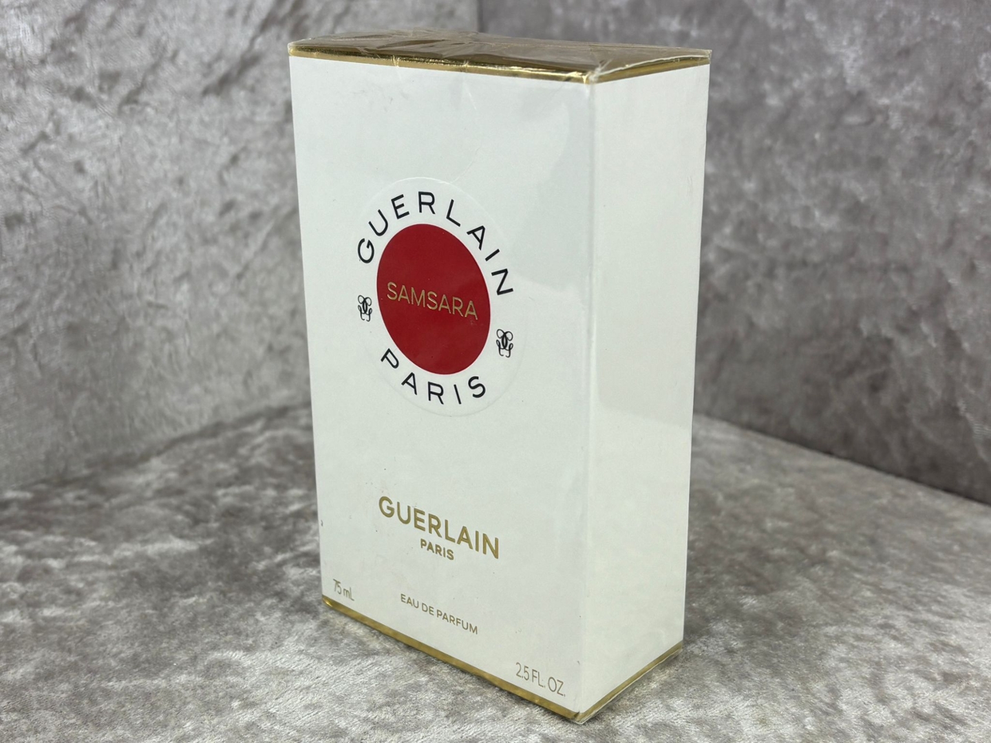 A 75ml bottle of Guerlain Samsara Eau De Parfum, a rich and sensual fragrance that reflects timeless elegance and depth. It opens with a soft blend of citrus and delicate florals, offering a smooth and inviting introduction that feels both refined and comforting from the first impression.