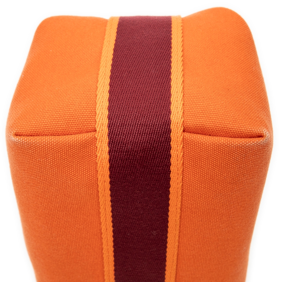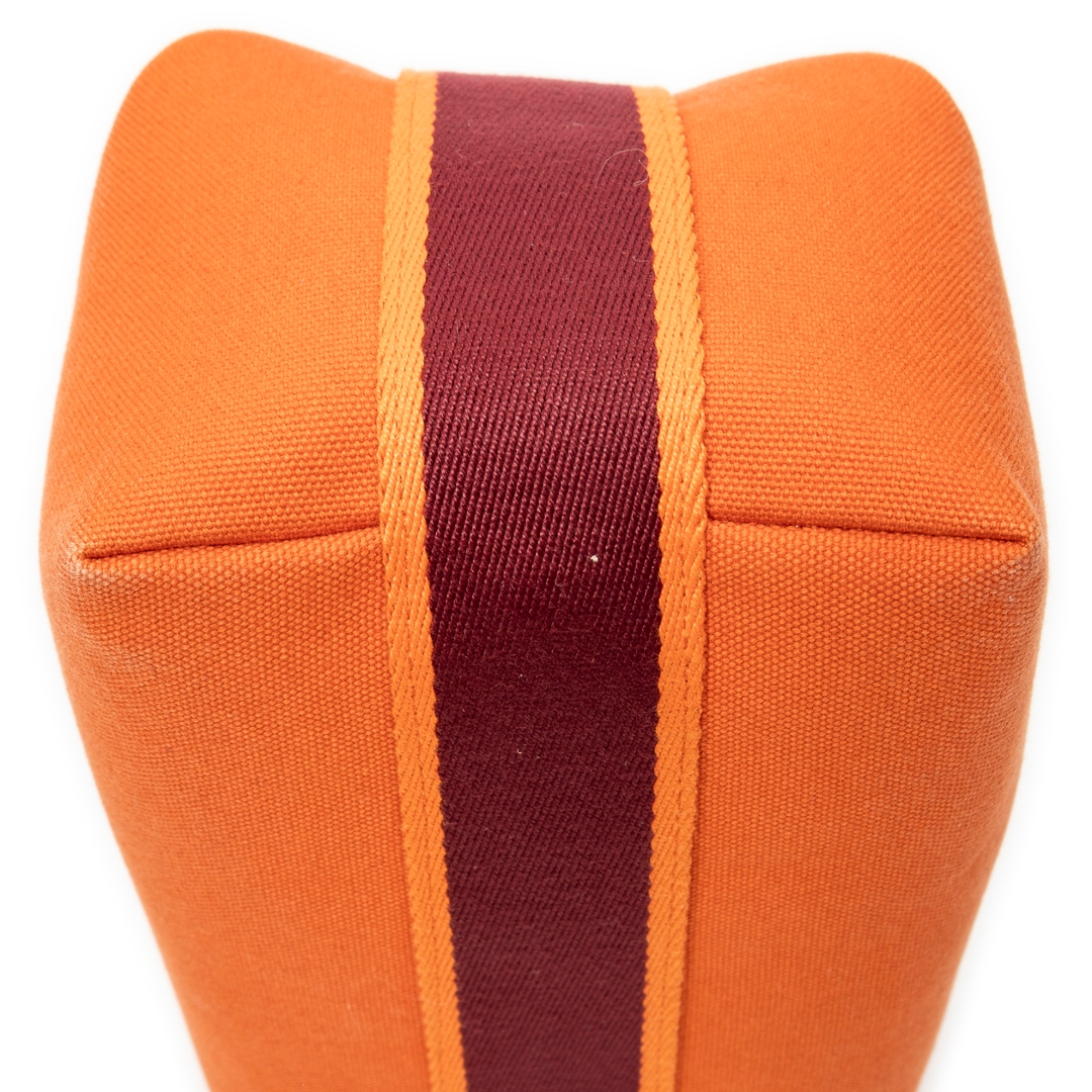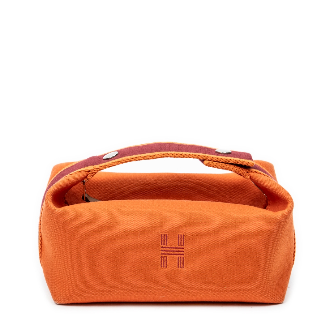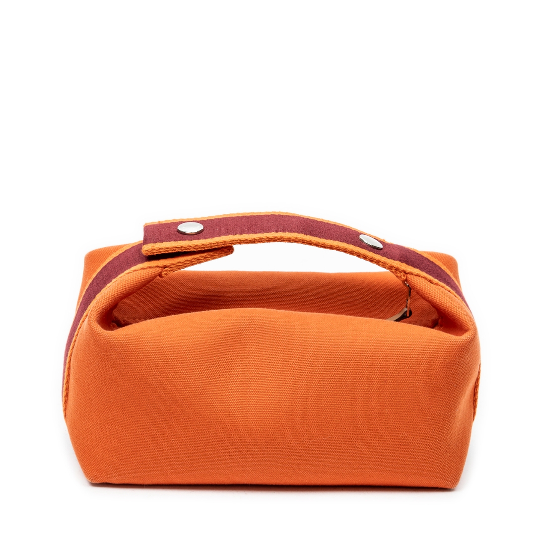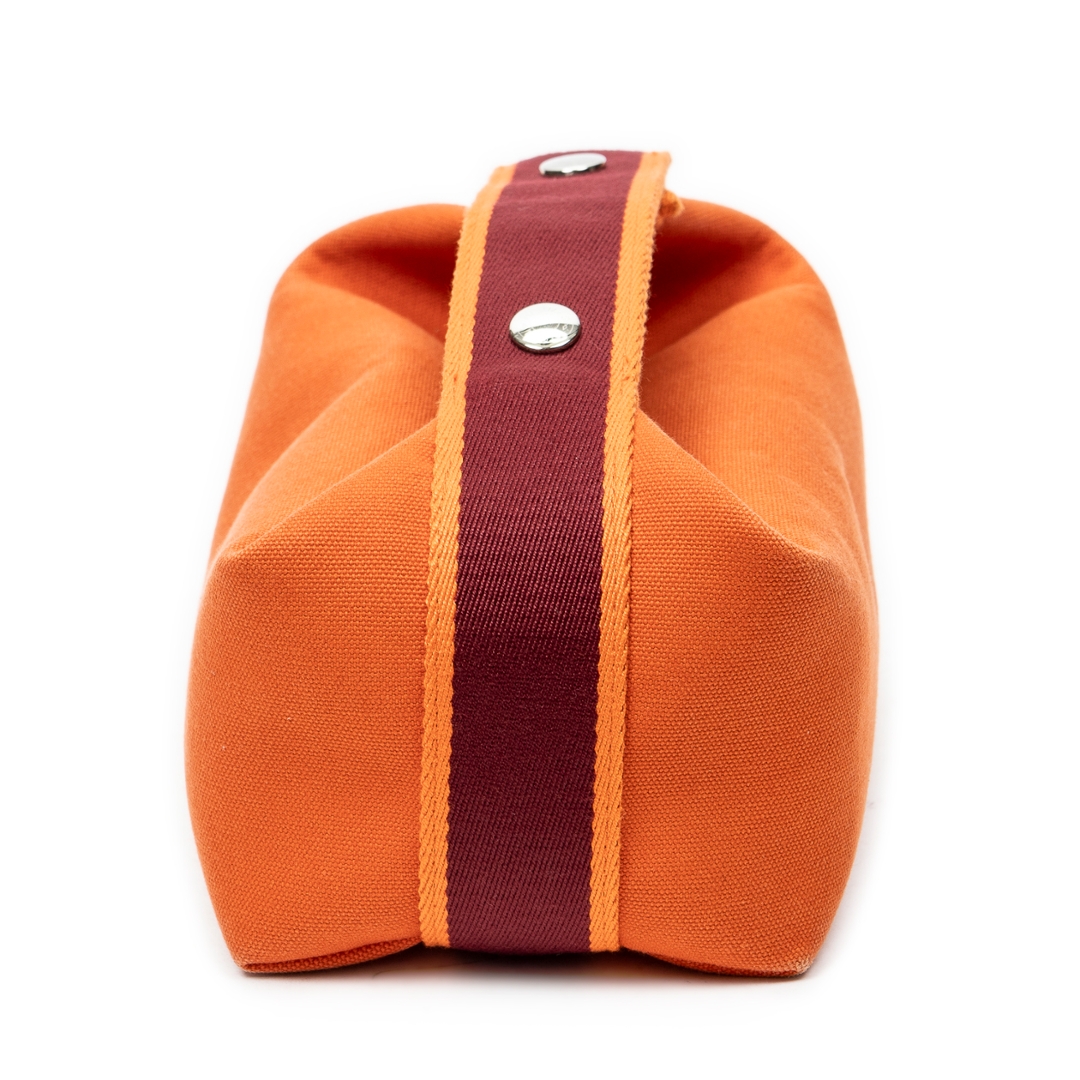 A Hermès Bride-à-Brac case crafted in vibrant orange canvas, showcasing the house’s signature blend of practicality and understated luxury. The structured silhouette is enhanced by a contrasting burgundy strap with snap-button closure, adding both visual depth and functional security. Subtle Hermès detailing, including the discreet “H” motif to the side, reinforces its heritage while maintaining a clean, versatile aesthetic.