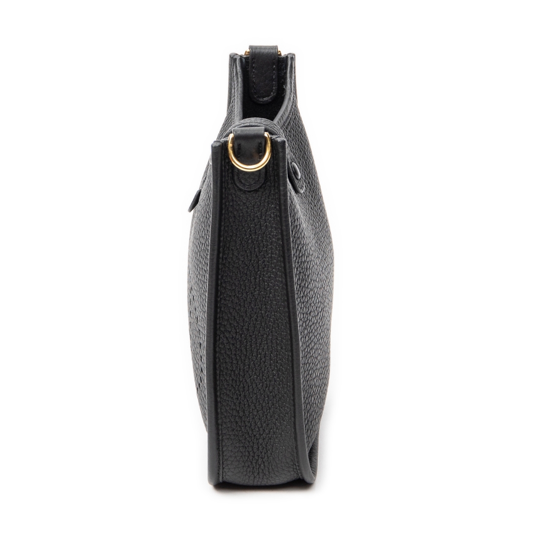 A vintage Hermès black calf leather Evelyne bag, a timeless and effortlessly refined design that reflects the house’s commitment to understated luxury. Crafted from finely grained calf leather, the softly structured silhouette is complemented by the signature perforated “H” logo to the front, delivering a subtle yet instantly recognisable Hermès detail.