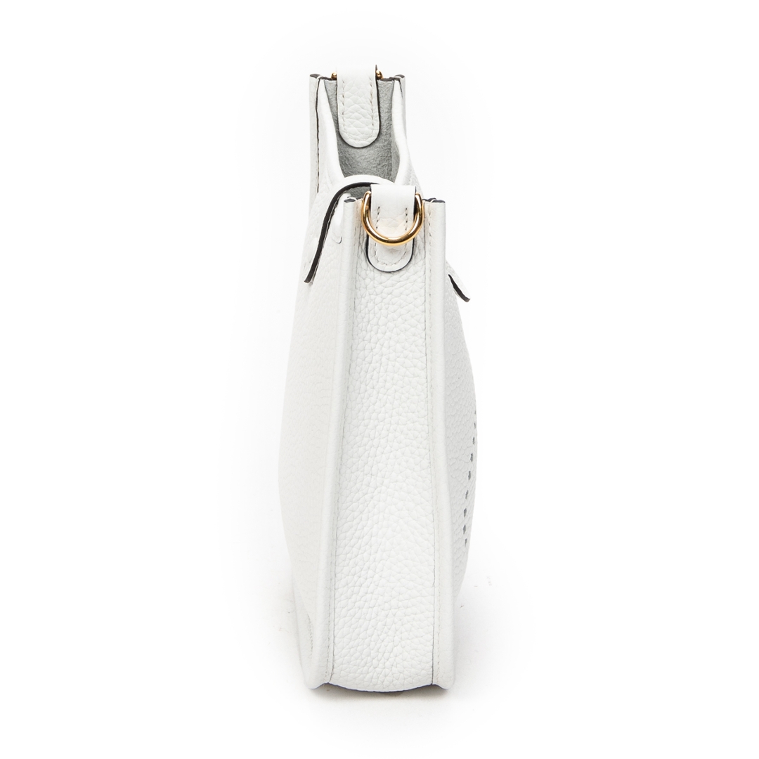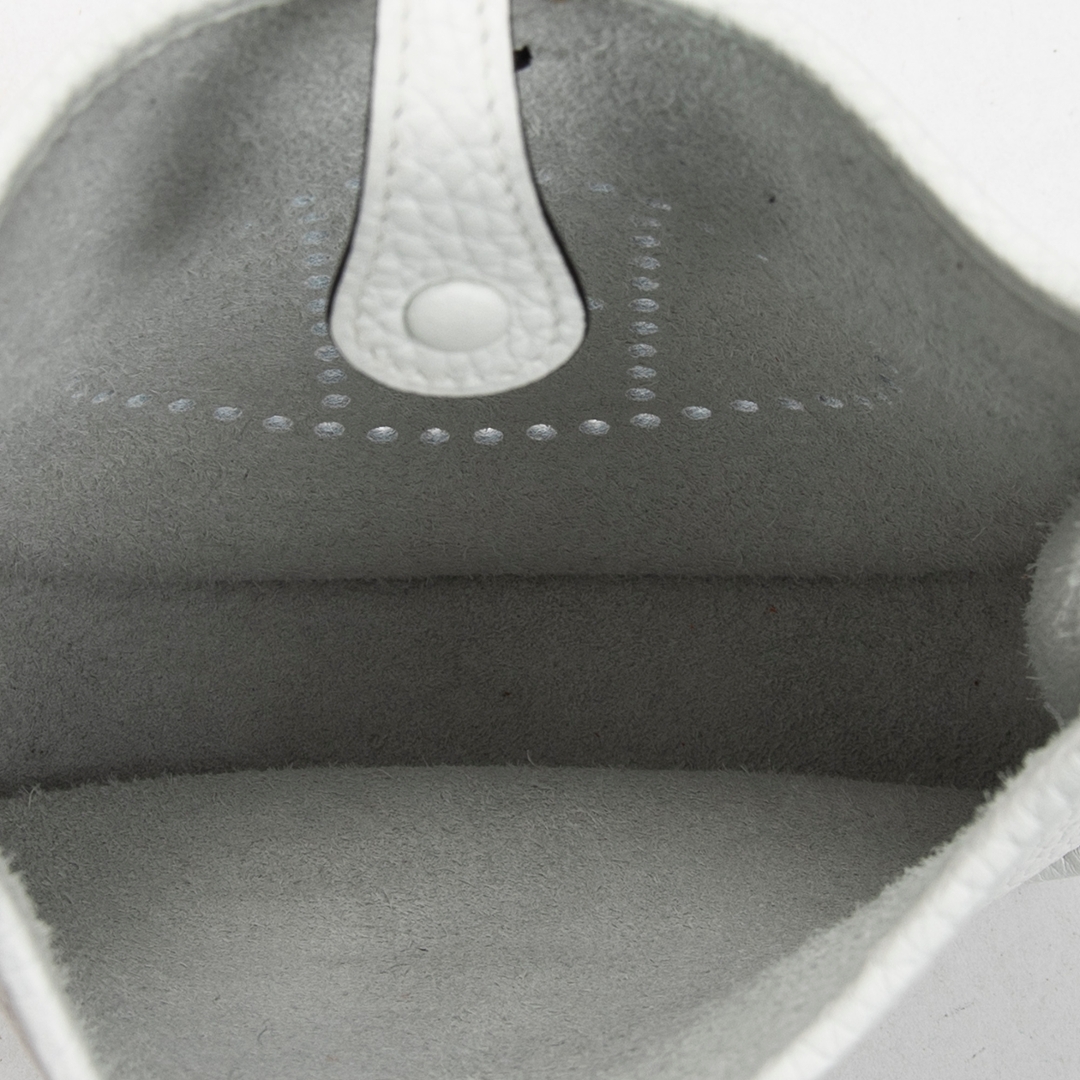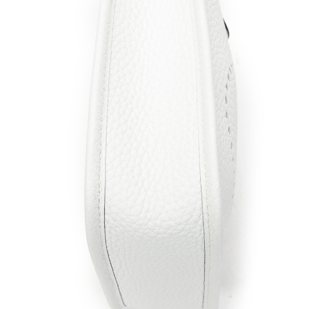 A Hermès Evelyne bag crafted in ivory Clemence calf leather, showcasing the house’s iconic perforated “H” logo to the front. The softly structured silhouette is enhanced by smooth leather trim and gold-tone hardware, creating a refined contrast against the crisp ivory tone. The natural grain of Clemence leather adds depth and durability, reinforcing both its luxurious feel and everyday practicality.