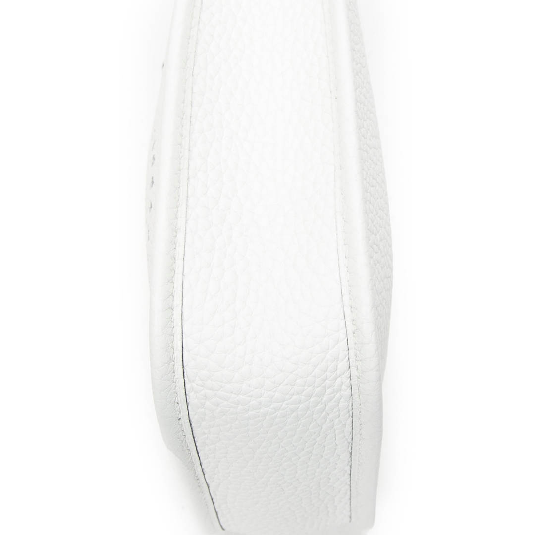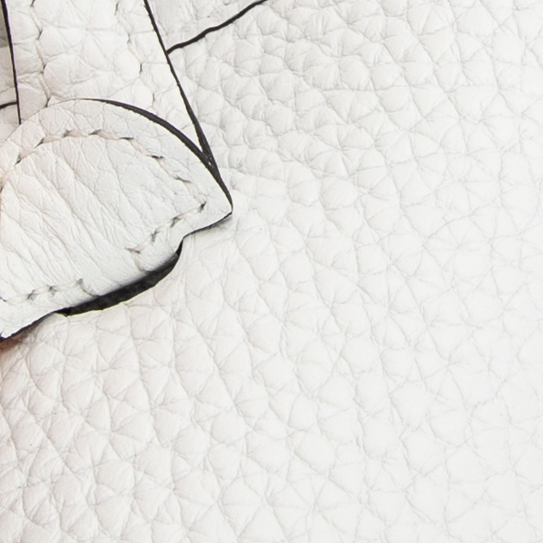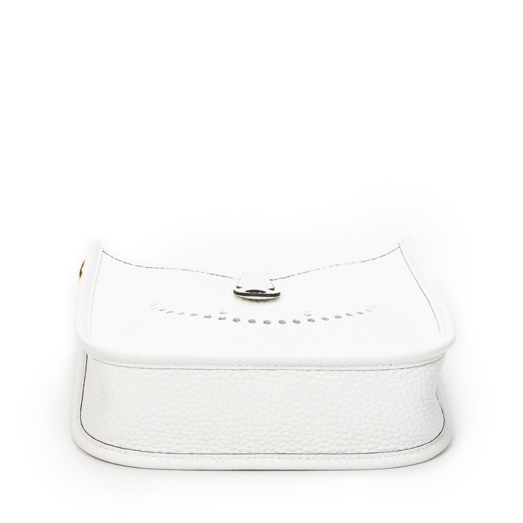 A Hermès Evelyne bag crafted in ivory Clemence calf leather, showcasing the house’s iconic perforated “H” logo to the front. The softly structured silhouette is enhanced by smooth leather trim and gold-tone hardware, creating a refined contrast against the crisp ivory tone. The natural grain of Clemence leather adds depth and durability, reinforcing both its luxurious feel and everyday practicality.