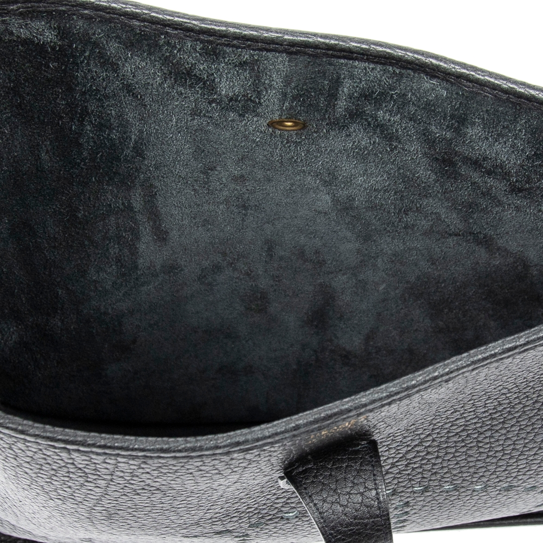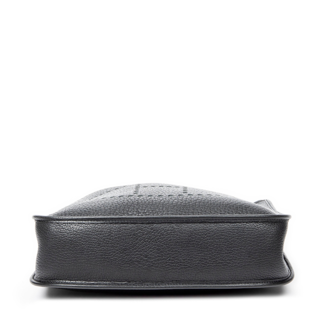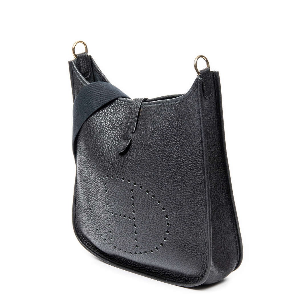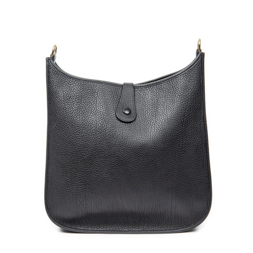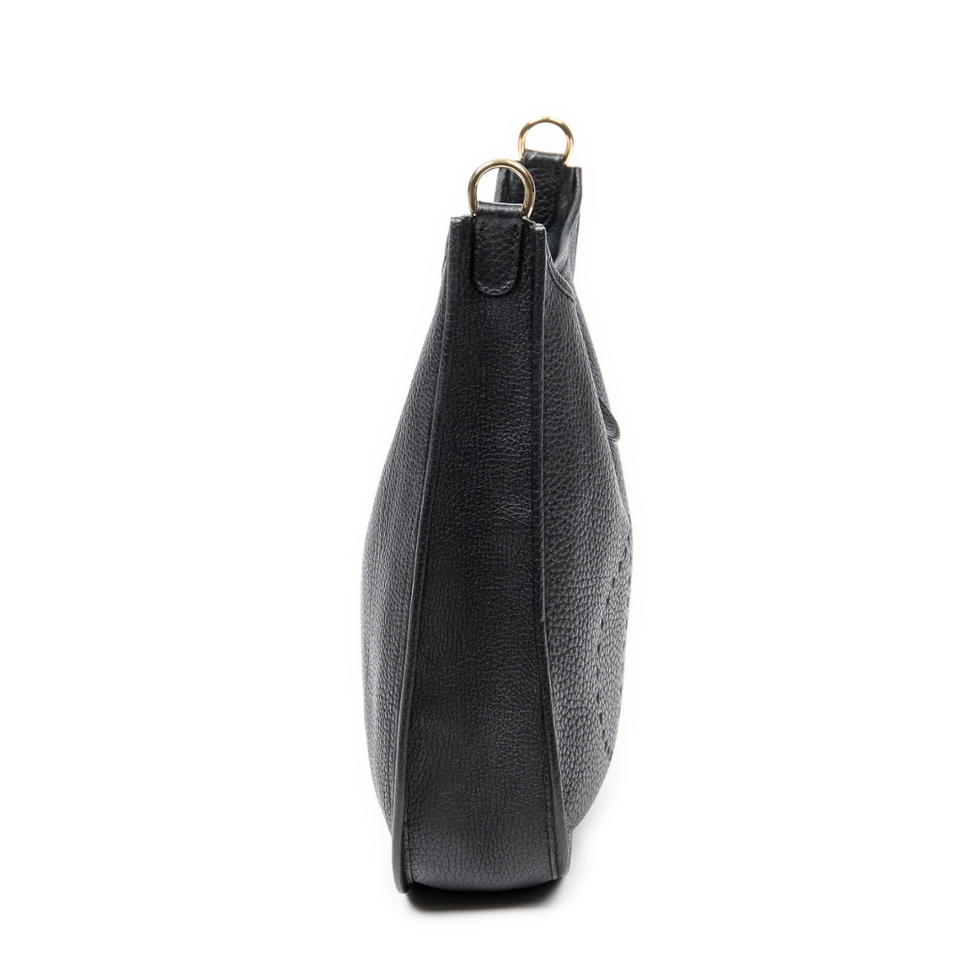 A vintage Hermès black calf leather Evelyne I bag, a larger and highly practical iteration of the house’s iconic Evelyne design. Crafted from finely grained calf leather, the relaxed yet structured silhouette is enhanced by the signature perforated “H” logo to the front, offering a subtle but unmistakable Hermès identity.