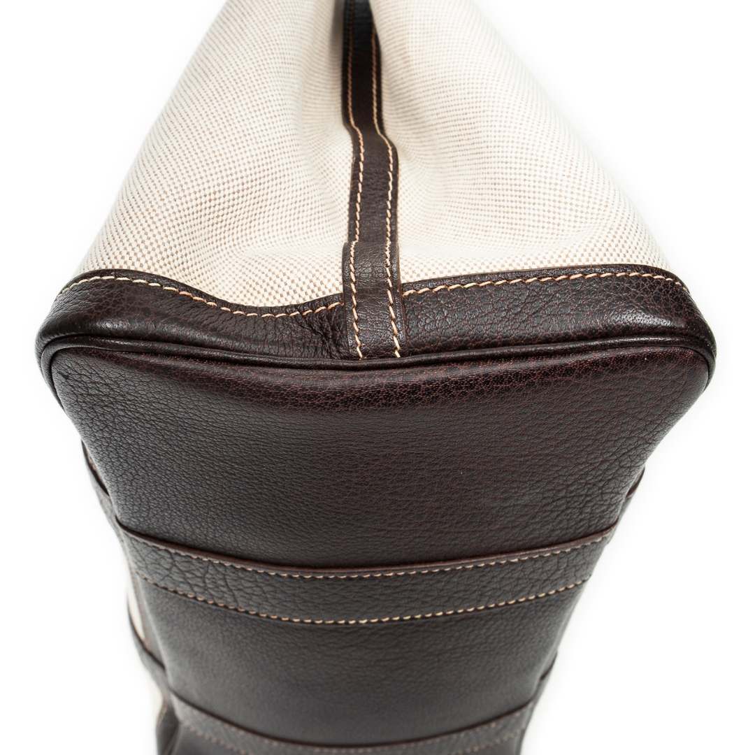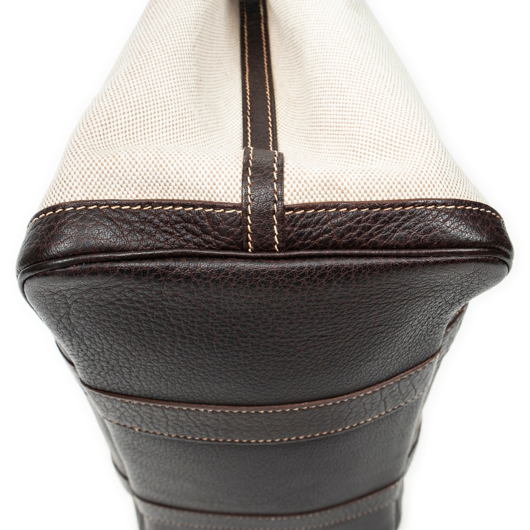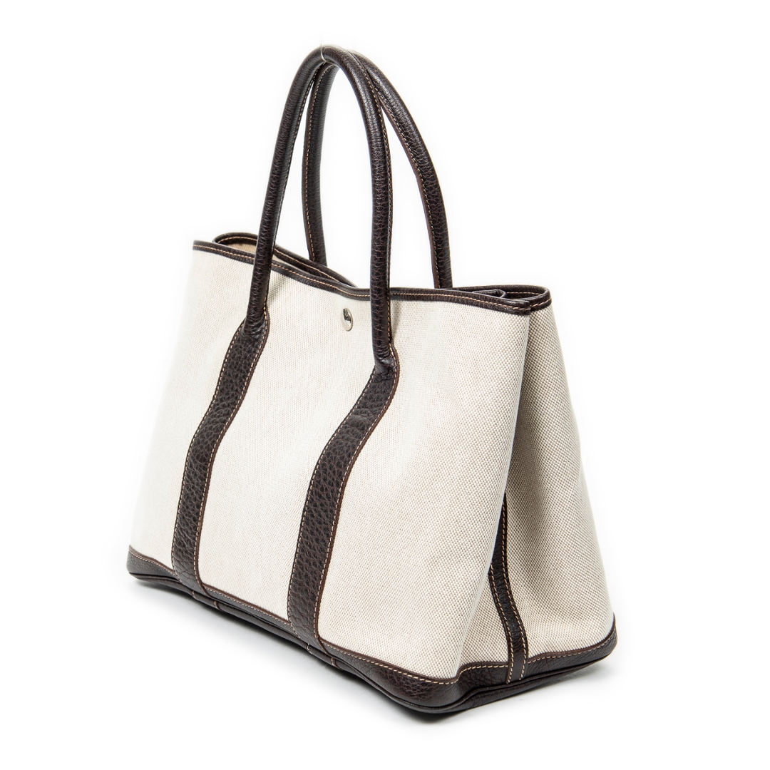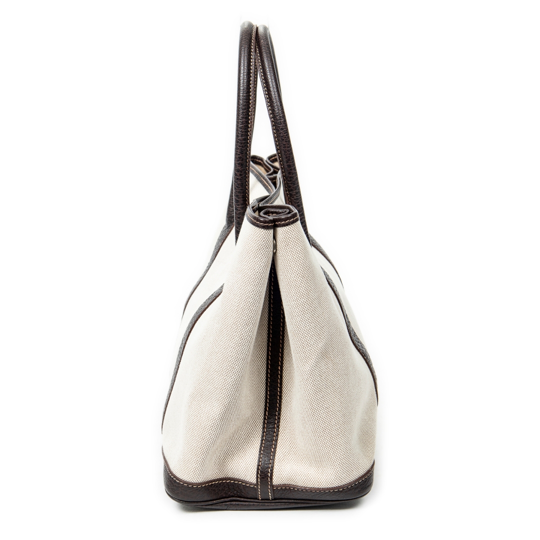 A Hermès Garden Party bag crafted in beige canvas with contrasting brown leather trim, offering a refined balance of casual elegance and structured design. The clean silhouette is defined by its reinforced leather handles and side panels, while subtle stitching and a discreet snap-button closure reflect the house’s understated approach to luxury. The neutral colour combination ensures timeless versatility across a range of settings.