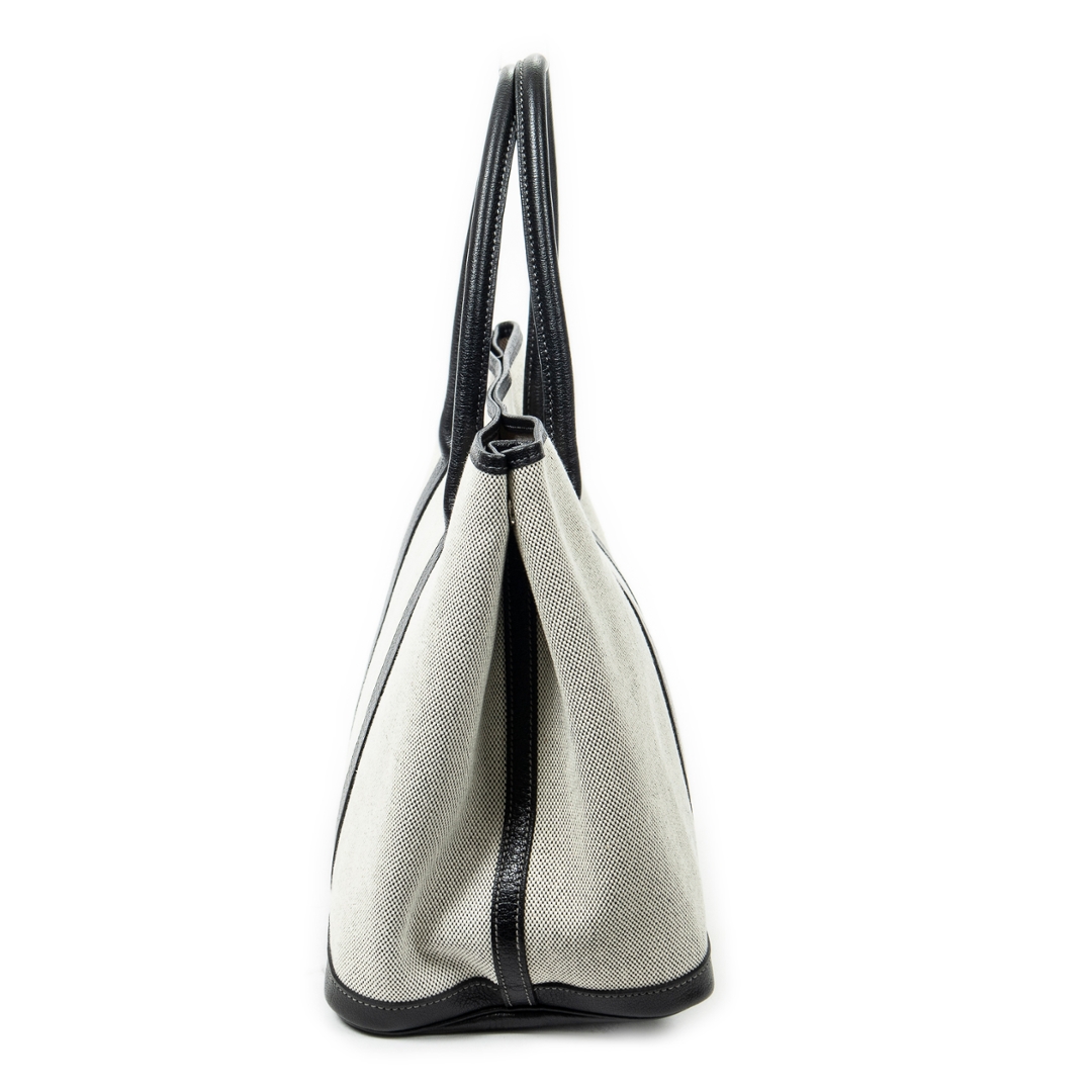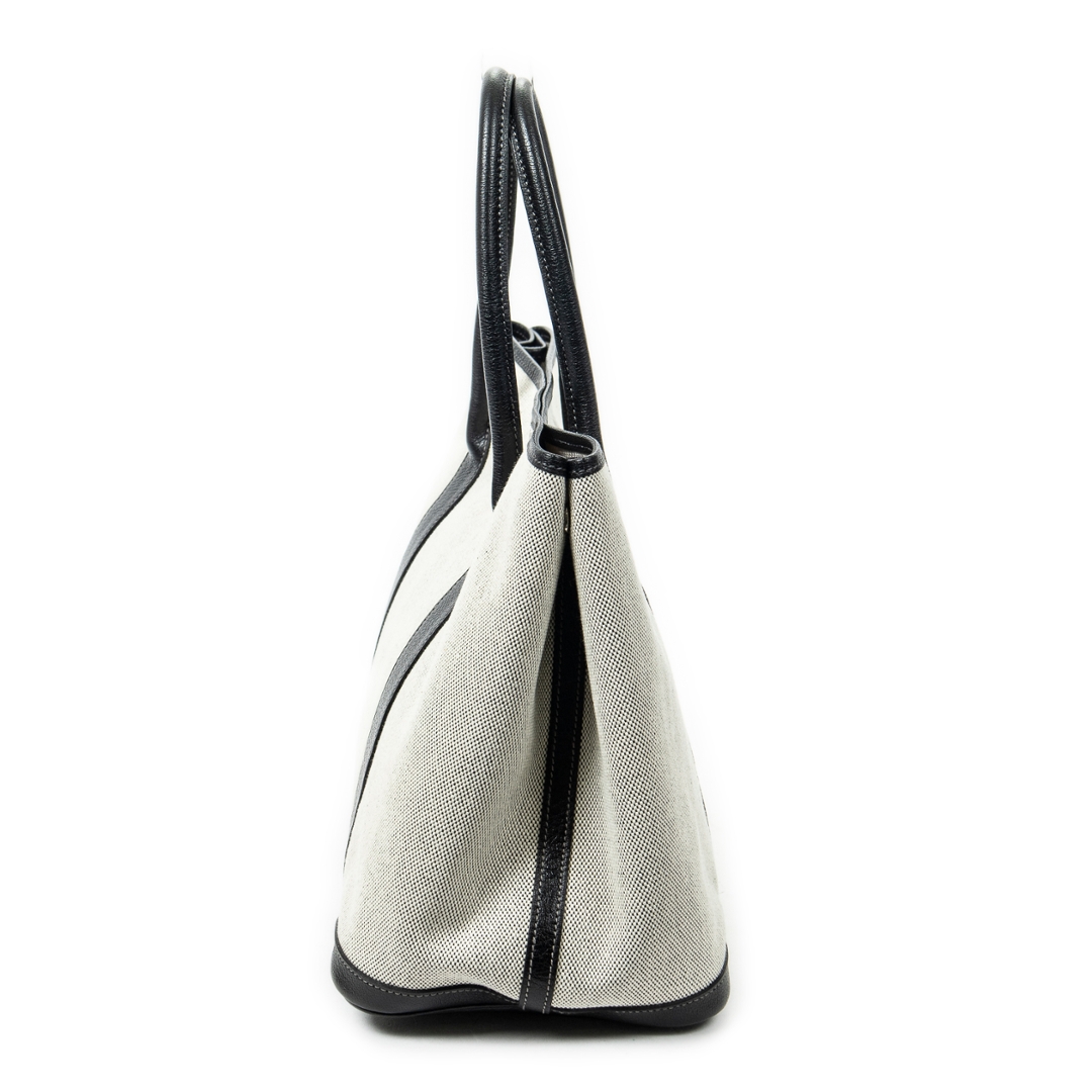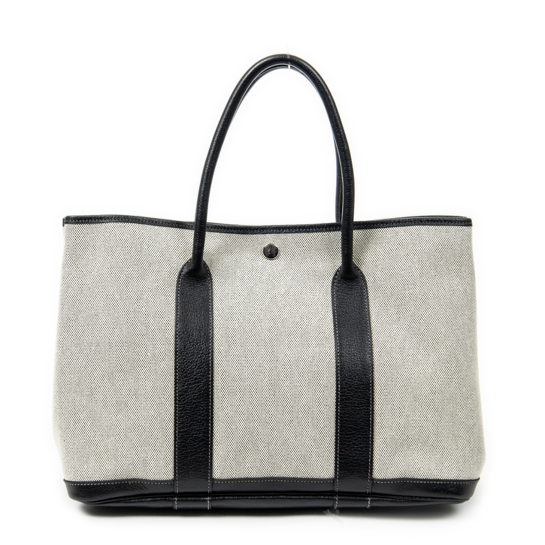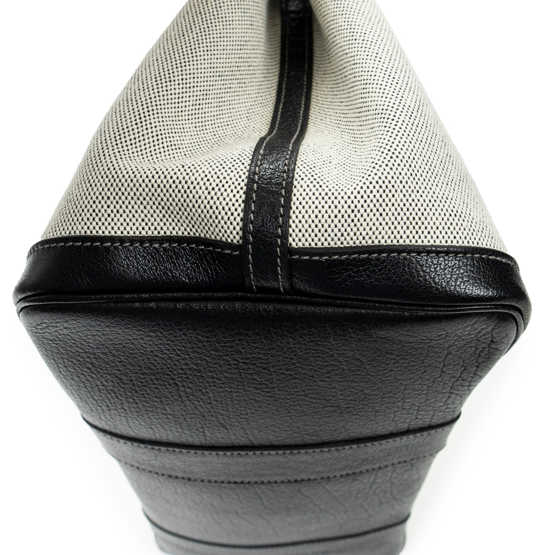 A vintage Hermès ivory and black canvas Garden Party bag, a refined and practical design that reflects the house’s effortless approach to everyday luxury. Crafted from durable canvas with contrasting black leather trim, the structured silhouette is both elegant and functional, while the subtle snap closure maintains a clean and understated finish.