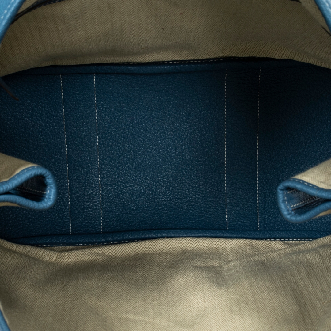 A Hermès Garden Party bag crafted in Blue Jean calf leather, offering a refined yet relaxed interpretation of one of the house’s most versatile designs. The softly structured silhouette is complemented by tonal stitching and clean leather paneling, while the subtle snap-button closure maintains the bag’s understated aesthetic. The distinctive Blue Jean shade adds a fresh, contemporary edge to a timeless Hermès staple.