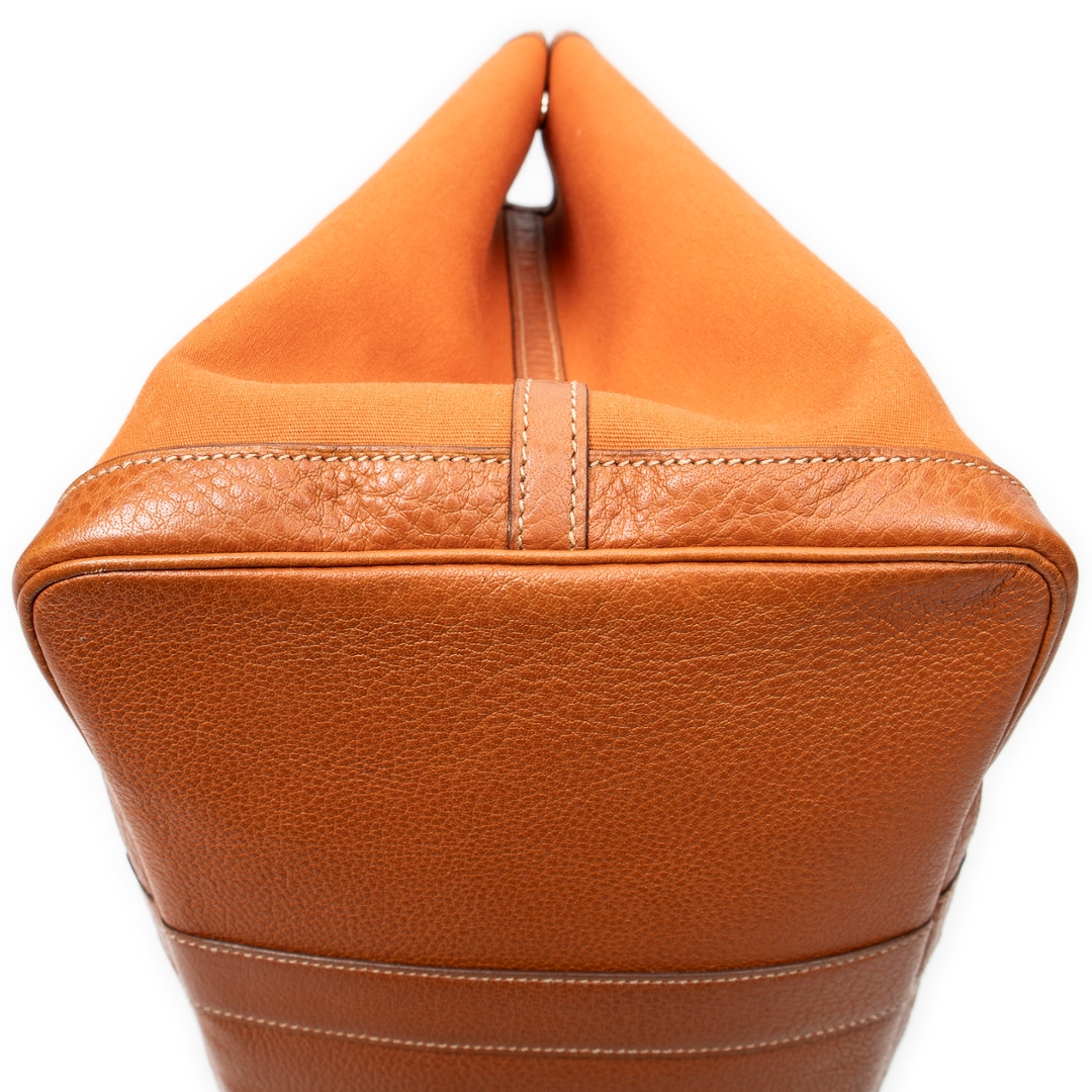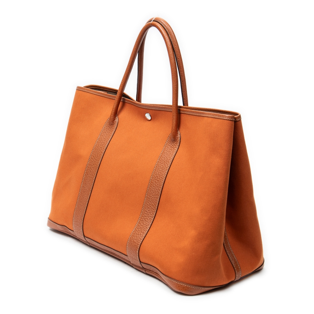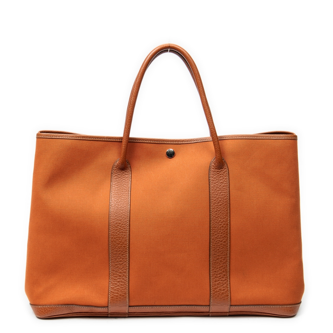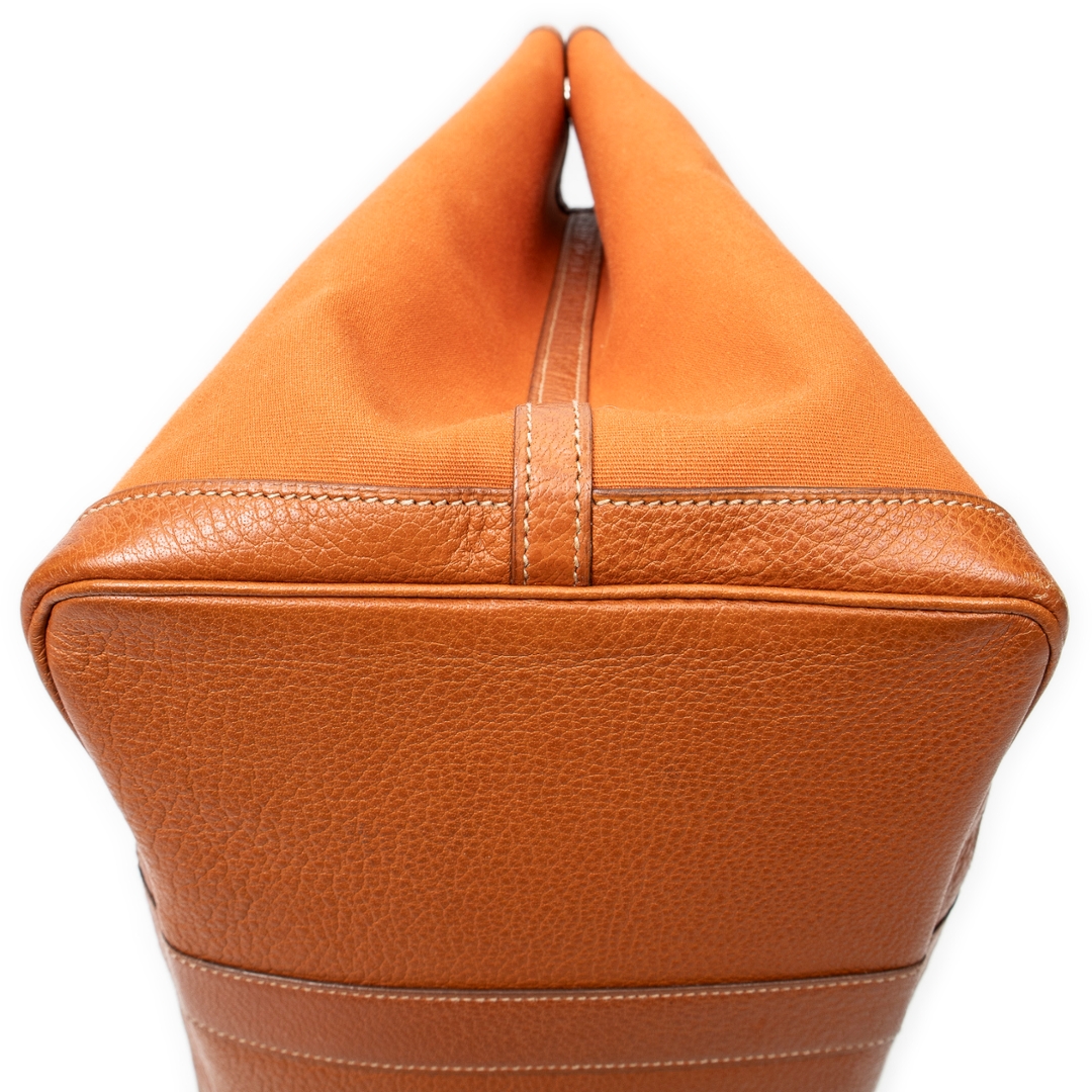 A vintage Hermès Garden Party bag crafted in a rich orange canvas, complemented by warm brown leather trim and handles. This larger-format example highlights the effortless sophistication the style is known for, with its structured silhouette, clean lines, and signature snap closure. The bold yet classic colour combination delivers a confident statement while remaining highly versatile for everyday use.