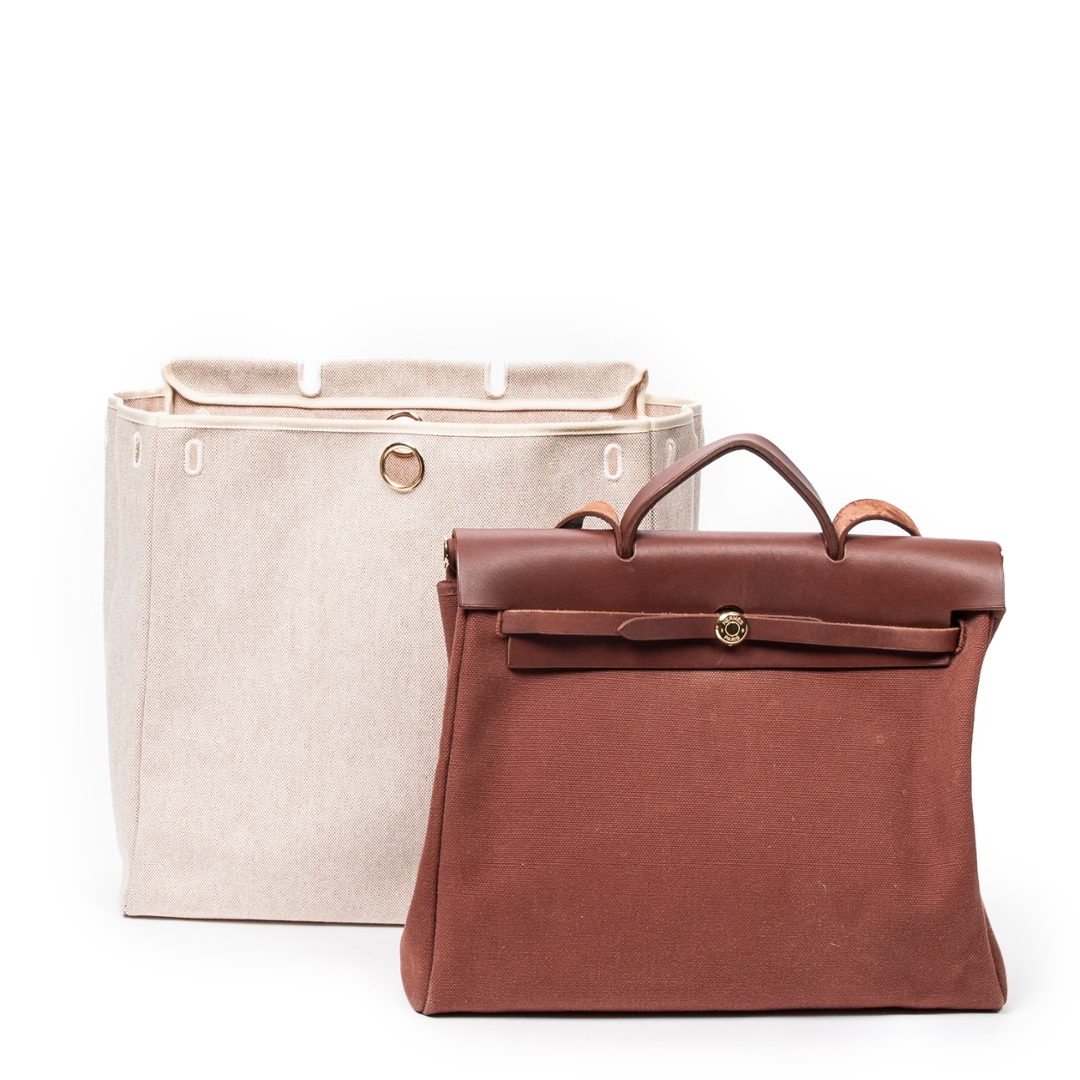 A vintage Hermes beige/brown canvas Herbag bag with a certificate of authenticity, Approx 38cm height, 39cm width.