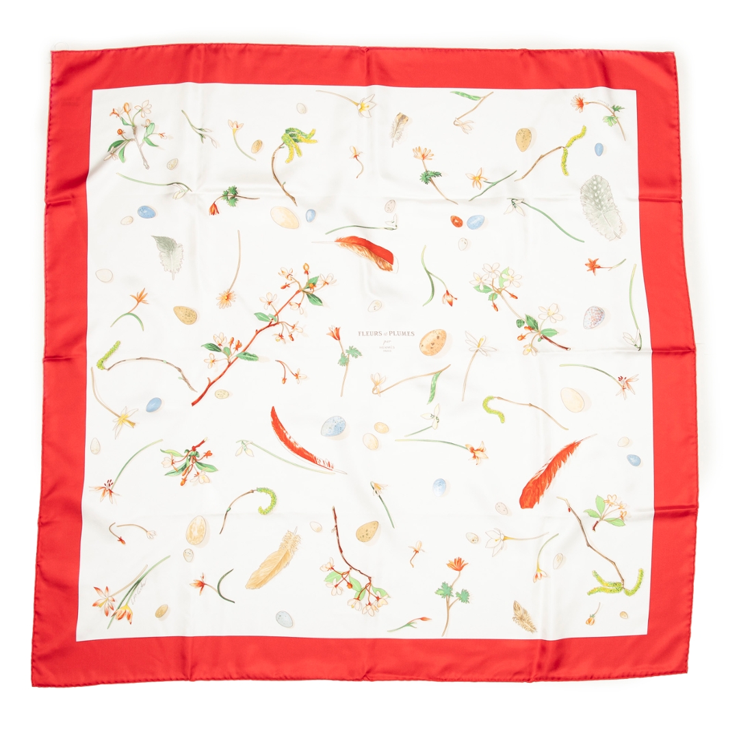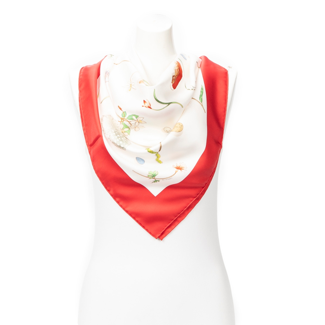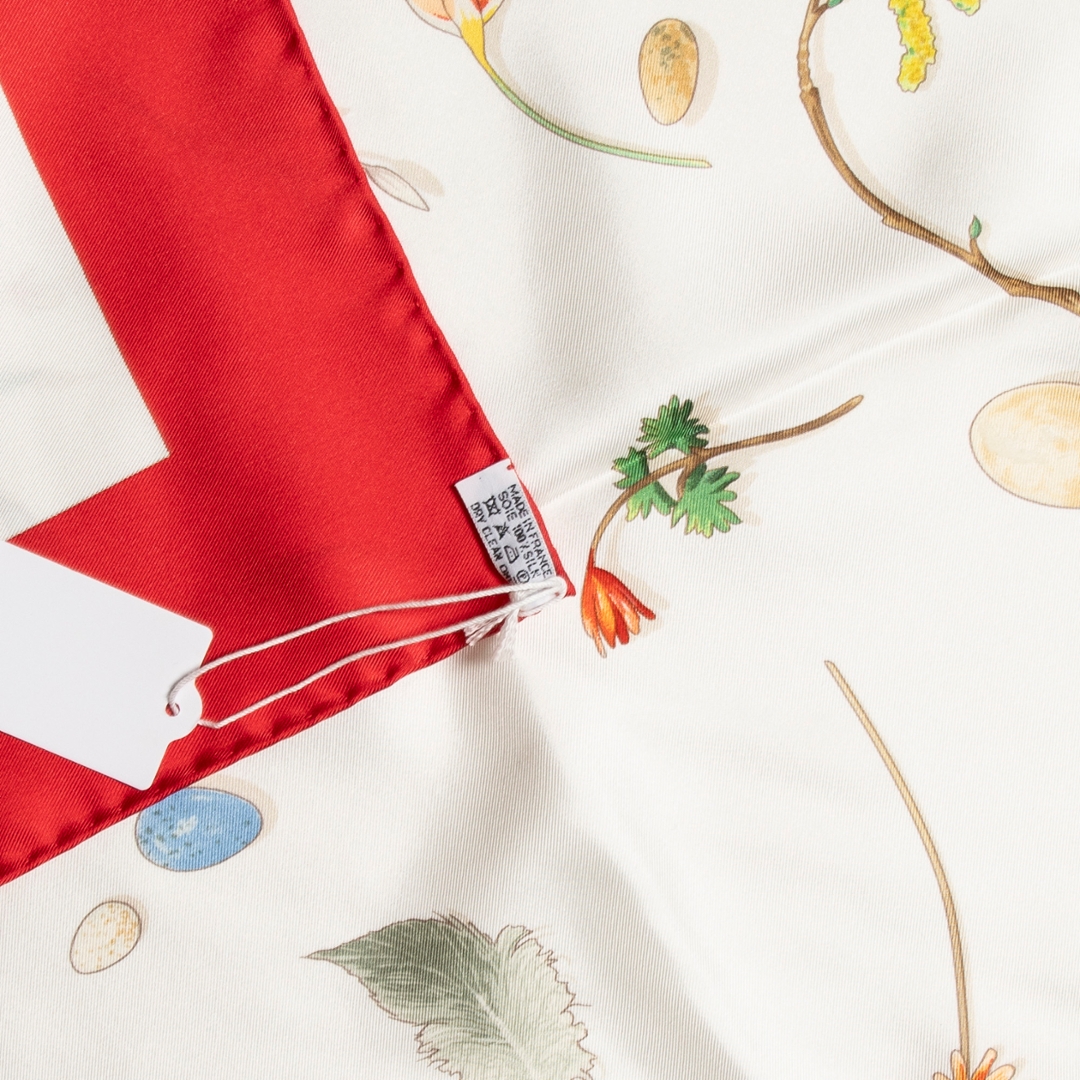 A vintage Hermes ivory/red silk Scarf with a certificate of authenticity. Approx 90cm height, 90cm width.