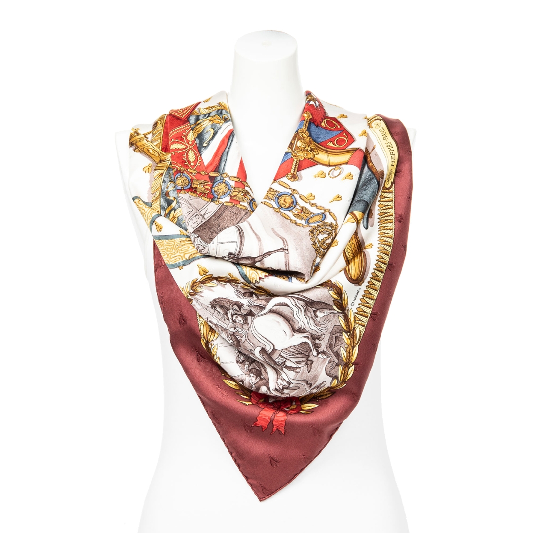 A vintage Hermes burgundy/ivory silk Scarf with a certificate of authenticity, Approximately 90cm height, 90cm width.