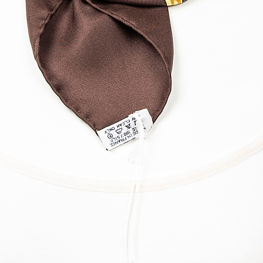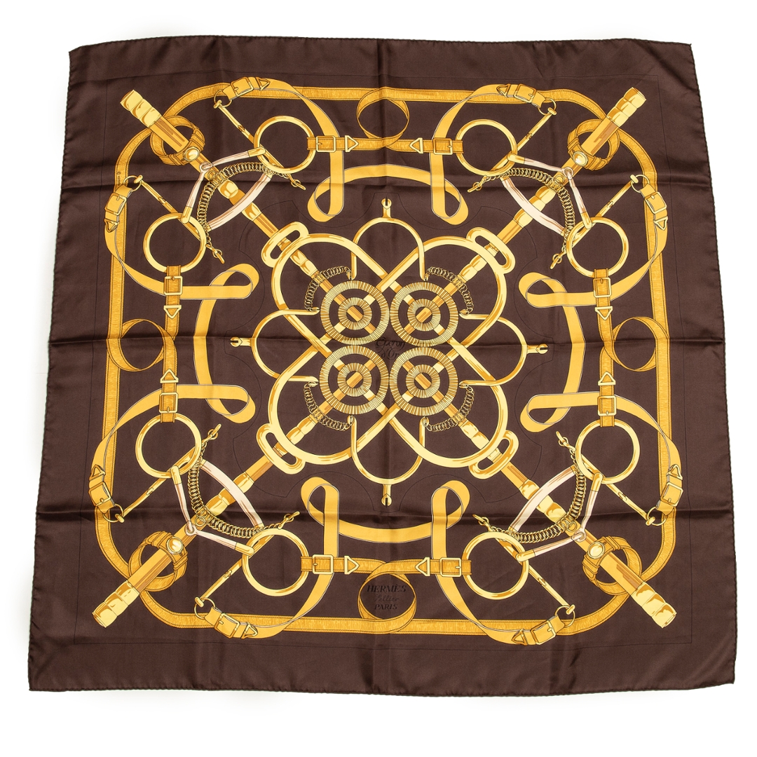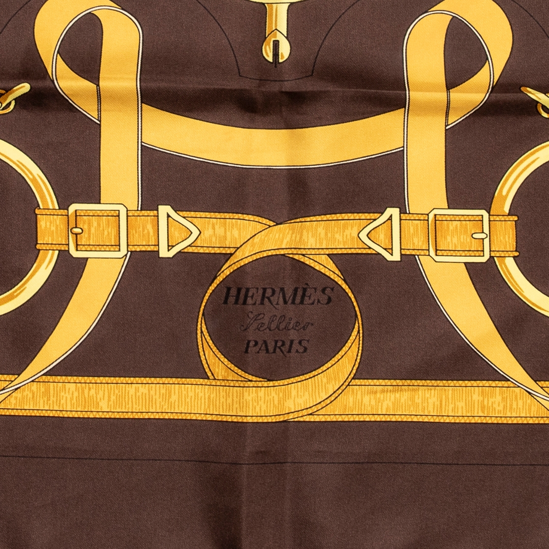A vintage Hermes dark brown/gold silk Scarf with a certificate of authenticity, Approximately 90cm height, 90cm width.