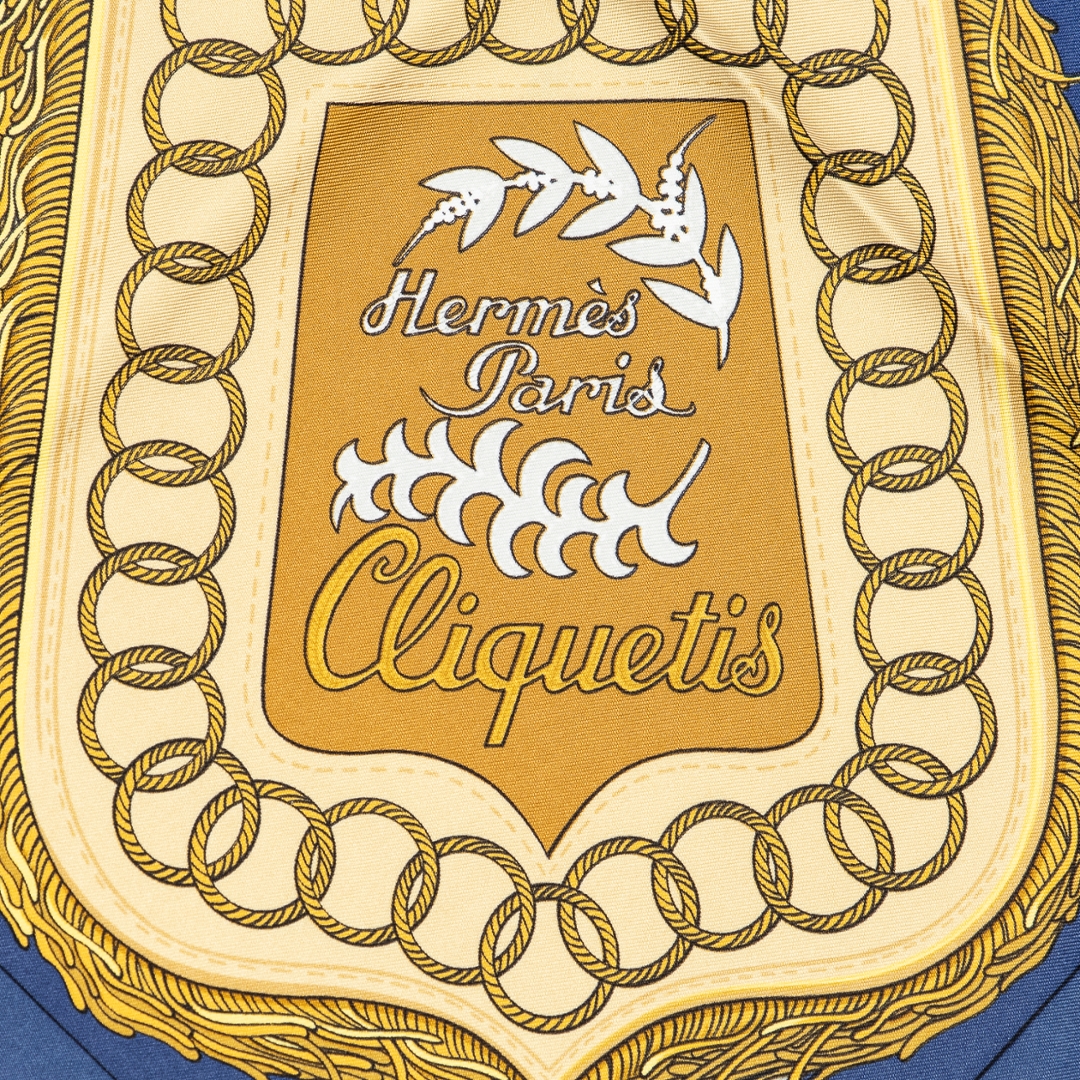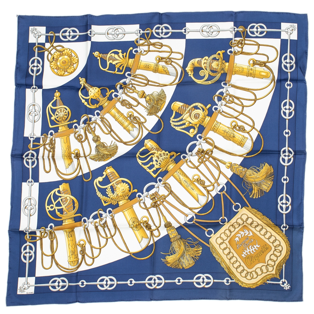 A vintage Hermes navy/white silk Scarf with a certificate of authenticity, Approximately 90cm height, 90cm width.