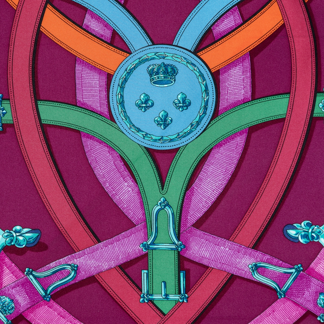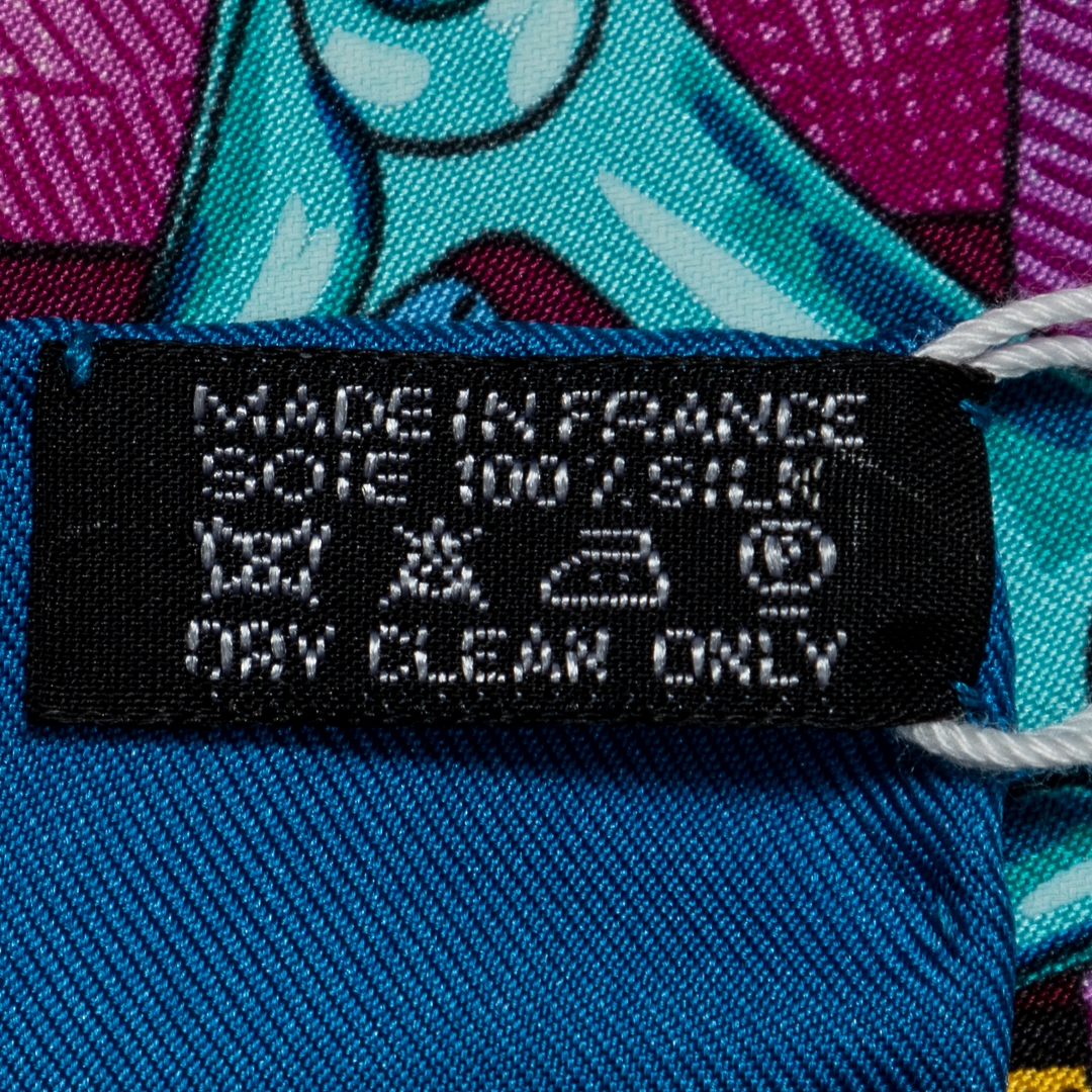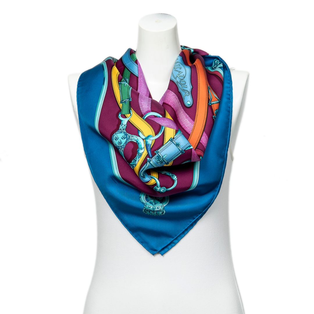 A vintage Hermes blue/pink silk Scarf with a certificate of authenticity. Approximately 90cm height, 90cm width.
