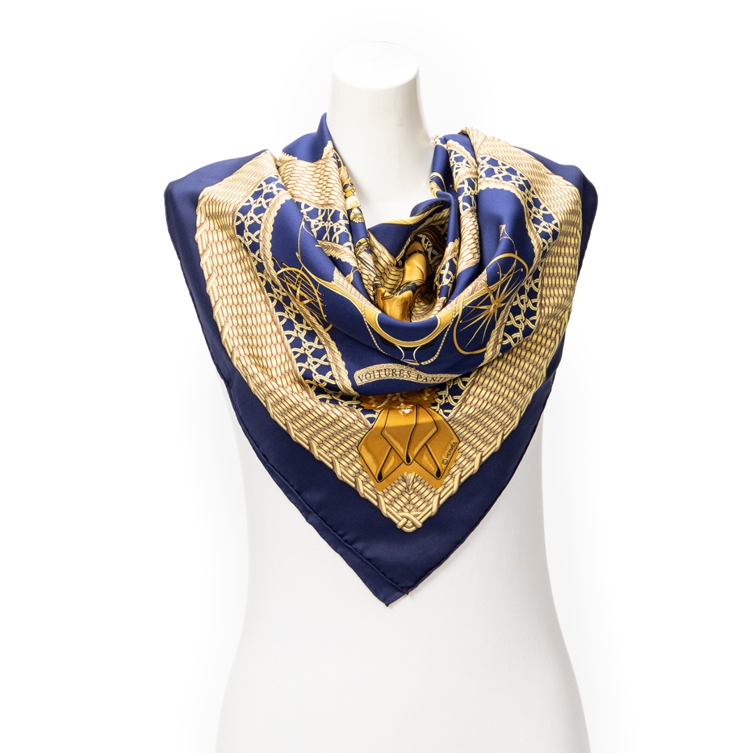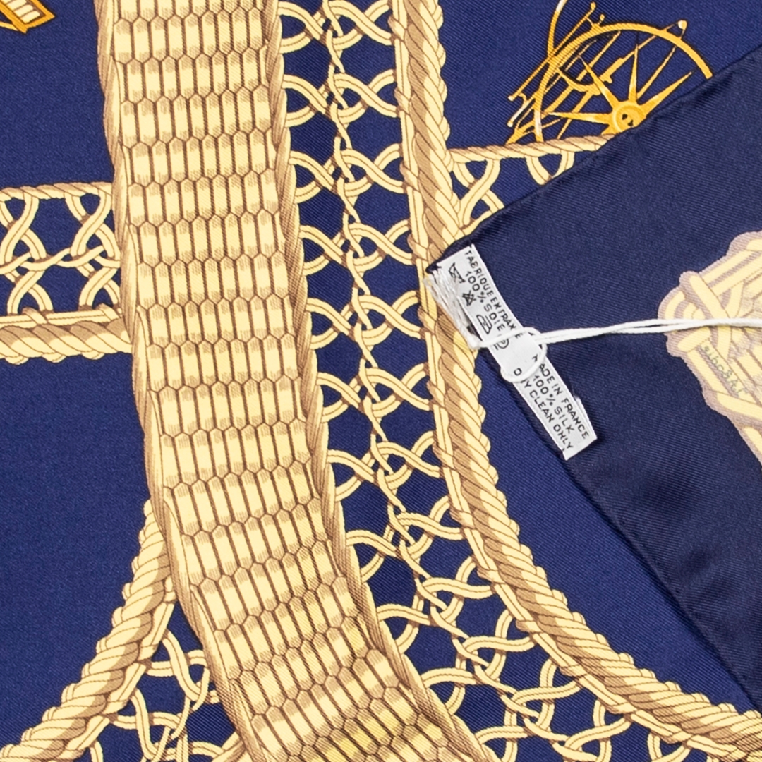 A vintage Hermes navy/gold silk Scarf with a certificate of authenticity. Approx 90cm height, 90cm width.
