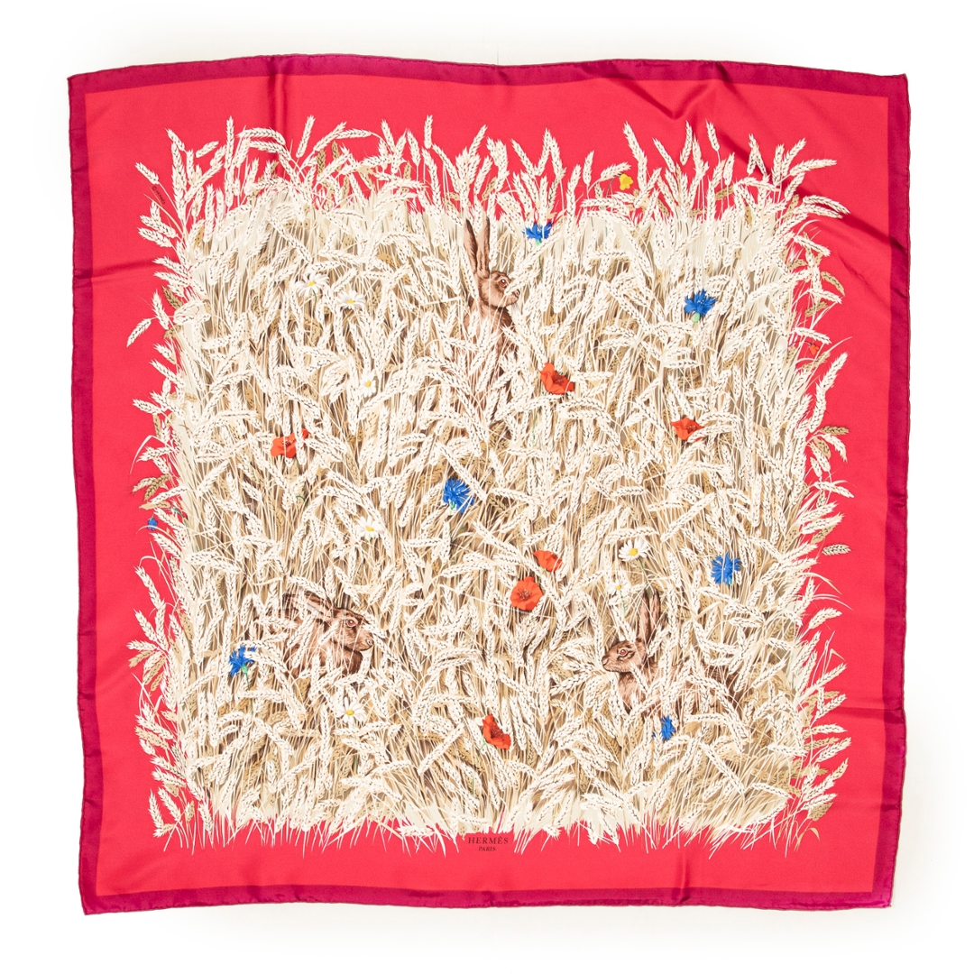 A vintage Hermès silk scarf presented in a rich maroon and beige colourway, beautifully accented with delicate botanical detailing. Crafted from luxurious silk, this carré showcases an elegant wheat and floral motif, brought to life with subtle blue highlights that add depth and visual interest against the warm-toned background.