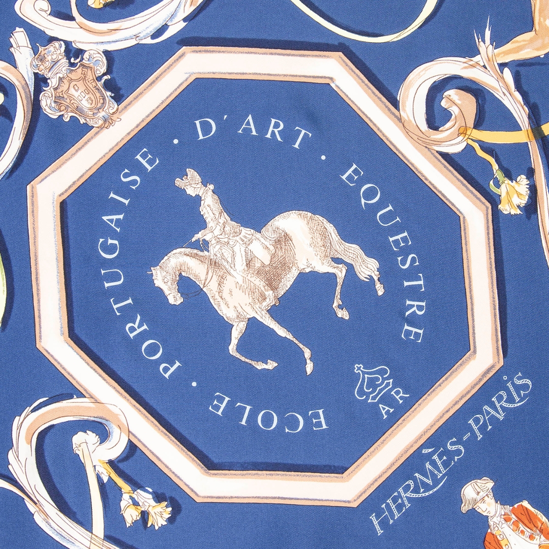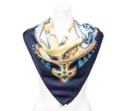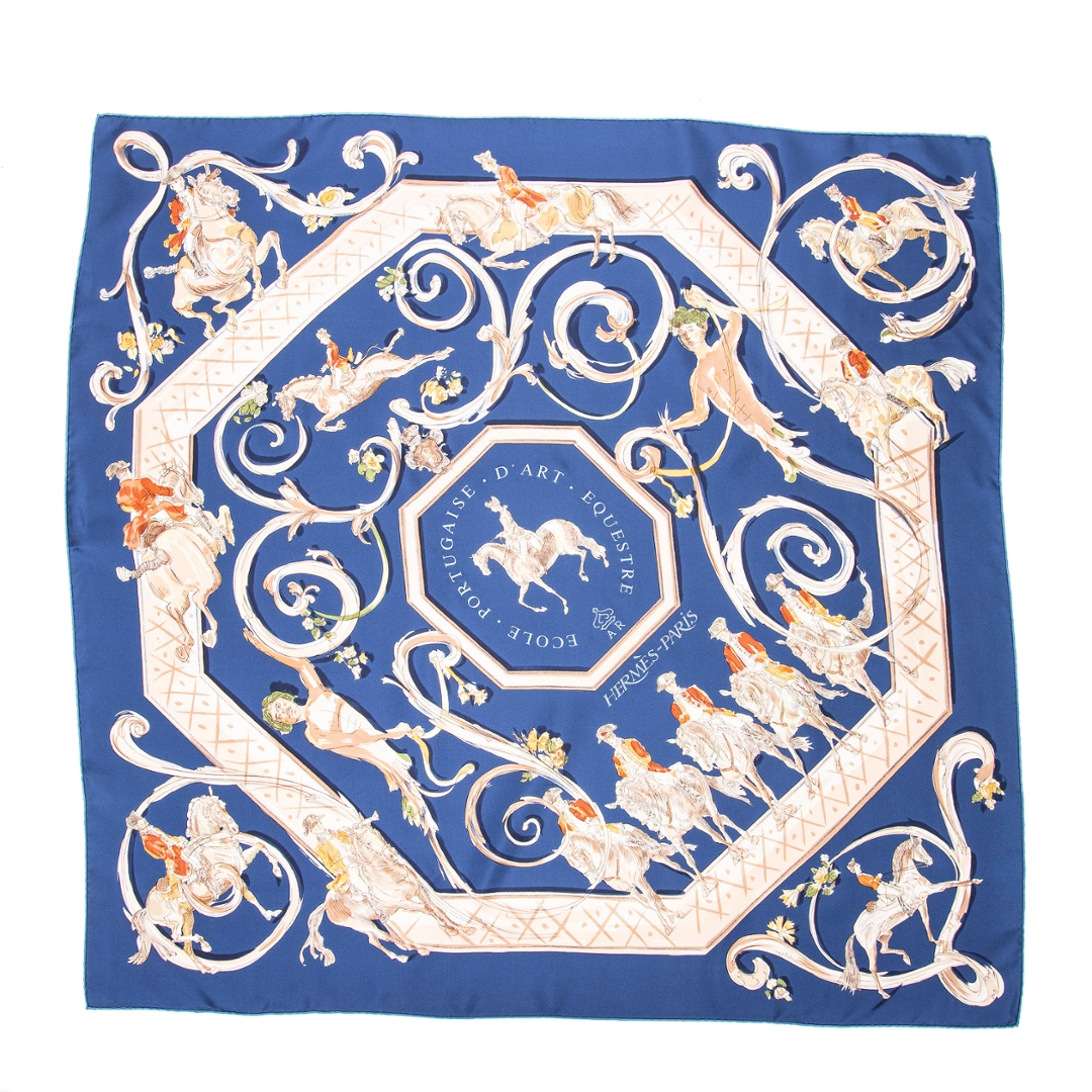 A vintage Hermes blue/beige silk Scarf with a certificate of authenticity. Approximately 90cm height, 90cm width.