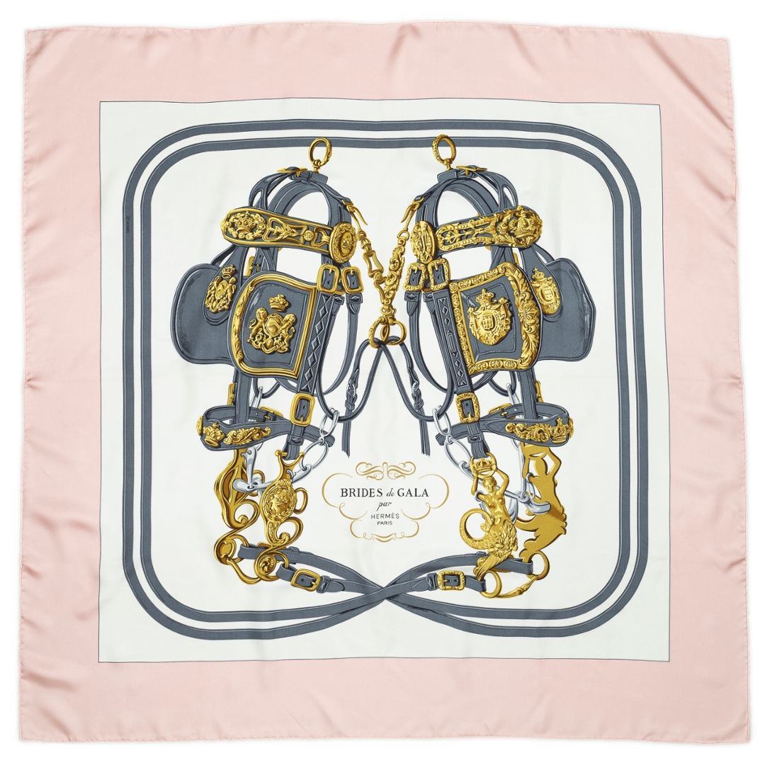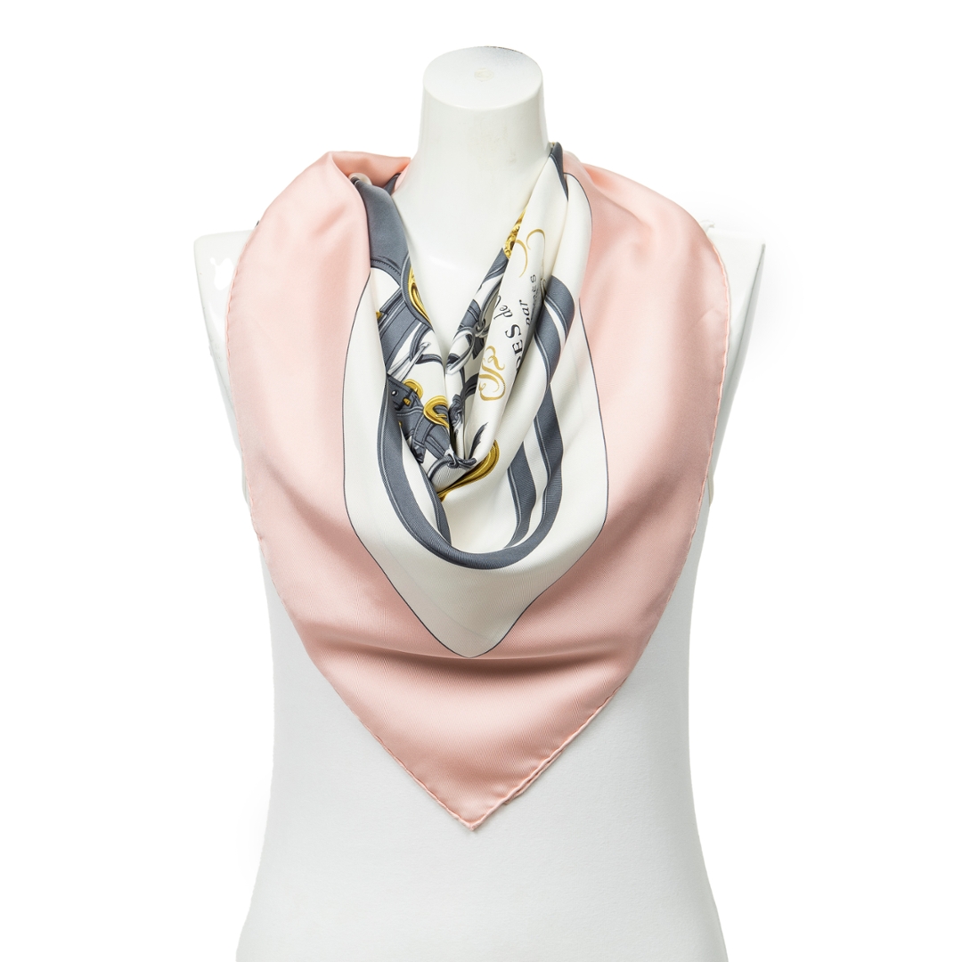 A vintage Hermes pink/ivory silk Scarf with a certificate of authenticity. Approximately 90cm height, 90cm width.