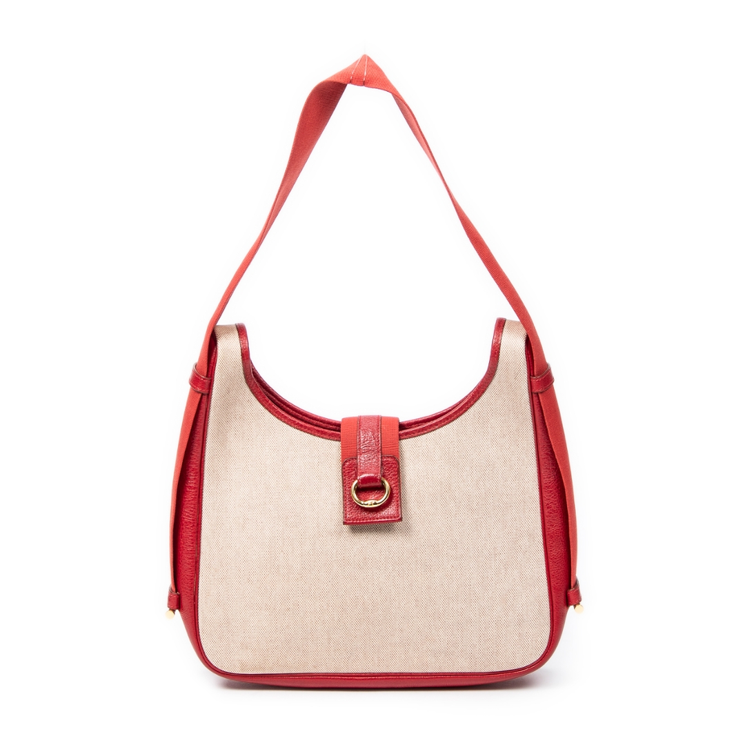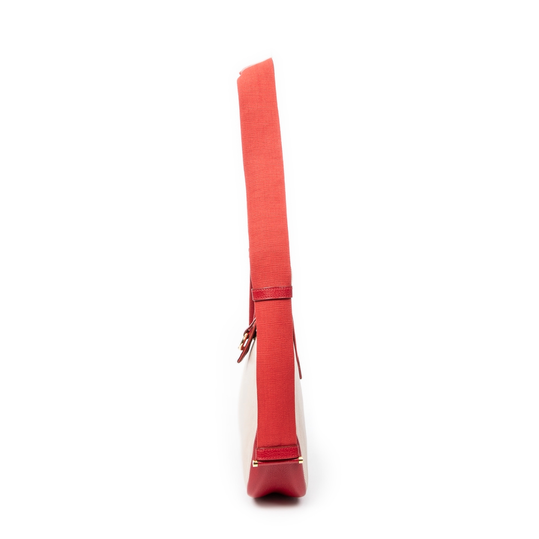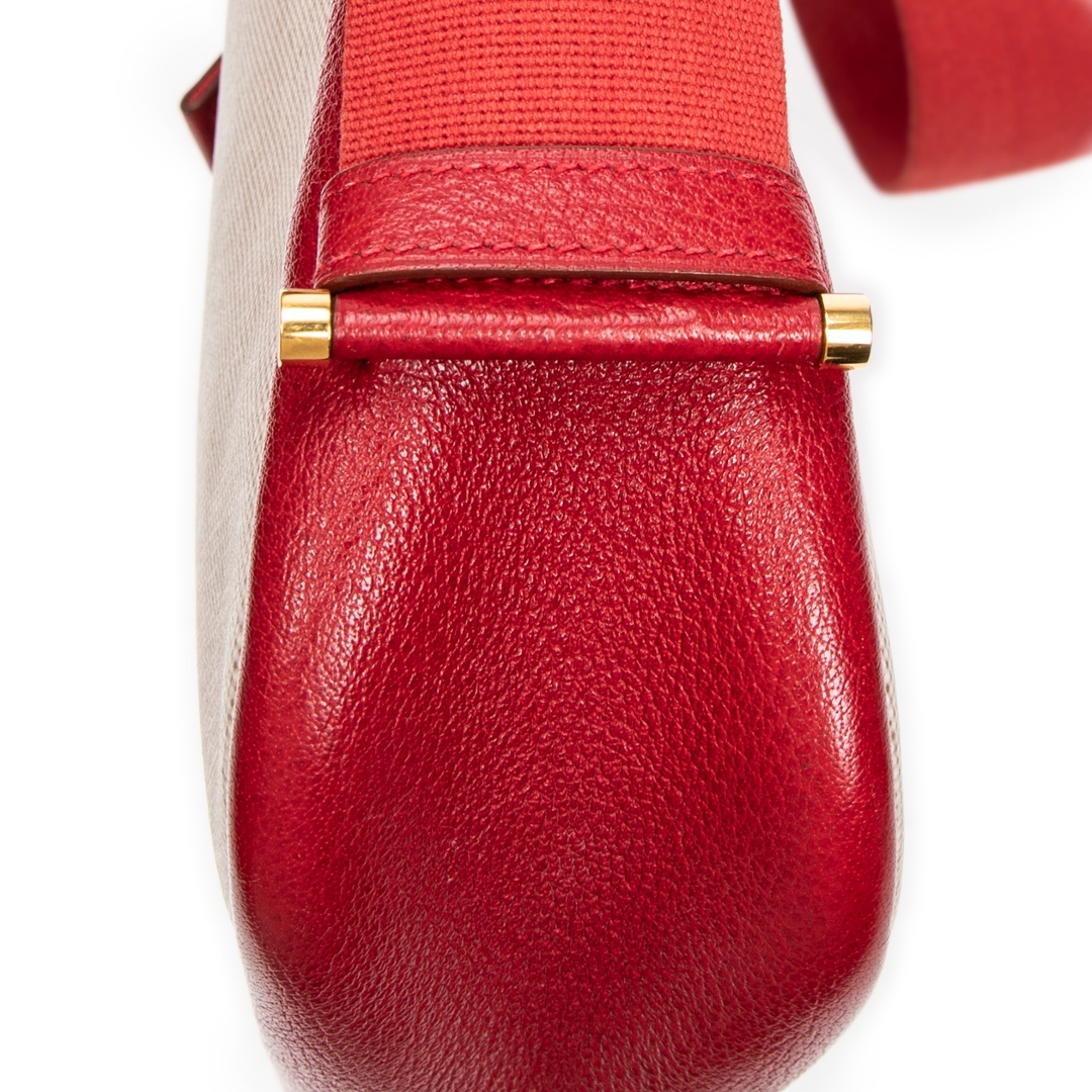 A vintage Hermès Tsako bag crafted in beige coated canvas, elevated by striking red leather trim and matching shoulder strap. This distinctive design showcases Hermès’ refined balance of casual elegance and practical luxury, with the structured silhouette complemented by smooth leather accents and a signature front strap detail with gold-tone hardware.