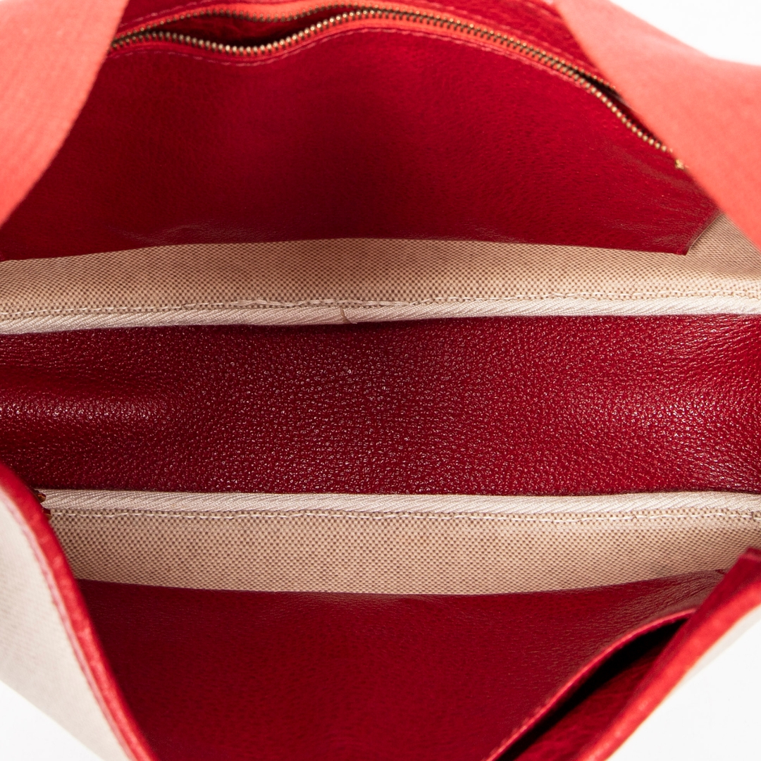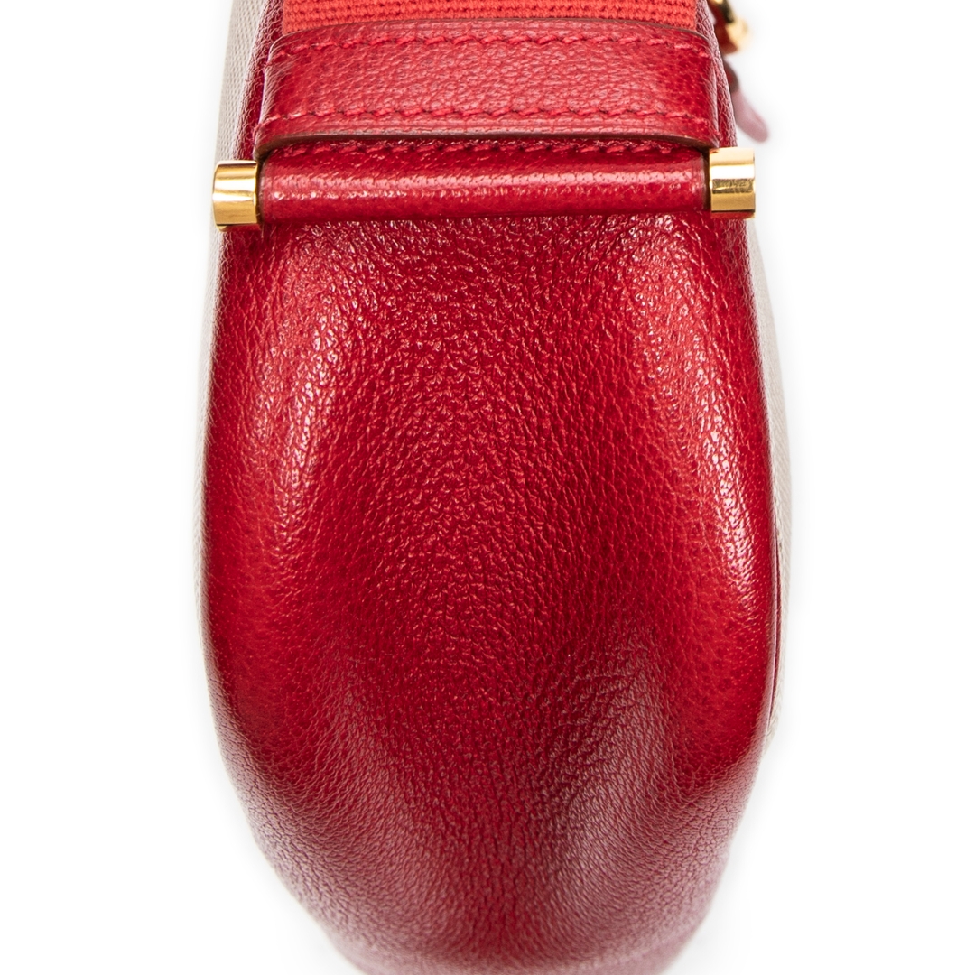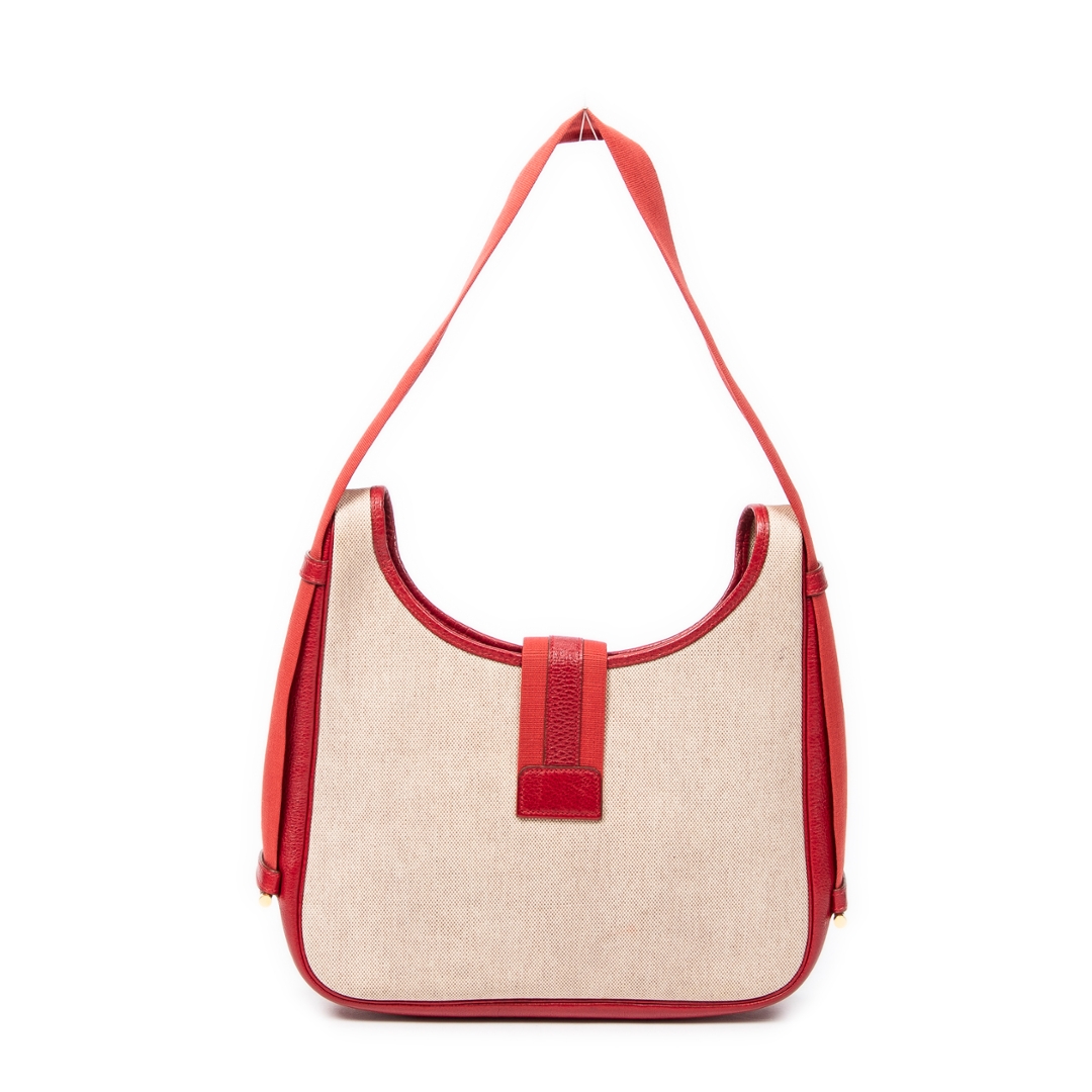 A vintage Hermès Tsako bag crafted in beige coated canvas, elevated by striking red leather trim and matching shoulder strap. This distinctive design showcases Hermès’ refined balance of casual elegance and practical luxury, with the structured silhouette complemented by smooth leather accents and a signature front strap detail with gold-tone hardware.