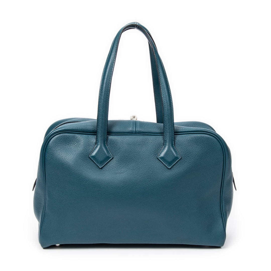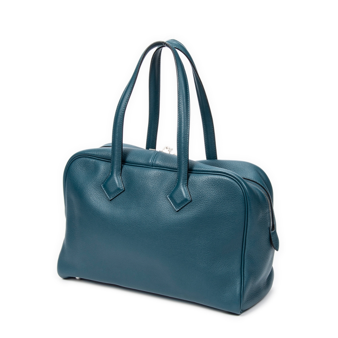 A vintage Hermès Victoria II bag crafted in rich blue calf leather, offering a refined balance of practicality and timeless elegance. The softly structured silhouette is enhanced by clean lines and dual top handles, creating a versatile design that transitions seamlessly from everyday use to more elevated occasions.