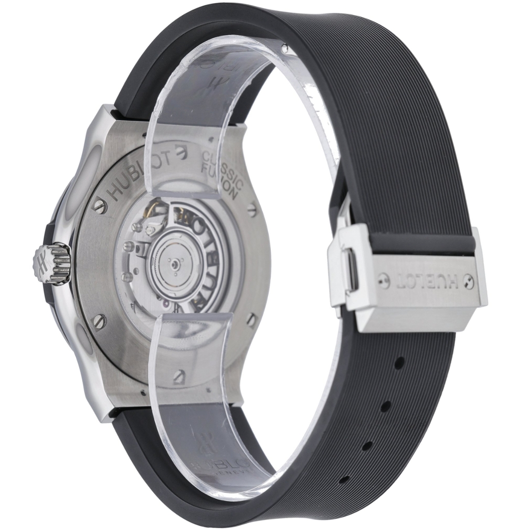 In good condition, this Hublot Classic Fusion is not just a stylish accessory but also a sound investment. The watch market has shown consistent appreciation for Hublot models, particularly those with unique design elements such as a titanium case and a black rubber strap. Accompanied by the original Hublot paperwork, a watch register certificate, and its original box, this timepiece's authenticity and collectable value are well-documented. The 24-month WLC warranty further ensures its quality and reliability, providing potential buyers with peace of mind.