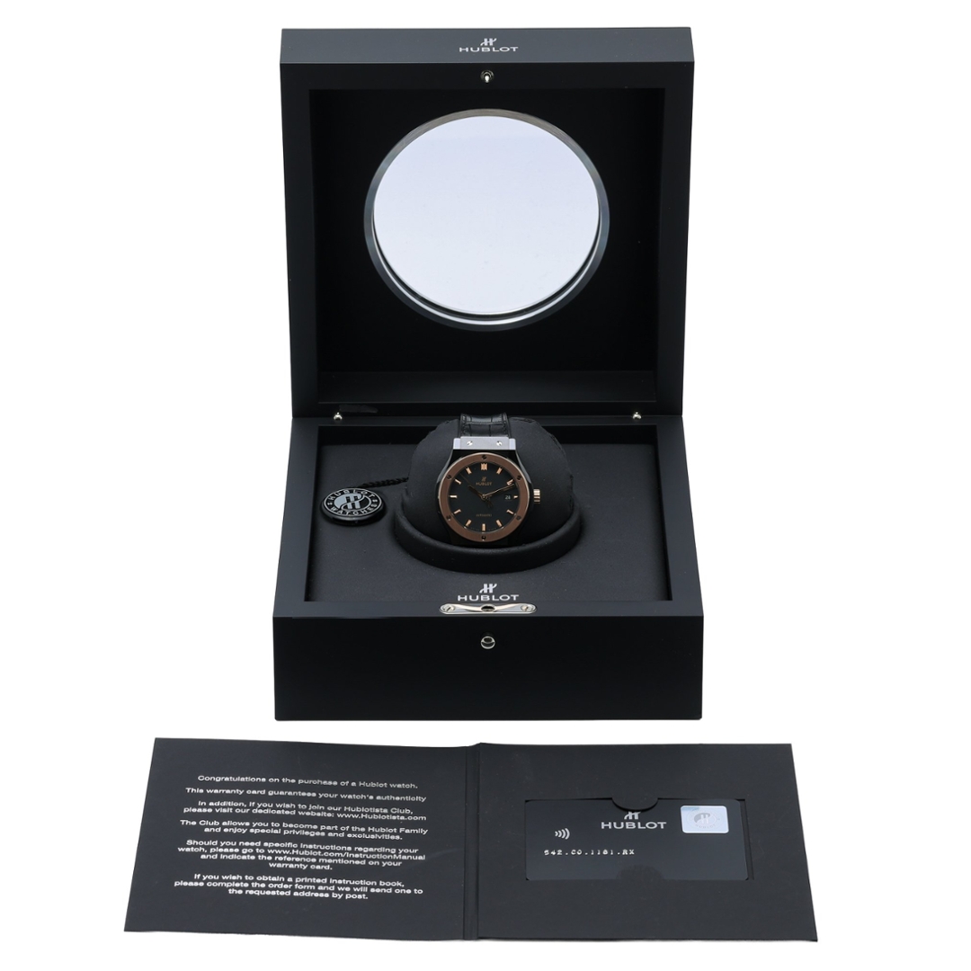 A Hublot Classic Fusion, reference 542.CO.1181.RX, representing the perfect balance of contemporary design and refined craftsmanship. This 42mm model combines a striking black ceramic case with an 18ct King Gold bezel, creating a bold yet sophisticated contrast that defines Hublot’s iconic fusion philosophy. The matte black dial, accented with gold hour markers and hands, exudes understated elegance, while the discreet date aperture at 3 o’clock adds practical functionality.