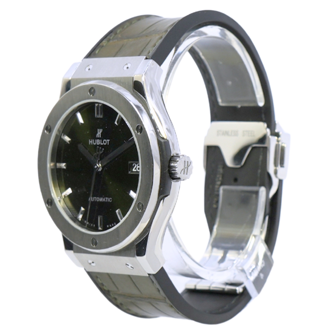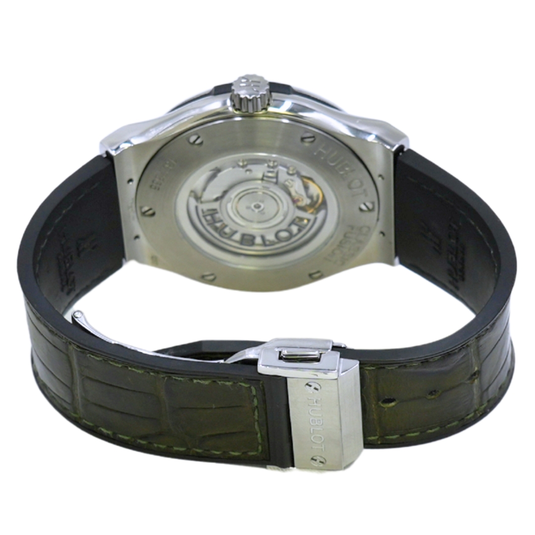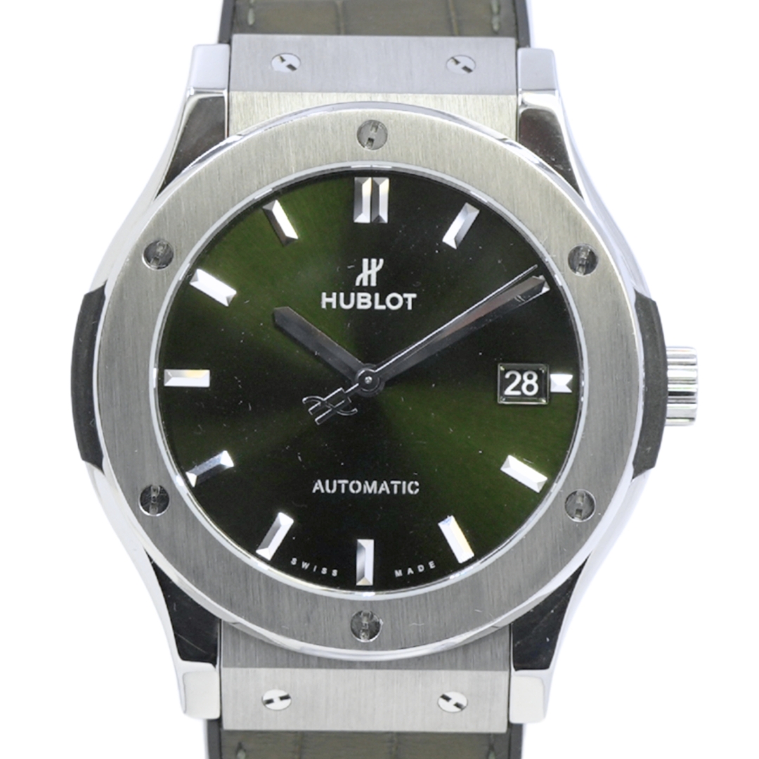A Hublot Classic Fusion Titanium Green Watch, Green Rubber Strap with a Titanium Case & Clasp on a Green Dial