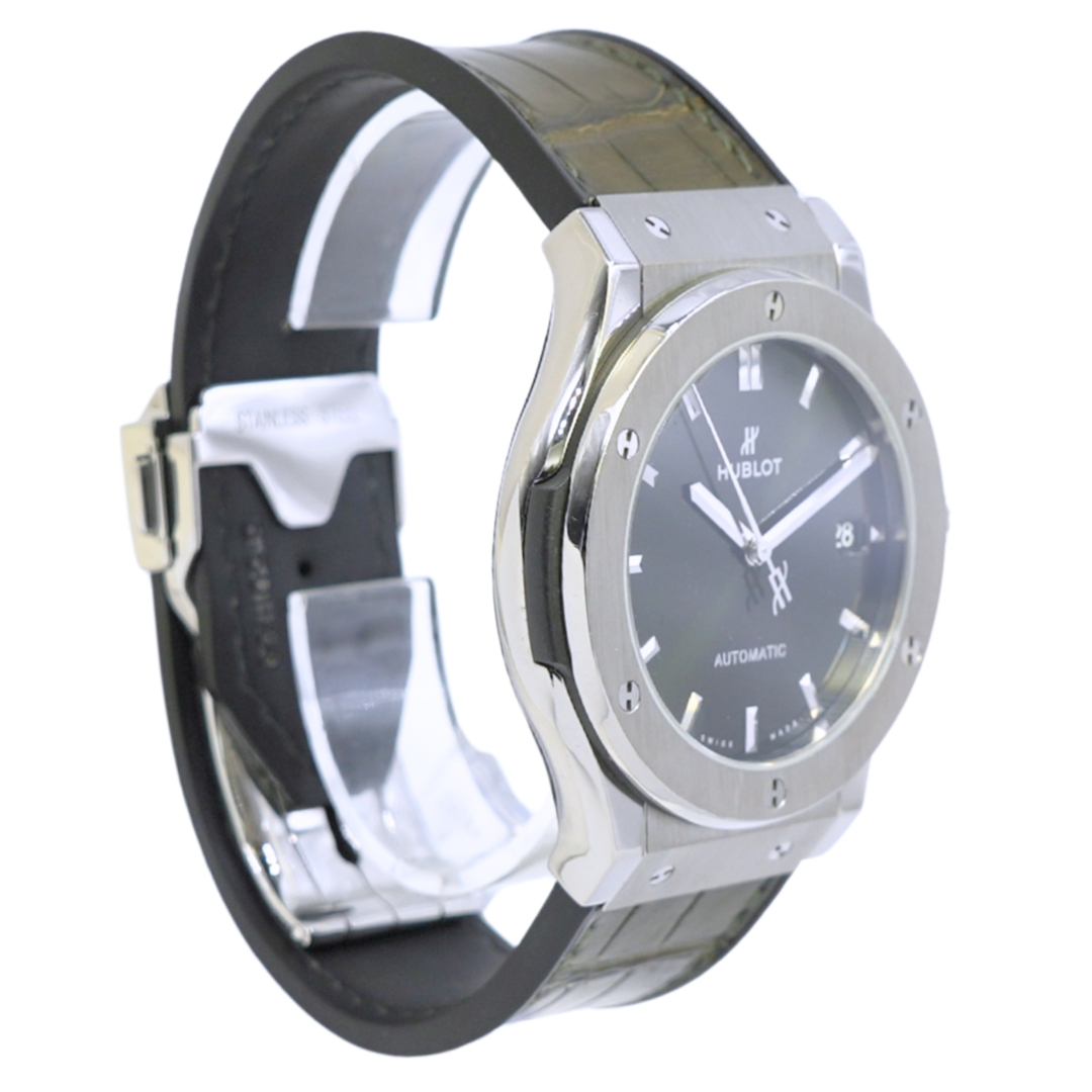 A Hublot Classic Fusion Titanium Green 511.NX.8970.LR is a bold yet refined statement piece, crafted with the modern collector in mind. Its 45mm case, made from lightweight and durable titanium, is paired with a matching titanium clasp and a green rubber-lined alligator leather strap, combining strength, comfort, and sophistication. The satin-finished green dial adds depth and vibrancy, beautifully complemented by rhodium-plated hands and indices, with a discreet date display at 3 o’clock.