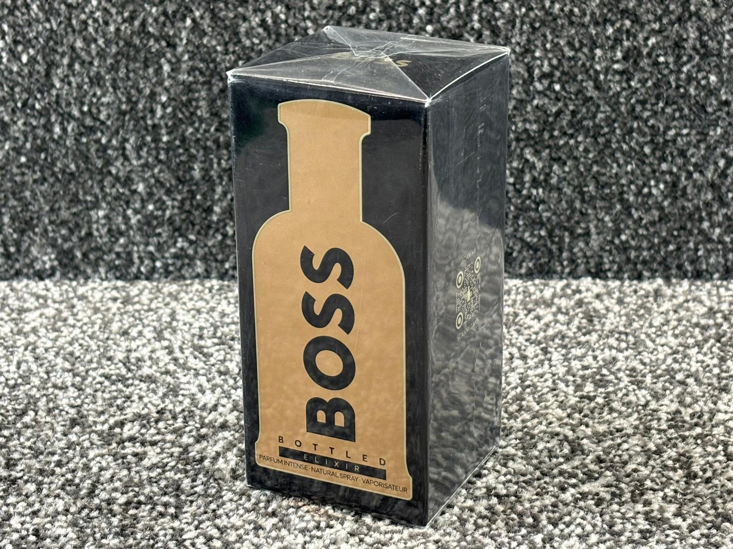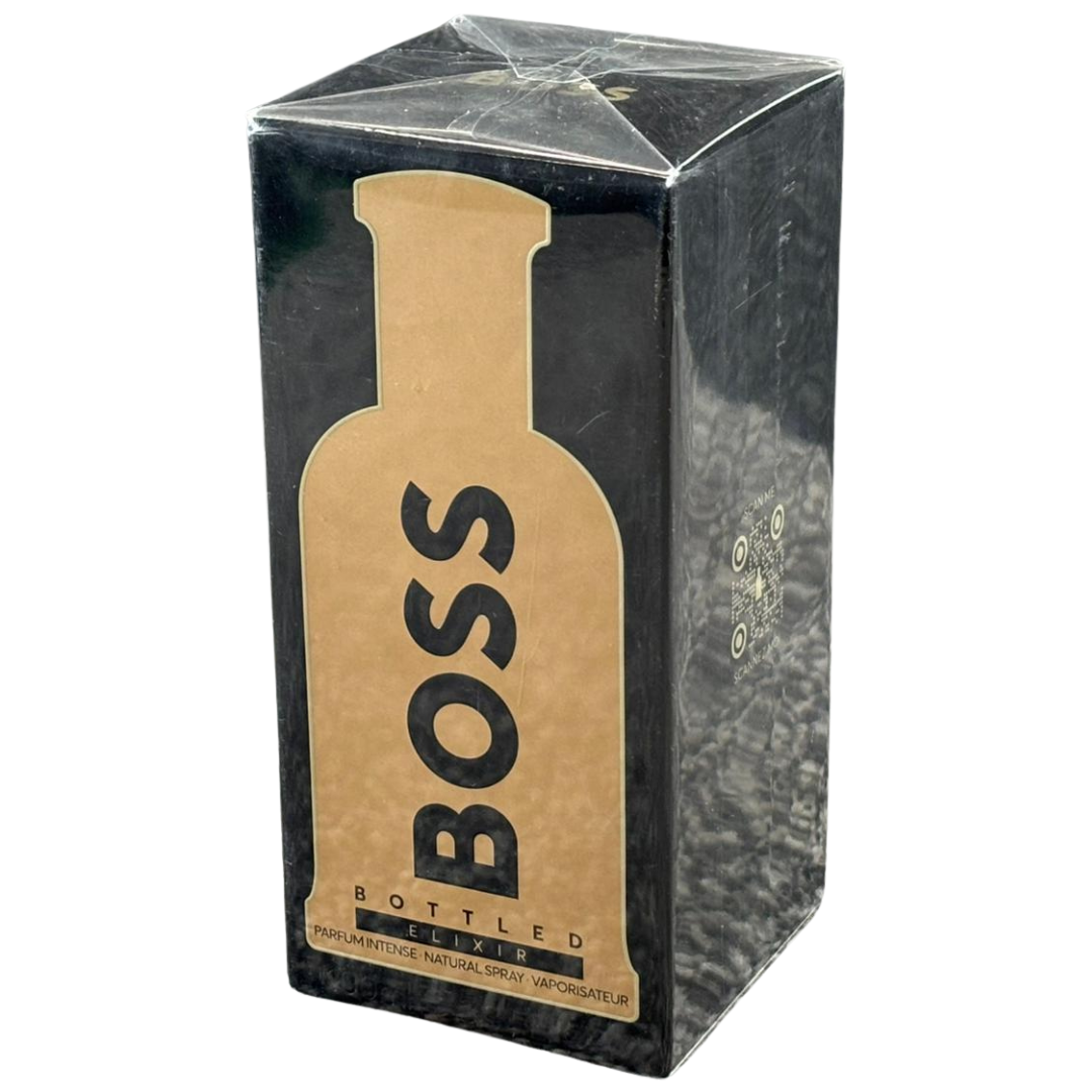 A 100ml bottle of Hugo Boss Bottled Elixir Parfum Intense, presented in its original presentation box and offering a powerful, refined evolution of the iconic Boss Bottled fragrance line. This elixir interpretation elevates intensity and depth, reflecting Hugo Boss’s modern vision of confident, self-assured masculinity.