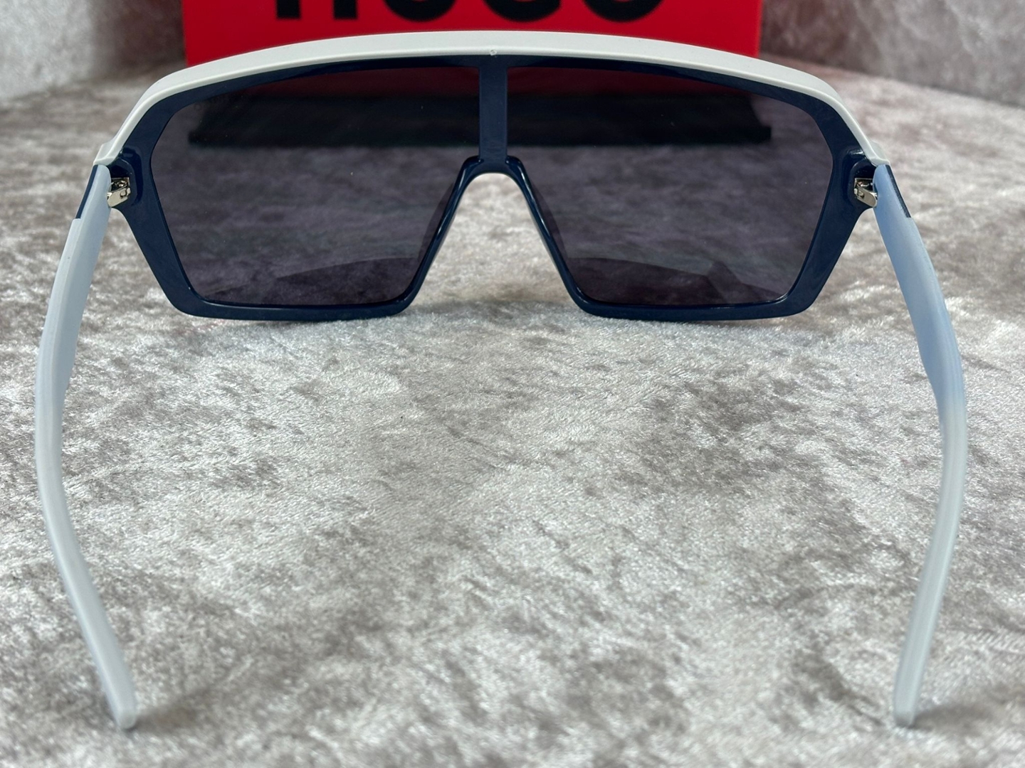 A Brand new and unused, these Hugo Boss Mask sunglasses make an immediate impact with their bold, sport-inspired silhouette. The striking blue grey colourway combines a structured white upper frame with deep blue detailing, creating a dynamic contrast that feels modern and energetic. The oversized shield-style lens delivers a streamlined, wraparound look, offering both visual impact and confident everyday wear.