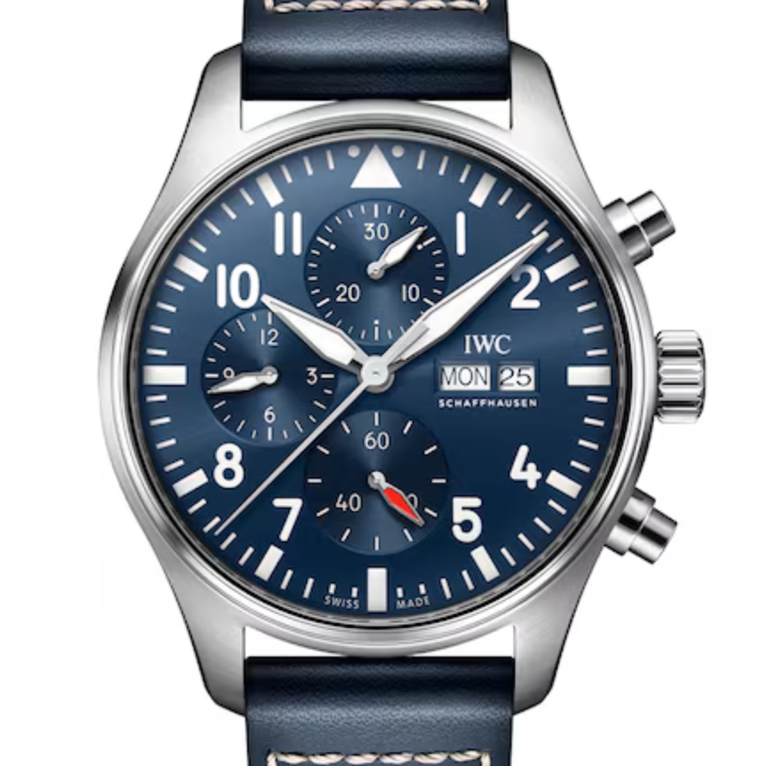 An IWC Pilot’s Chronograph reference IW378003 in stainless steel, presented on a blue leather strap with a matching steel clasp. The 44mm case delivers strong wrist presence while retaining the balanced proportions that define IWC’s aviation heritage. The rich blue dial features bold Arabic numerals, luminous hands and a classic tri-compax chronograph layout, offering outstanding legibility inspired by cockpit instrumentation.