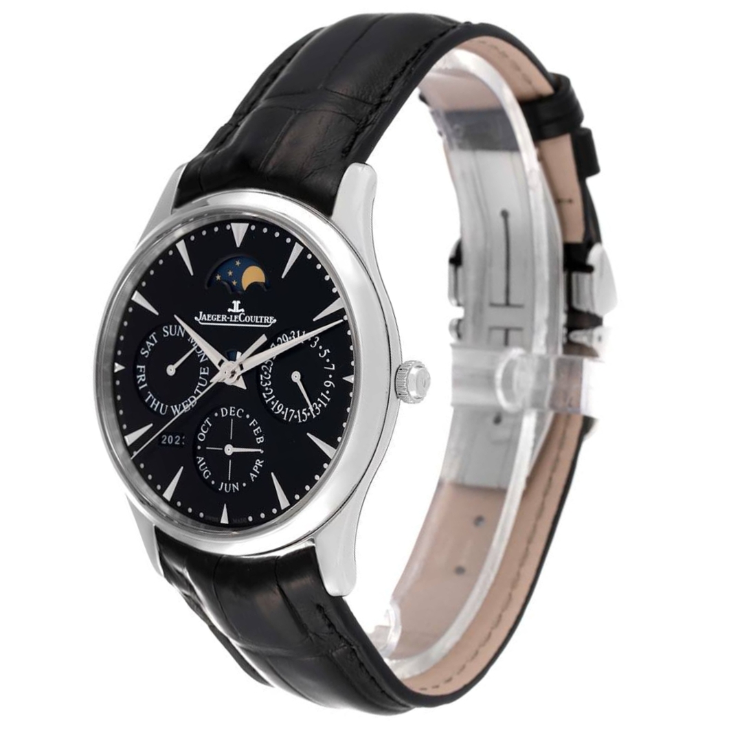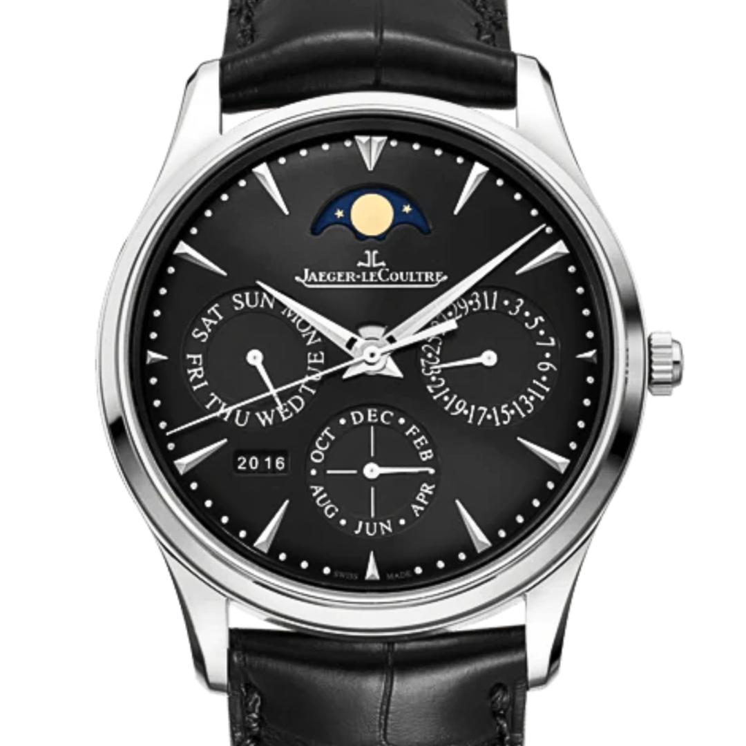 A Jaeger Le Coultre Master Ultra Thin Watch is a sophisticated expression of haute horology, this Jaeger-LeCoultre Master Ultra Thin reference JLQ1308470 showcases the brand’s mastery of elegant complications within a refined 39mm stainless steel case. The sleek black dial is beautifully balanced, featuring a complete calendar display with day, date, and month sub-dials, complemented by a striking moonphase aperture at 12 o’clock. Applied hour markers and dauphine hands enhance its understated aesthetic, while the black leather strap completes a timeless, versatile dress-watch profile.
