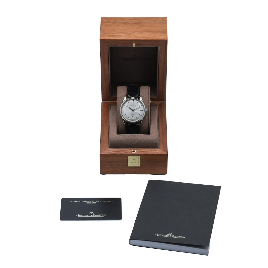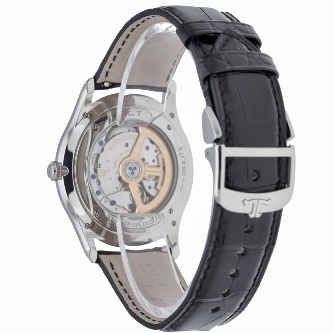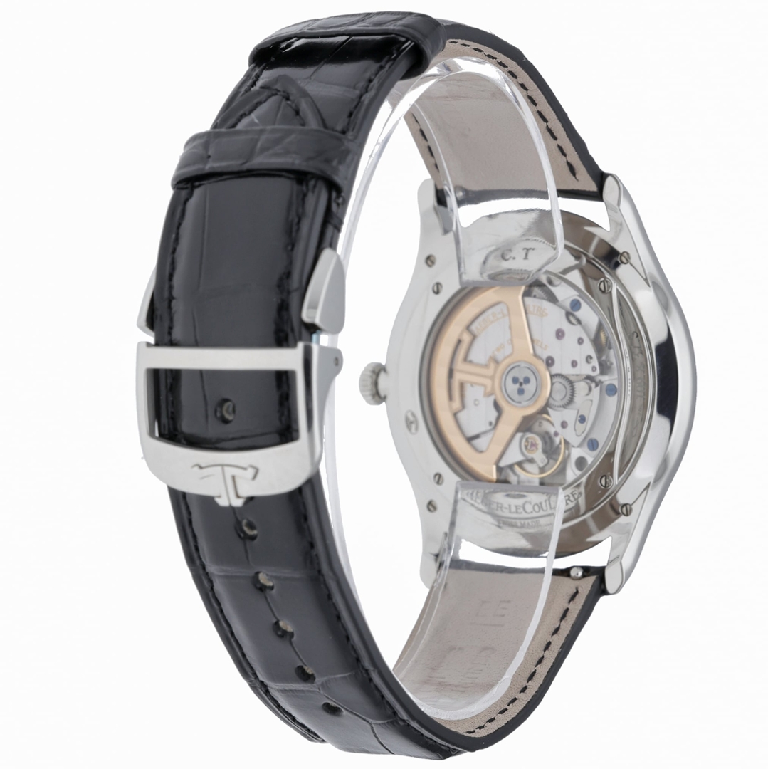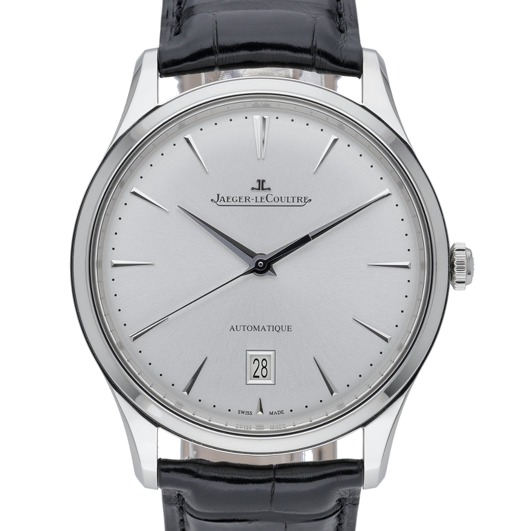 A Jaeger-LeCoultre Master Ultra Thin Date presented on a black leather strap, paired with a stainless steel case and clasp and a refined silver dial. The 39mm case showcases the brand’s signature slim profile, with applied baton hour markers, elegant dauphine hands, and a discreet date aperture at six o’clock, maintaining a perfectly balanced, timeless design.