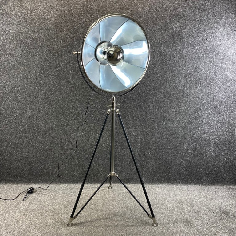 The lamp features a large reflective nickel-finish shade mounted on sleek black tripod legs, blending vintage character with modern sophistication. Its adjustable head allows you to direct light where it’s needed, making it both a striking feature piece and a practical lighting solution.