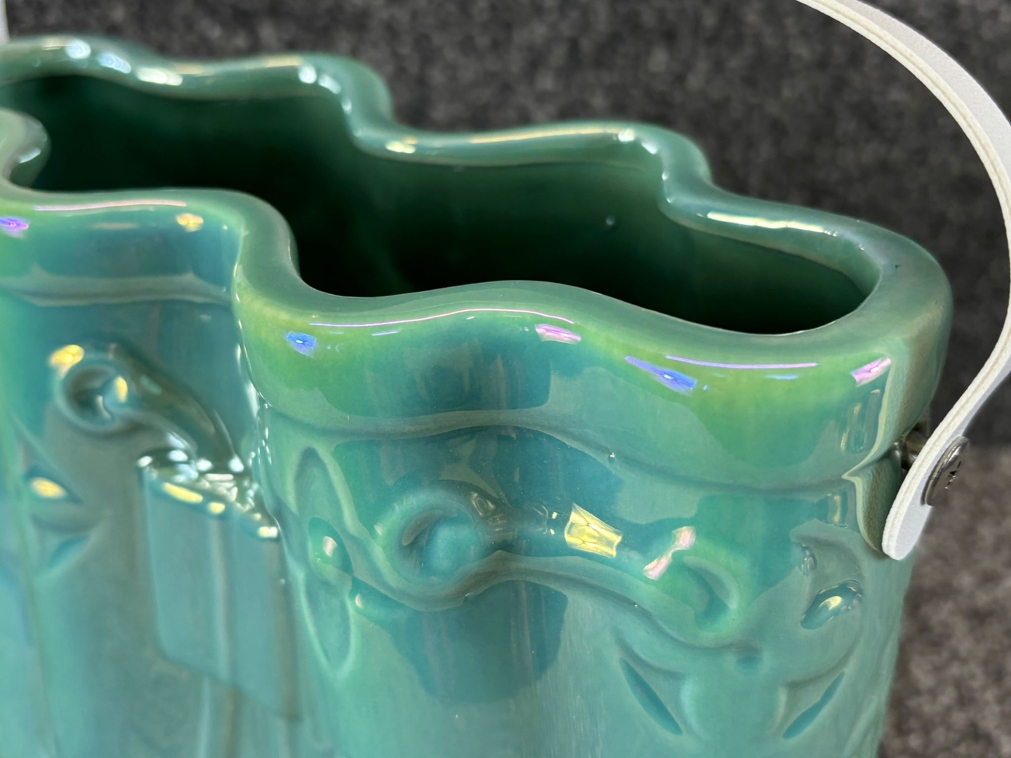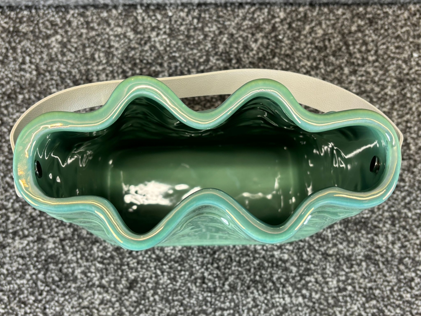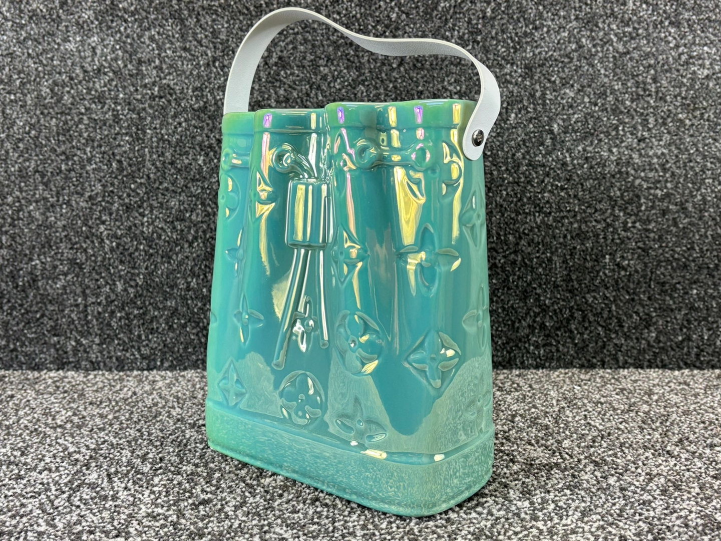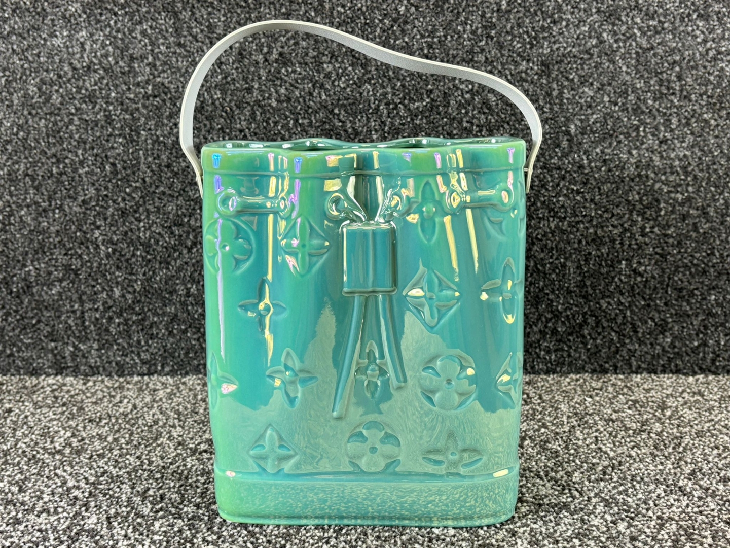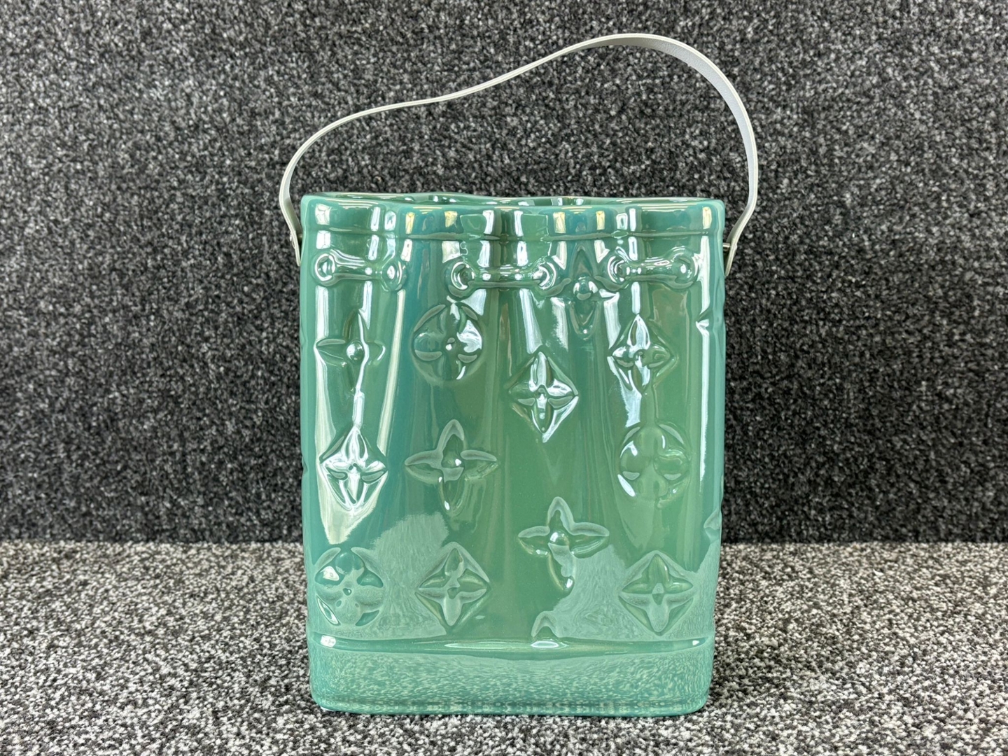 - > Large Green Ceramic Handbag Vase with White Handle